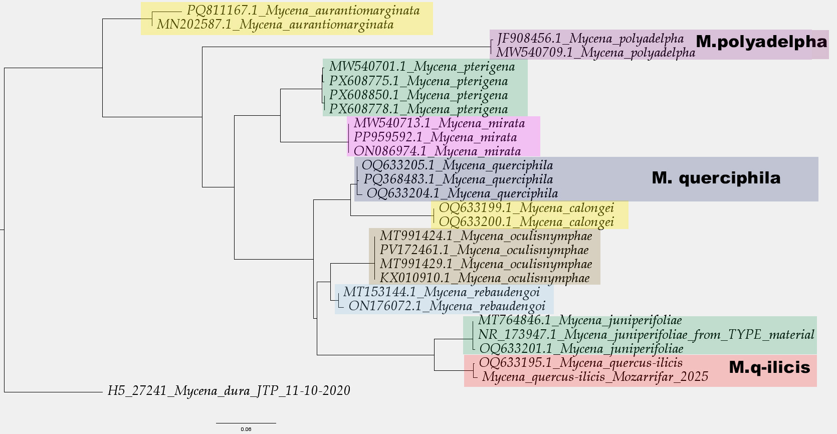 Para terminar añado el árbol filogenético, que he elaborado con las Mycenas más parecidas a mi propuesta, remarcando las parecidas Mycena polyadelpha y la Mycena querciphila:
