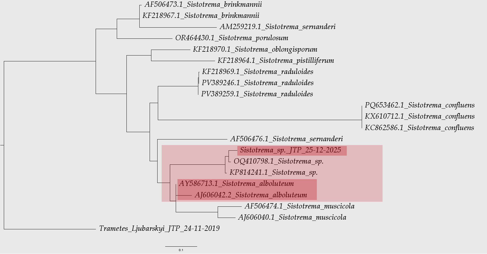 En el árbol, vemos a mi especie alineada con dos secuencias de Sistotrema sp., que a día de hoy siguen sin apellido, pero vemos como especie más cercana al Sistotrema alboluteum, queda pues como lo más parecido tanto a nivel microscópico como a nivel molecular, que podemos encontrar ahora, es decir Sistotrema aff. alboluteum.