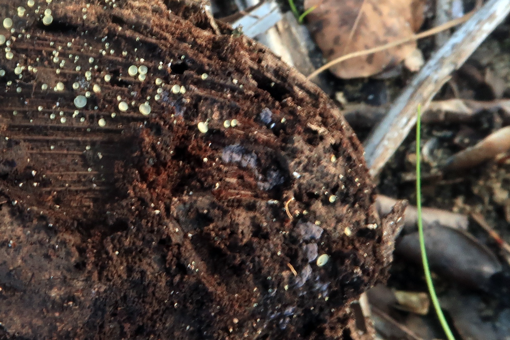 Una Tomentella localizada el 2 de marzo pasado, apareciendo sobre el escobajo de una cáscara de coco en las inmediaciones de Playa Esmeralda, compartiendo espacio con unos ejemplares de Hyalorbilia aún sin determinar.