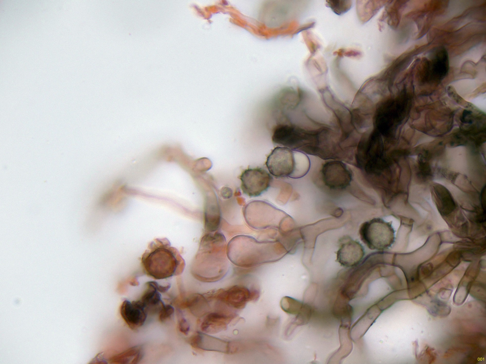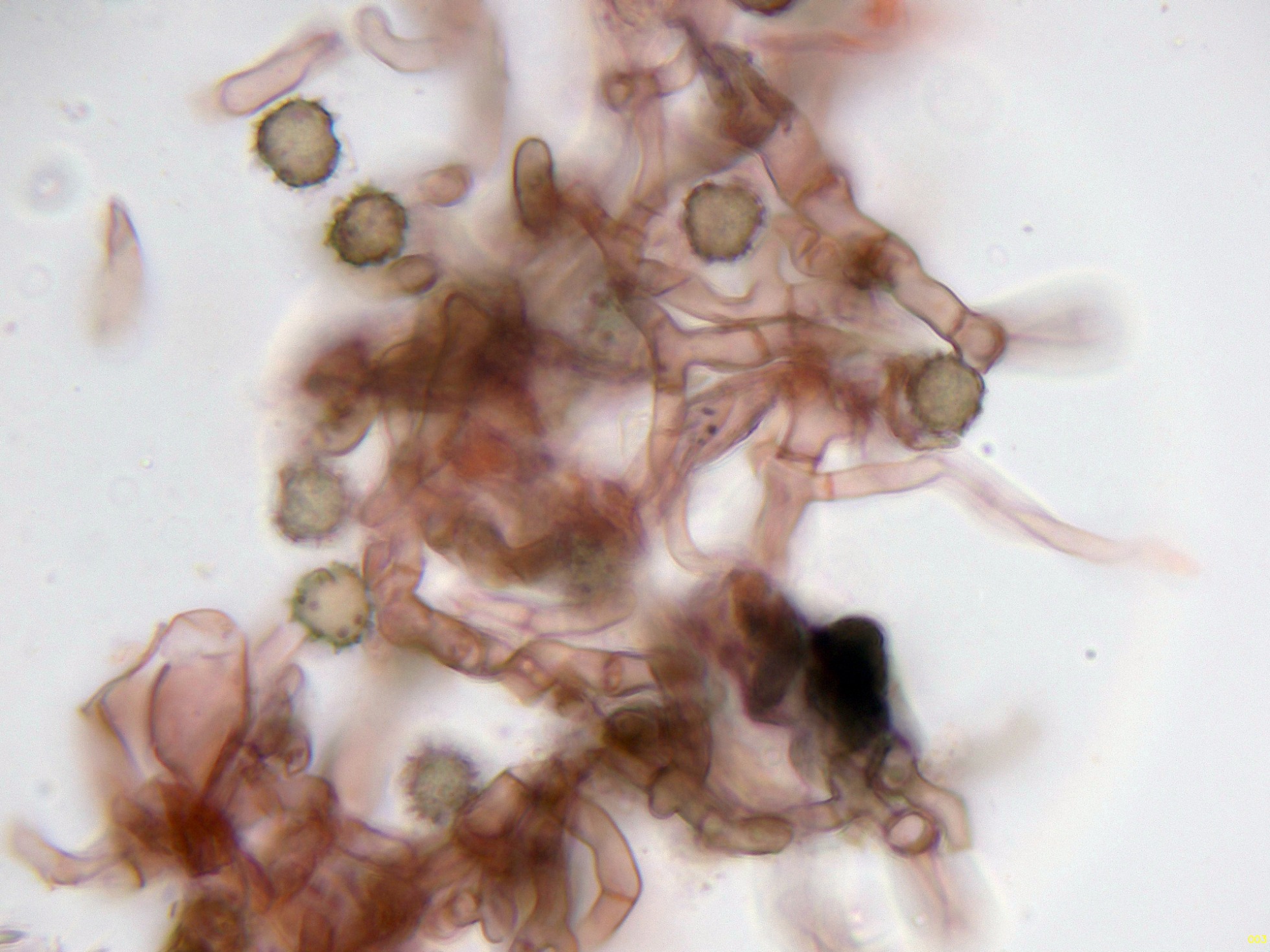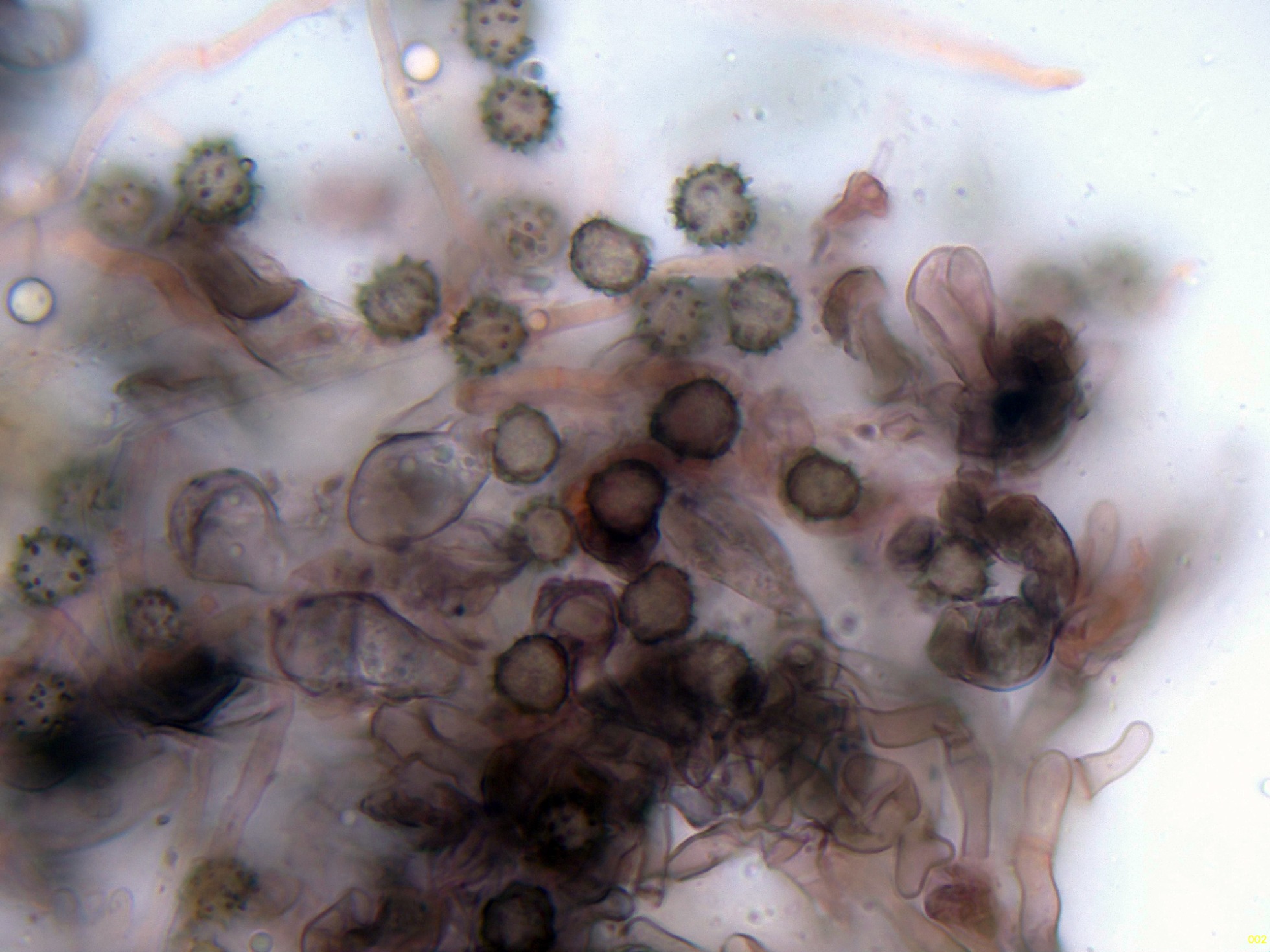 Hifas subiculares de 5–7 μm de diámetro, sujetas, pero también con numerosos septos simples, con paredes hifales engrosadas, de color marrón amarillento pálido, sin incrustaciones. Rizomorfos de hasta 60 μm de diámetro, que consisten en (1) hifas de paredes gruesas con abrazaderas y un diámetro de hasta 6 μm, (2) hifas de paredes gruesas, de color marrón, sin abrazaderas y un diámetro de hasta 5 μm, y (3) hifas esqueléticas sin septos, de hasta 2,5 μm de diámetro. Hifas subhiménicas de hialinas a marrón, regulares, de 5–7,5 μm de diámetro, sujetas, de paredes delgadas a ligeramente gruesas. Basidios cilíndricos a ligeramente urniformes, hialinos, de 50–60 × 7–8 μm, unidos en la base, 4 esterigmas, esterigmas de hasta 10 μm de largo; basidiosporas marrón pálido, frontalmente globosas a subglobosas, lateralmente subglobosas (8)9–10(11) × 8–9,5 μm, (n=42), equinuladas, con espinas de hasta 1,5–2 μm.