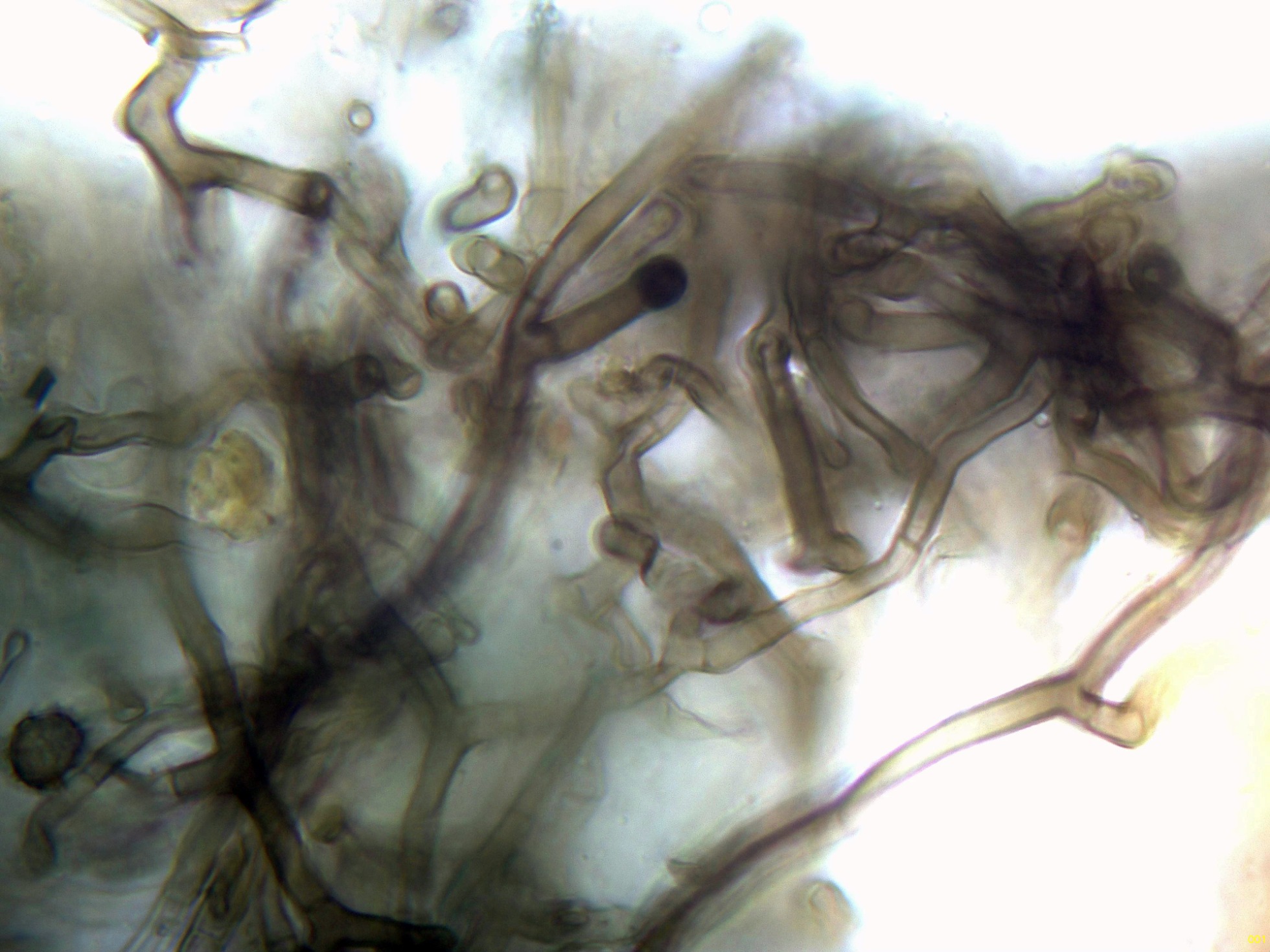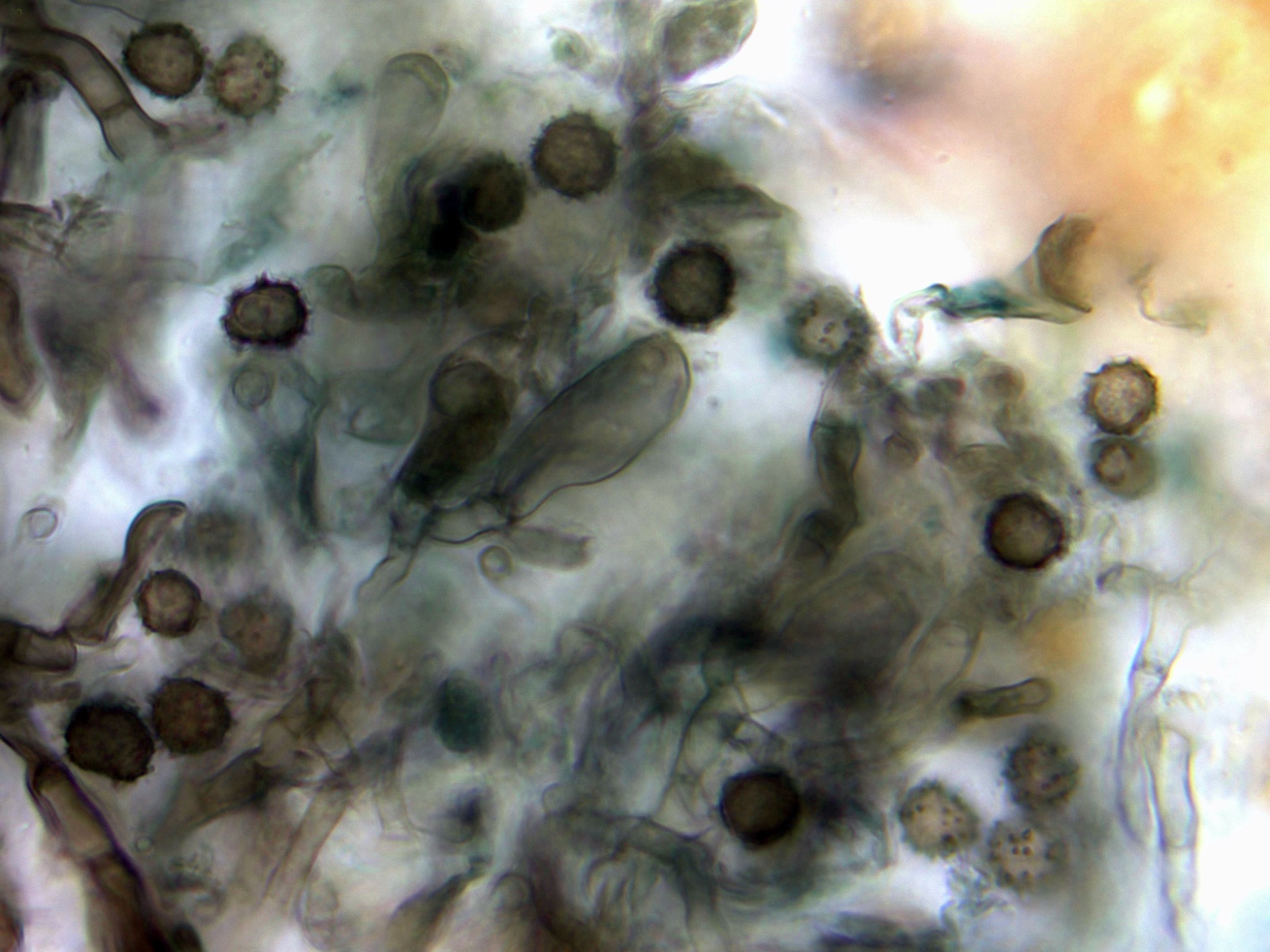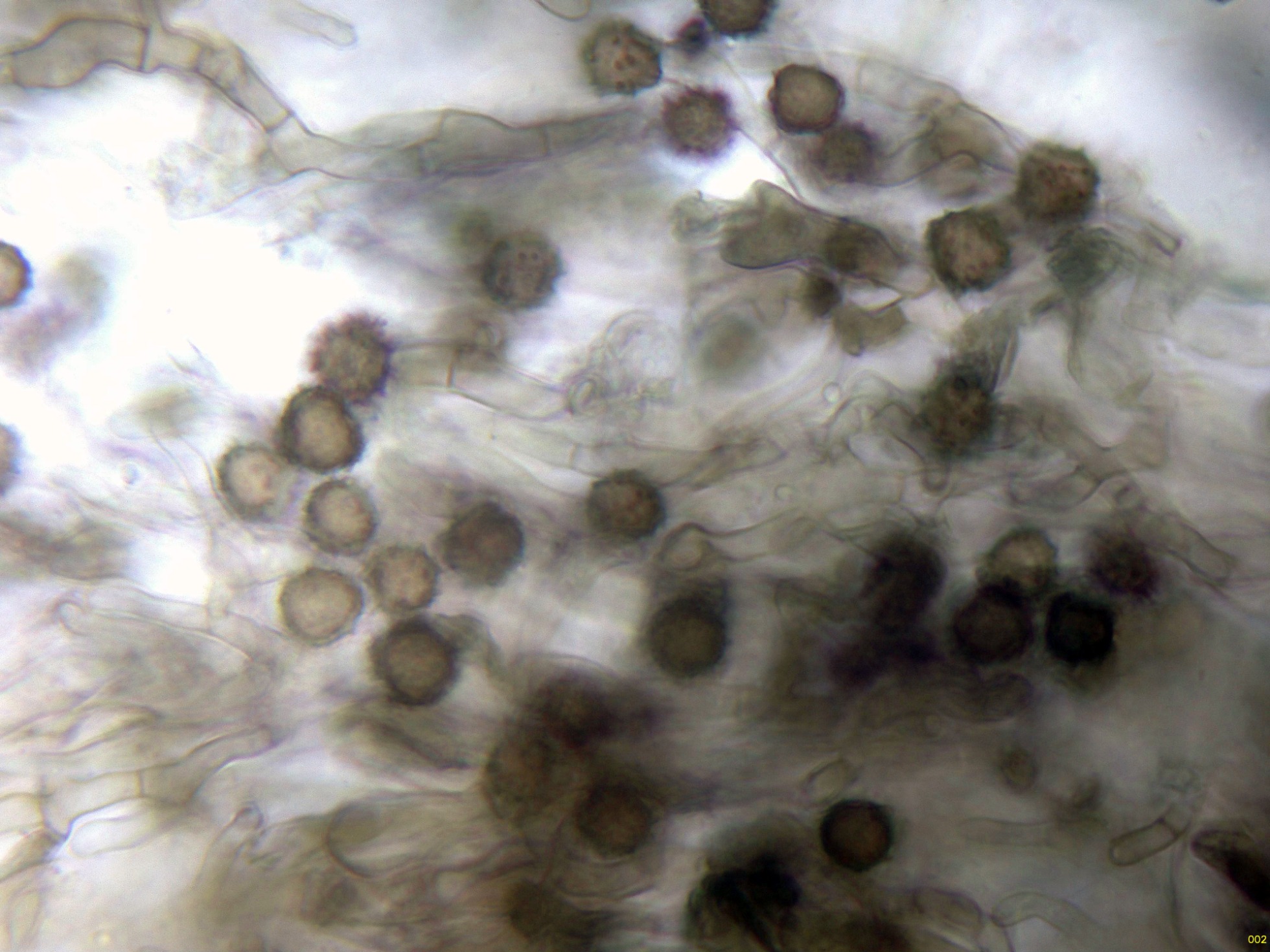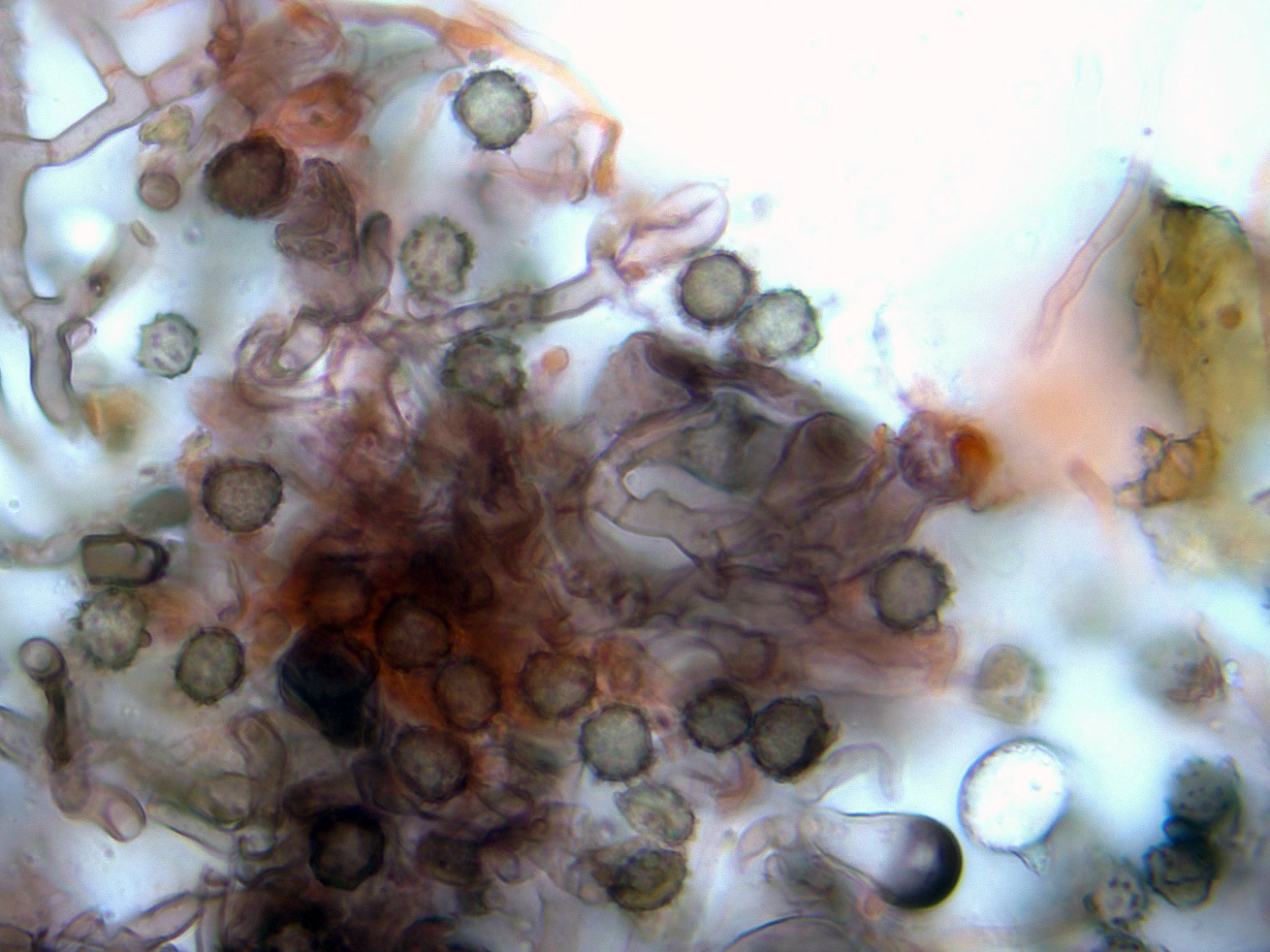 Hifas subiculares de 5–7 μm de diámetro, sujetas, pero también con numerosos septos simples, con paredes hifales engrosadas, de color marrón amarillento pálido, sin incrustaciones. Rizomorfos de hasta 60 μm de diámetro, que consisten en (1) hifas de paredes gruesas con abrazaderas y un diámetro de hasta 6 μm, (2) hifas de paredes gruesas, de color marrón, sin abrazaderas y un diámetro de hasta 5 μm, y (3) hifas esqueléticas sin septos, de hasta 2,5 μm de diámetro. Hifas subhiménicas de hialinas a marrón, regulares, de 5–7,5 μm de diámetro, sujetas, de paredes delgadas a ligeramente gruesas. Basidios cilíndricos a ligeramente urniformes, hialinos, de 50–60 × 7–8 μm, unidos en la base, 4 esterigmas, esterigmas de hasta 10 μm de largo; basidiosporas marrón pálido, frontalmente globosas a subglobosas, lateralmente subglobosas (8)9–10(11) × 8–9,5 μm, (n=42), equinuladas, con espinas de hasta 1,5–2 μm.
