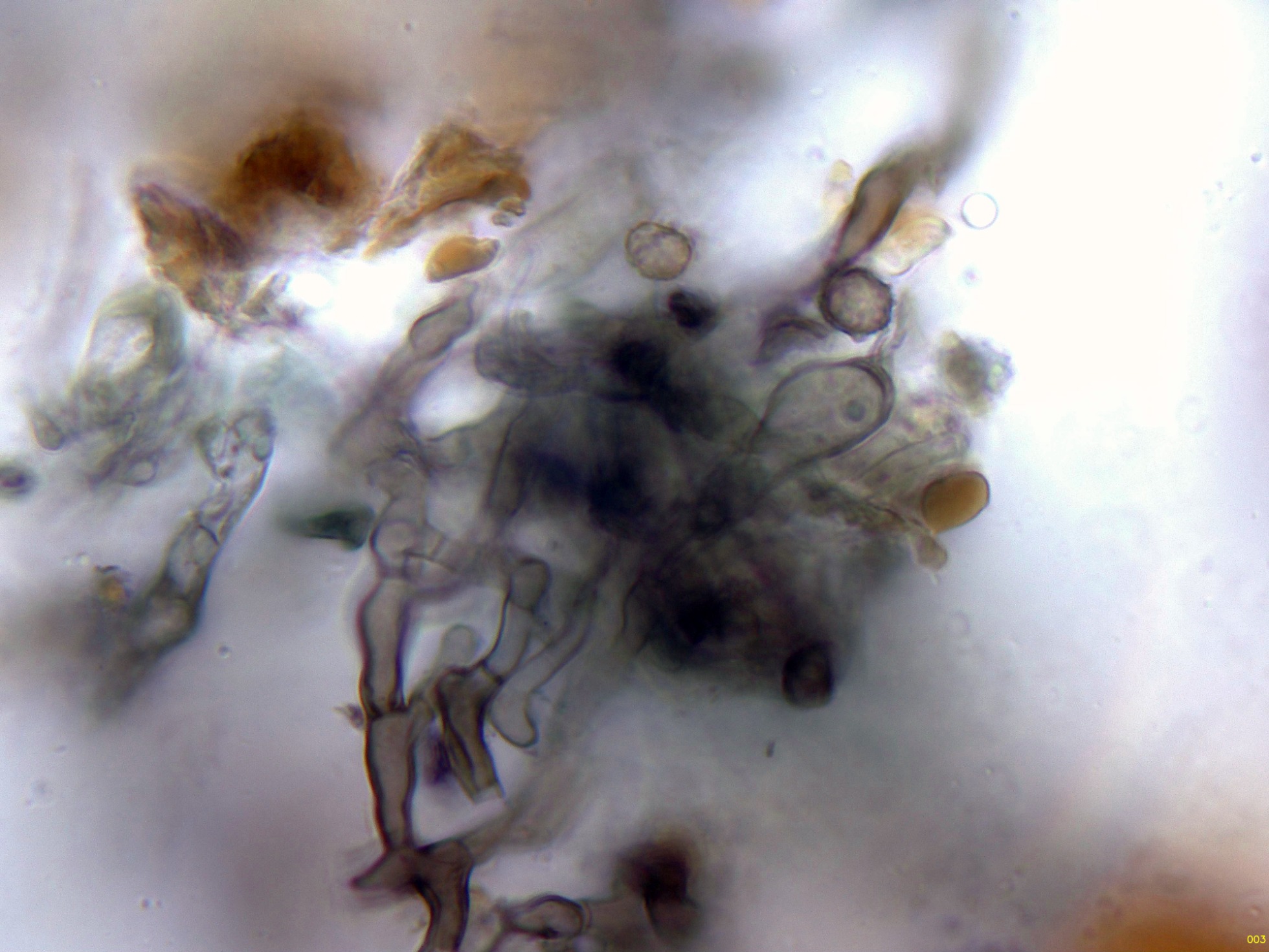 Atendiendo a las Claves de que disponemos para Tomentellas Europeas, con hifas subiculares sin fíbulas, solo tenemos la Tomentella badia y la Tomentella brunneofirma, ambas especies las conozco perfectamente y no se corresponden con los datos microscópicos obtenidos, buscando información me encuentro con un documento de 2010, acerca de Tomentellas cercanas a la Tomentella alpina, con el título de "Tomentella alpina and other tomentelloid taxa fruiting in a glacier valley", en el que se describe una Tomentella mayoritariamente con hifas subiculares sin fíbulas, con una microscopía bastante parecida a mi propuesta, dejo la descripción de la misma del documento: