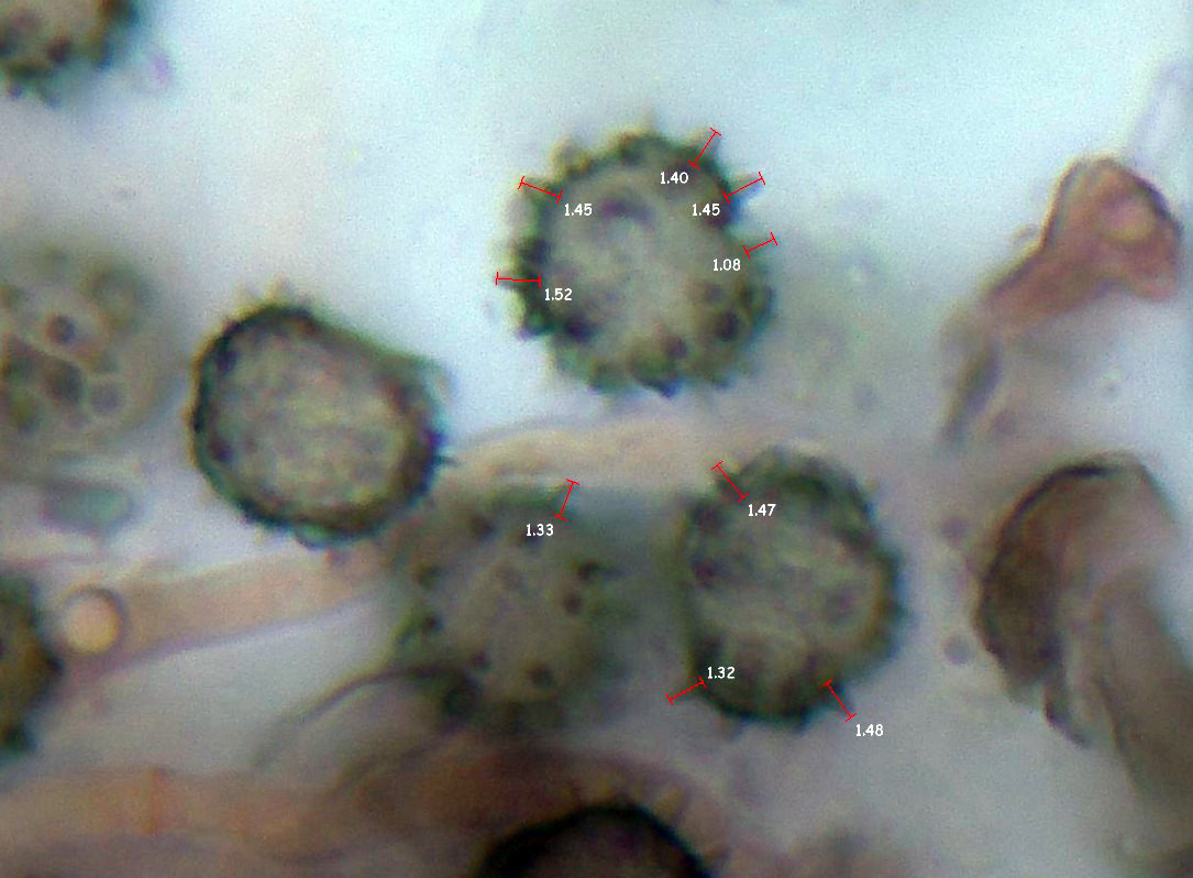 Estas esporas libres con unas medidas sin contar la ornamentación de: