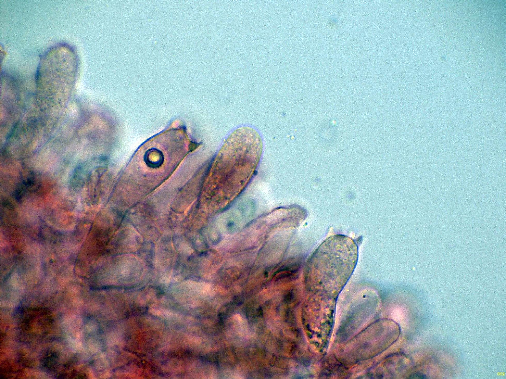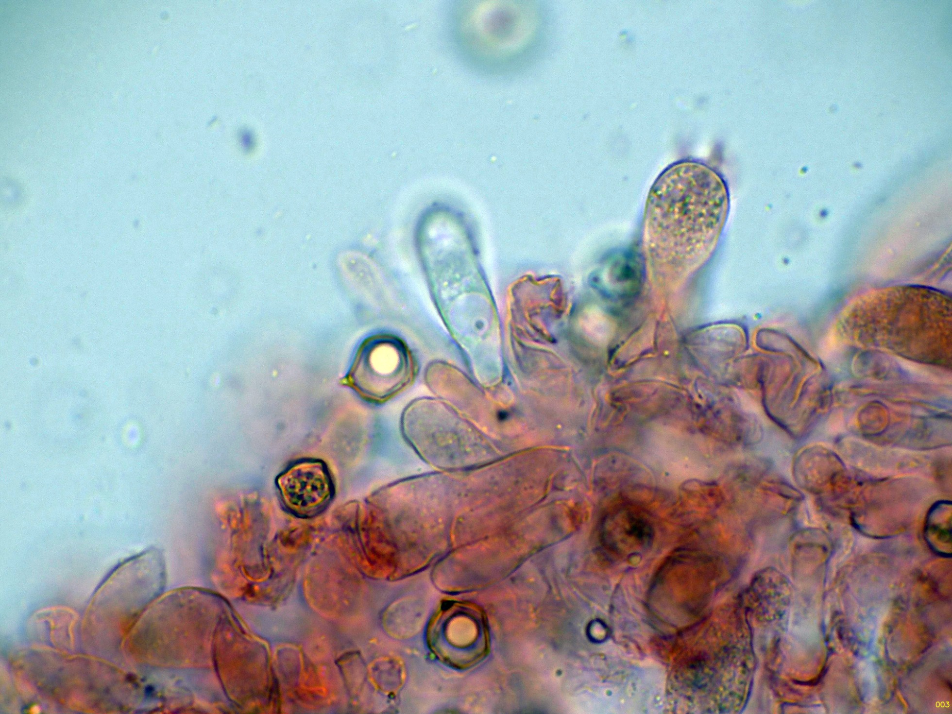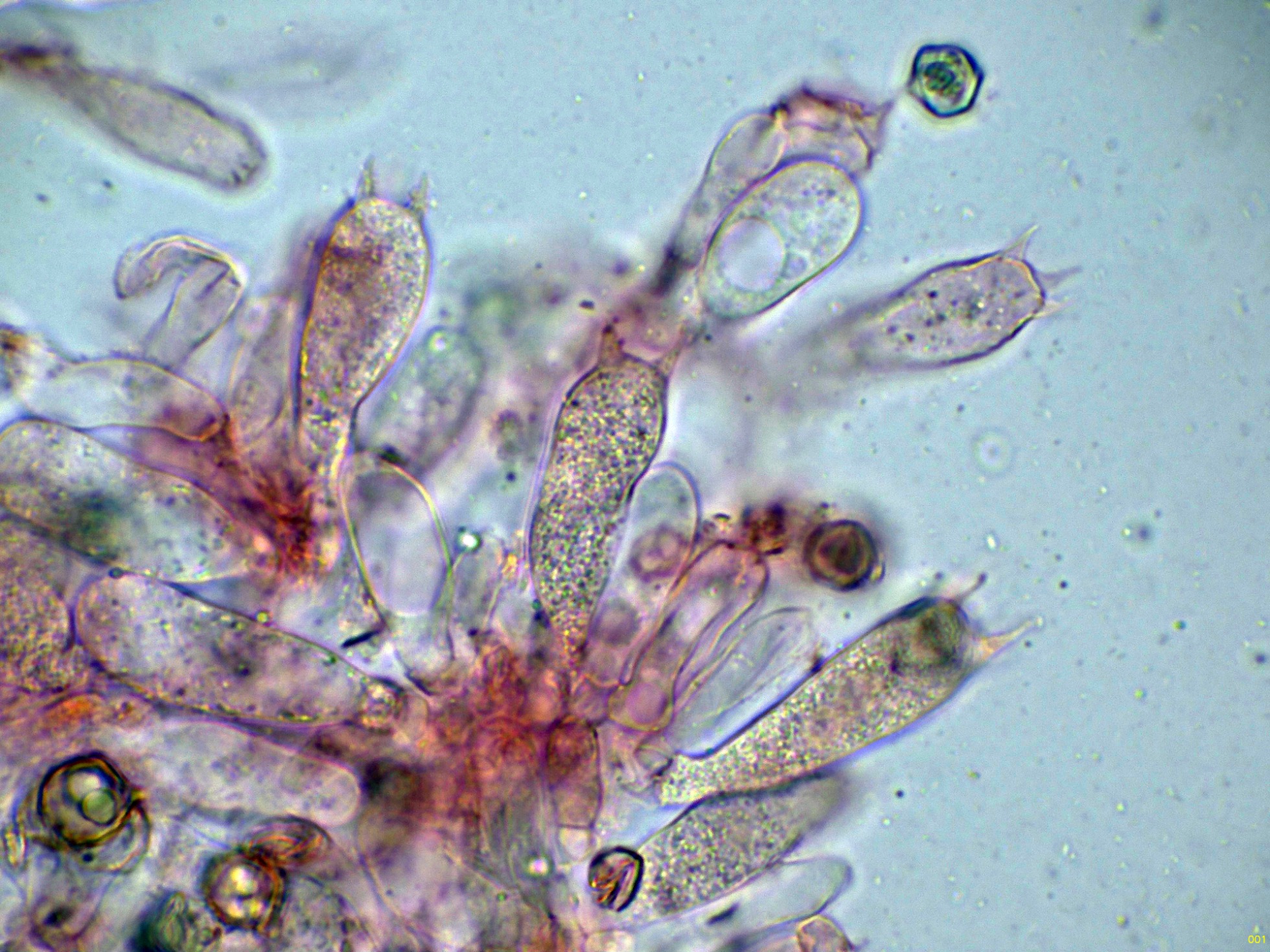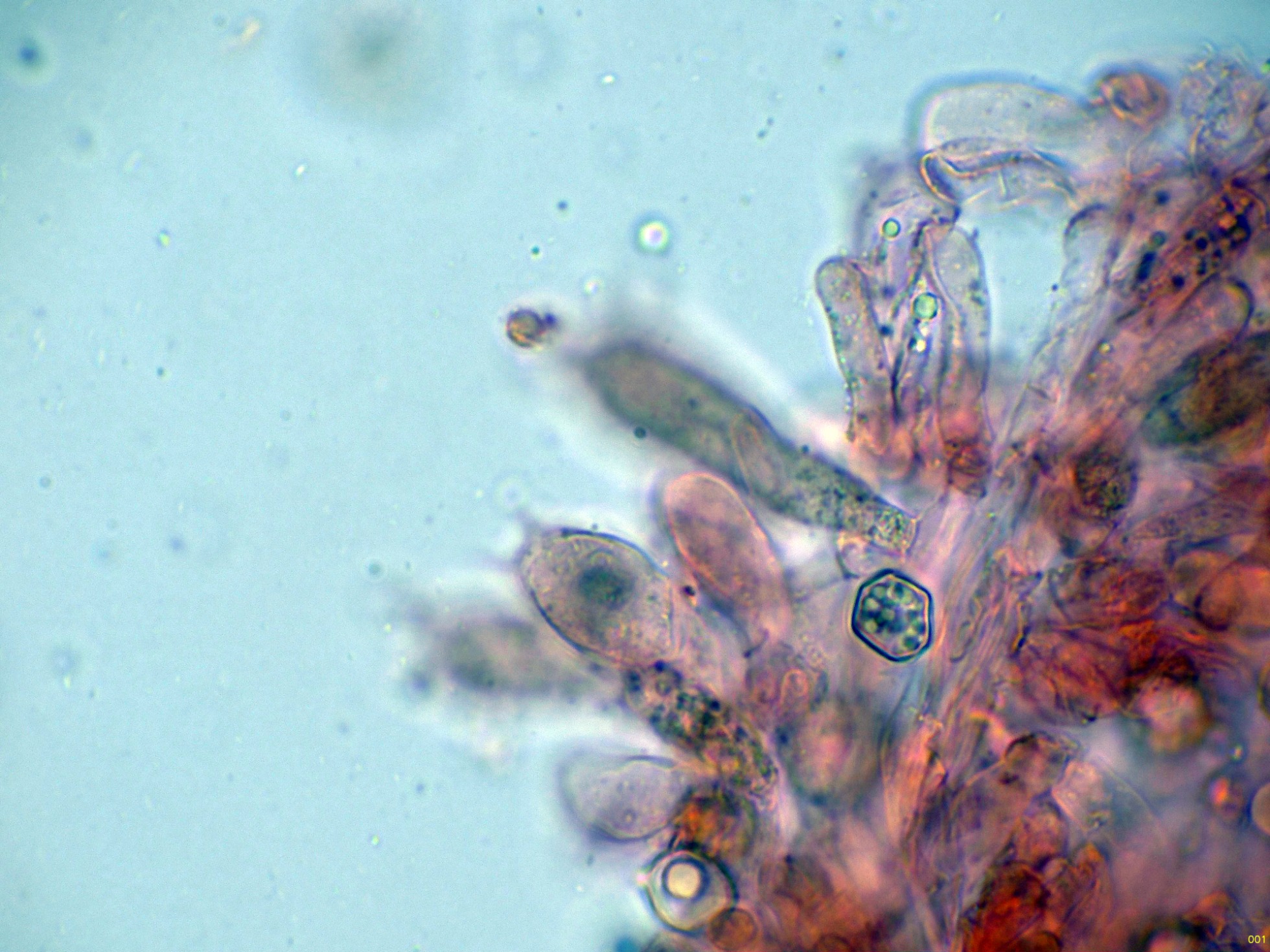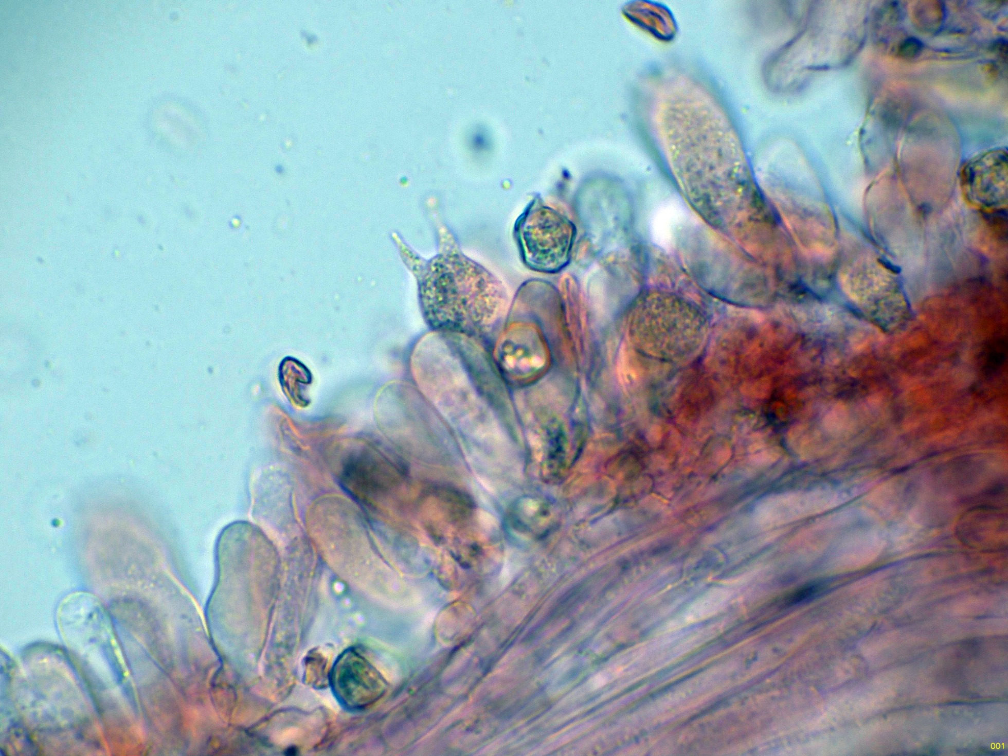 Los basidios de la cara laminar, con unas medidas de (32) 34.5 - 38.7 (40.7) × (10.7) 11 - 12.5 (12.8) µm.: