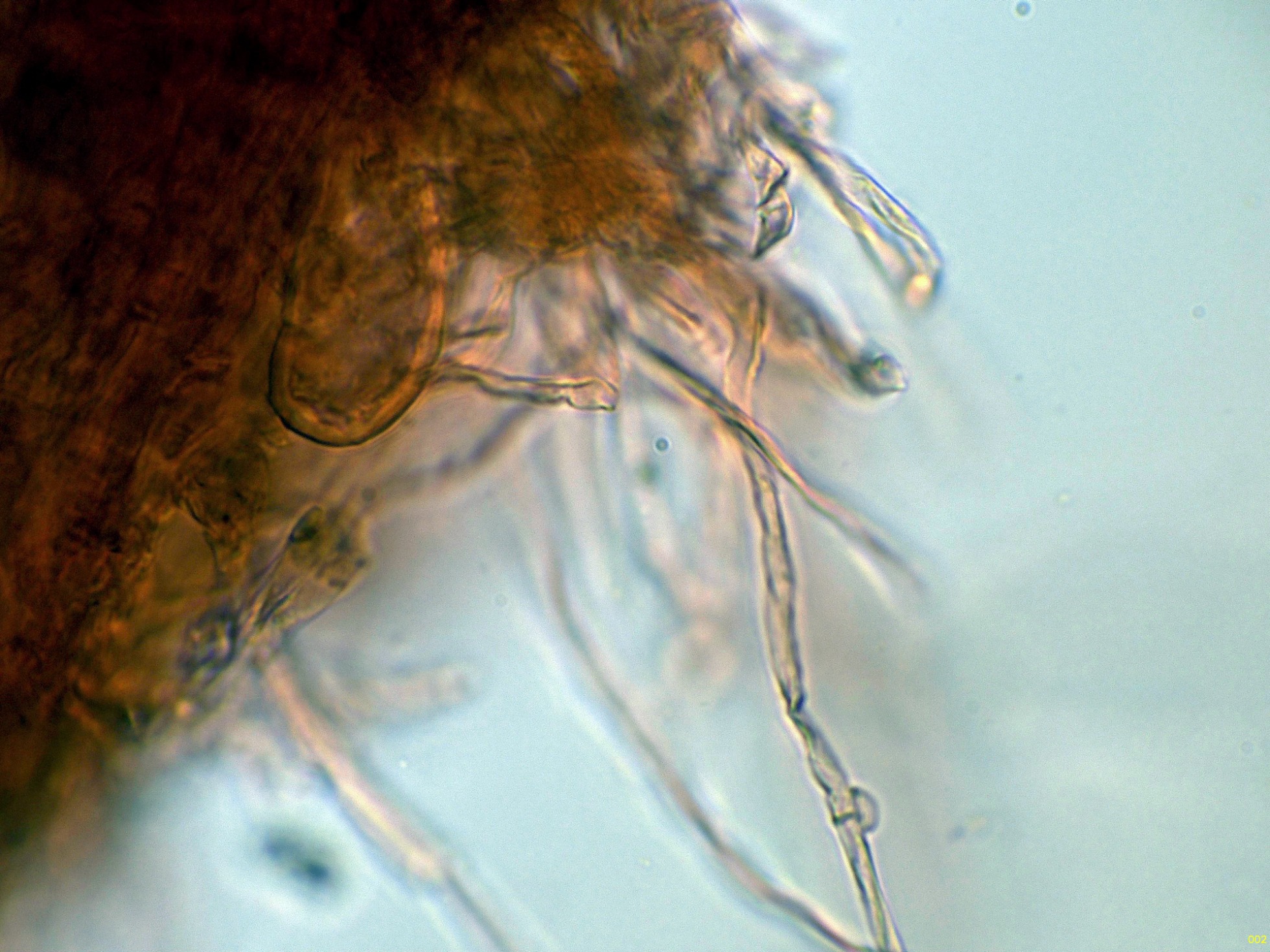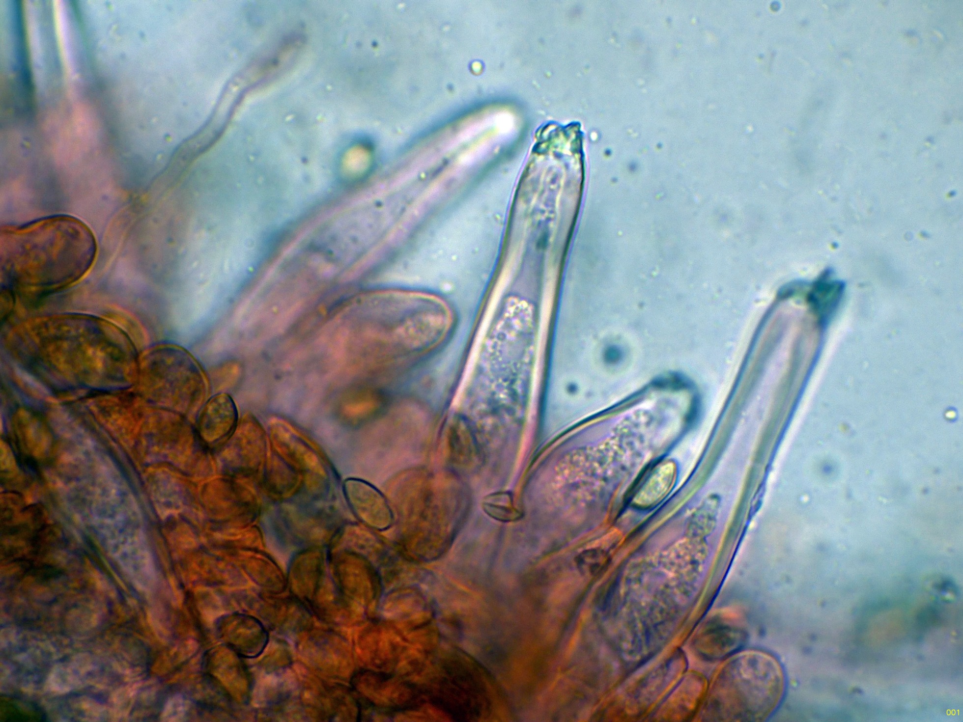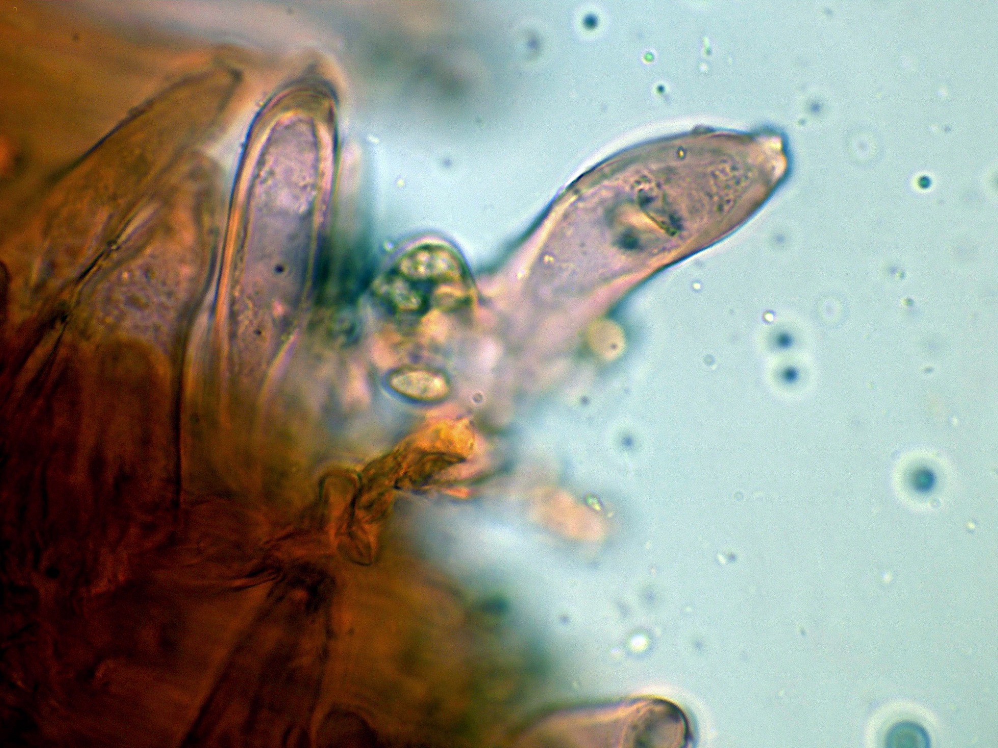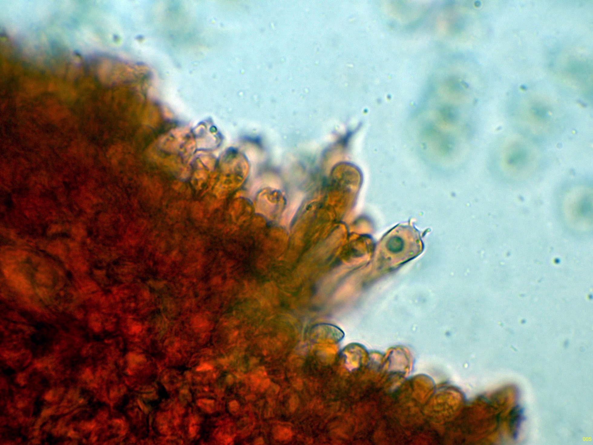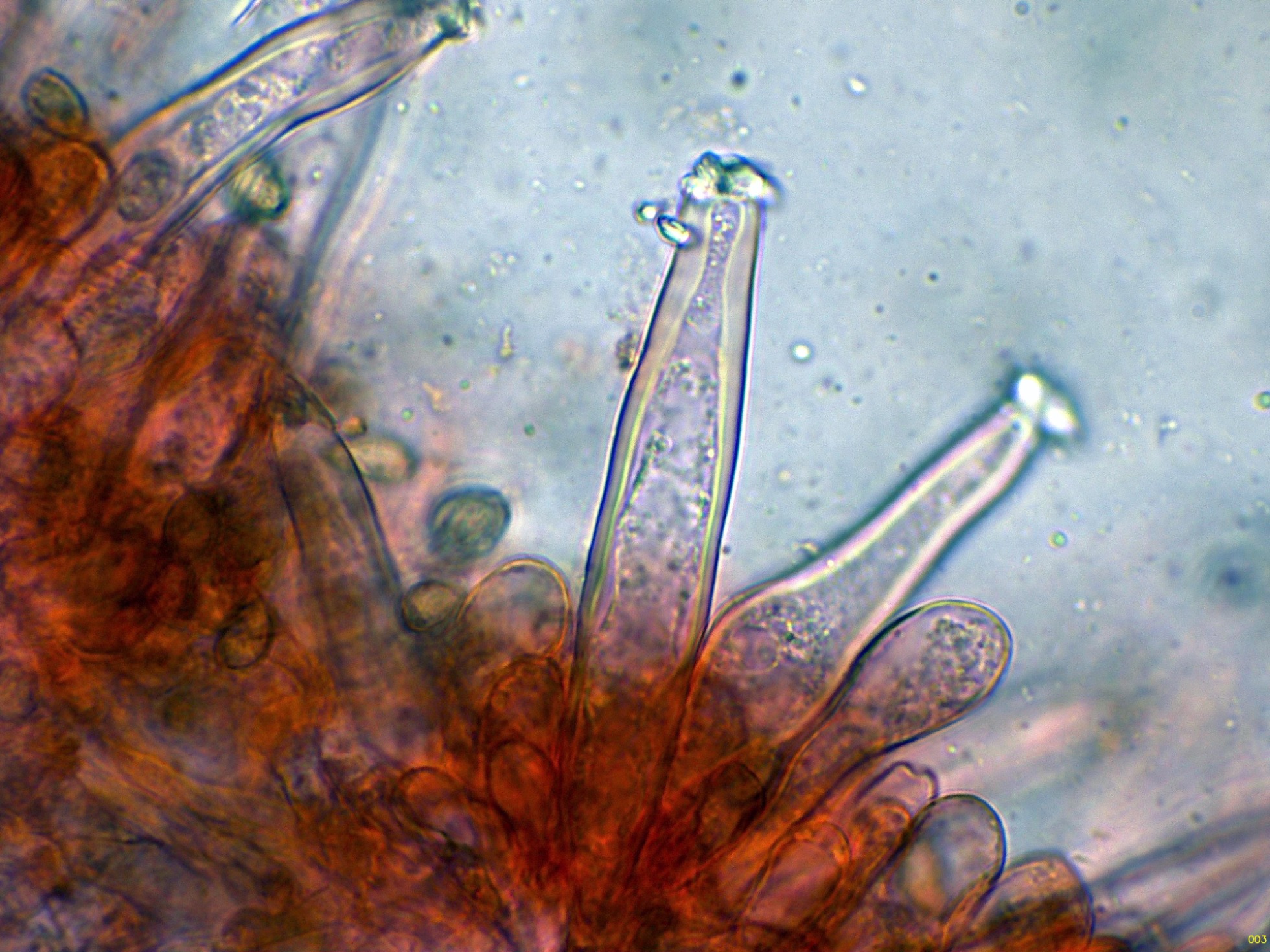 Caulocistidios ya más dispersos y mas bien escasos en la parte media del pie: