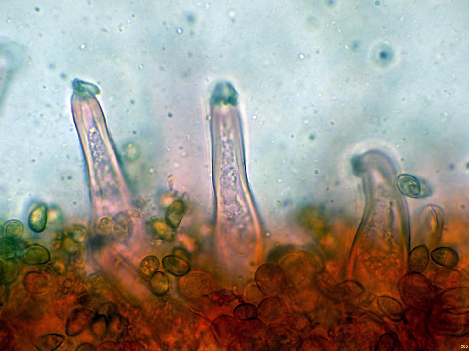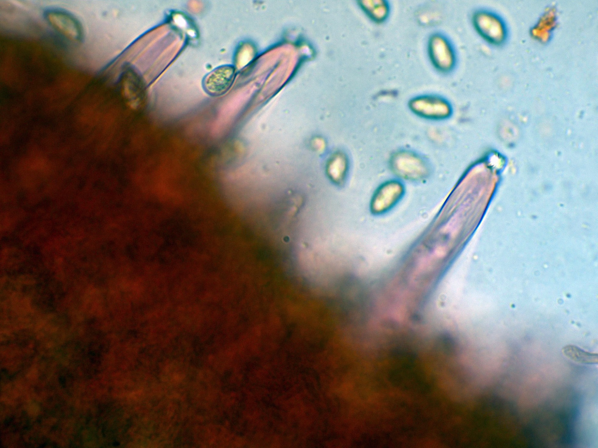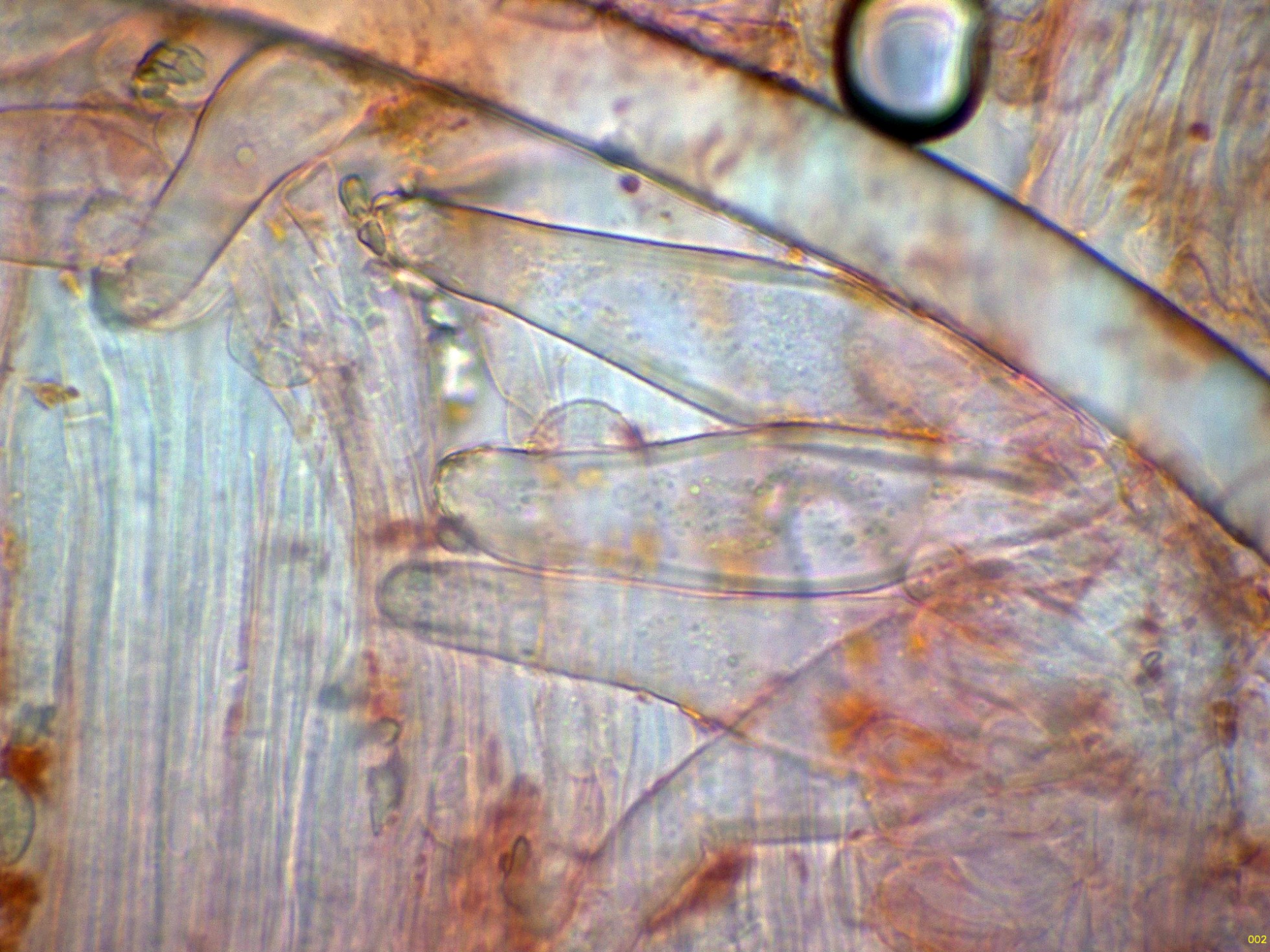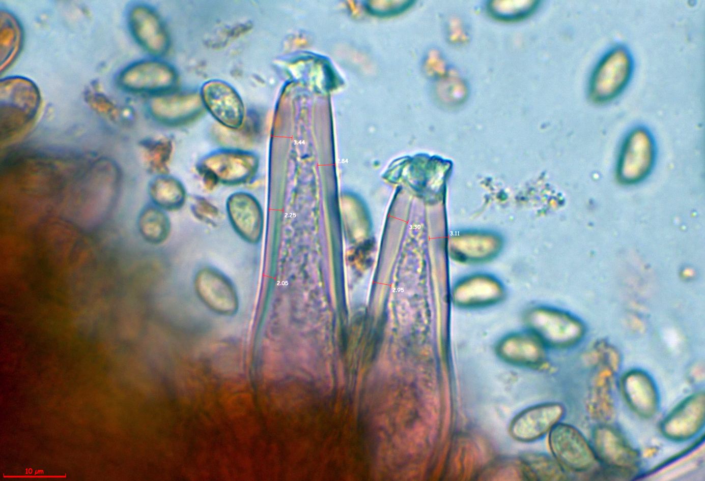 Queilocistidios abundantes en la arista laminar, con unas medidas de (62.9) 72.1 - 82.9 (87.6) × (12.6) 14.4 - 17.4 (18.3) µm., Me = 76.9 × 15.6 µm.