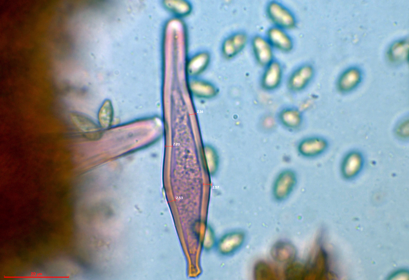 Pleurocistidios dispersos por la cara laminar, con unas medidas de 66.5 - 81.08 (81.1) × (12.9) 12.94 - 15 µm., Me = 73.6 × 14.1 µm.