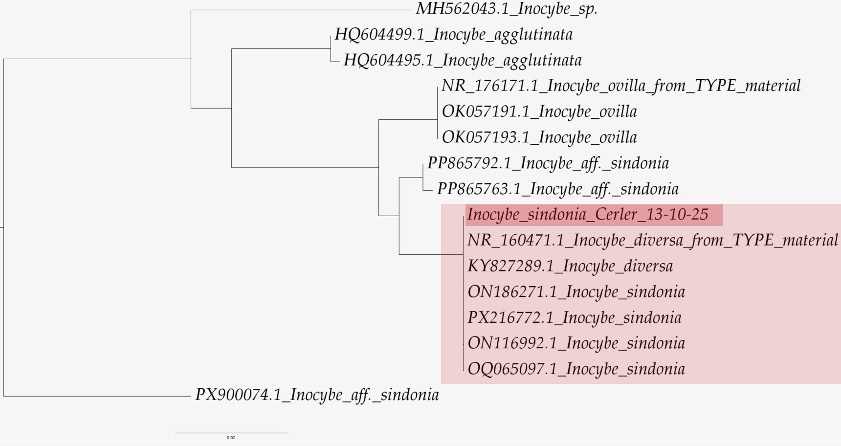 En el árbol podemos observar un par de secuencias de la Inocybe diversa, inclusive la secuencia del material tipo, con una coincidencia a nivel molecular superior al 99,85% con mi propuesta, aunque la Inocybe diversa no la puedo ni tan siquiera considerar por varias razones, la primera porqué se trata de una especie endémica de Nueva Zelanda, asociada a géneros como Leptospermum o Kunzea y además según bibliografía con esporas nodulosas, nada que ver con la especie aquí descrita.