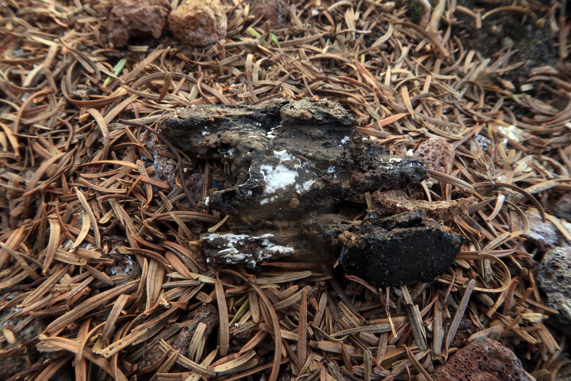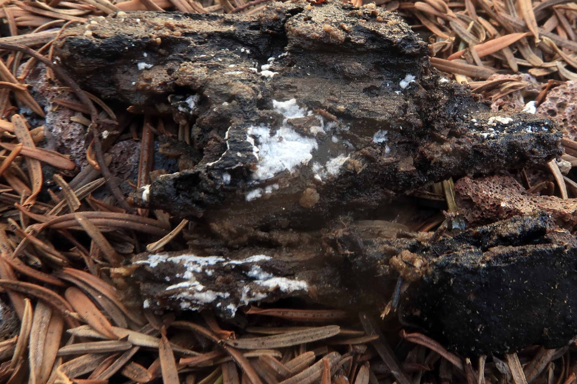 Un aphyllophoral poco común, brotando sobre madera descortezada del suelo en descomposición.