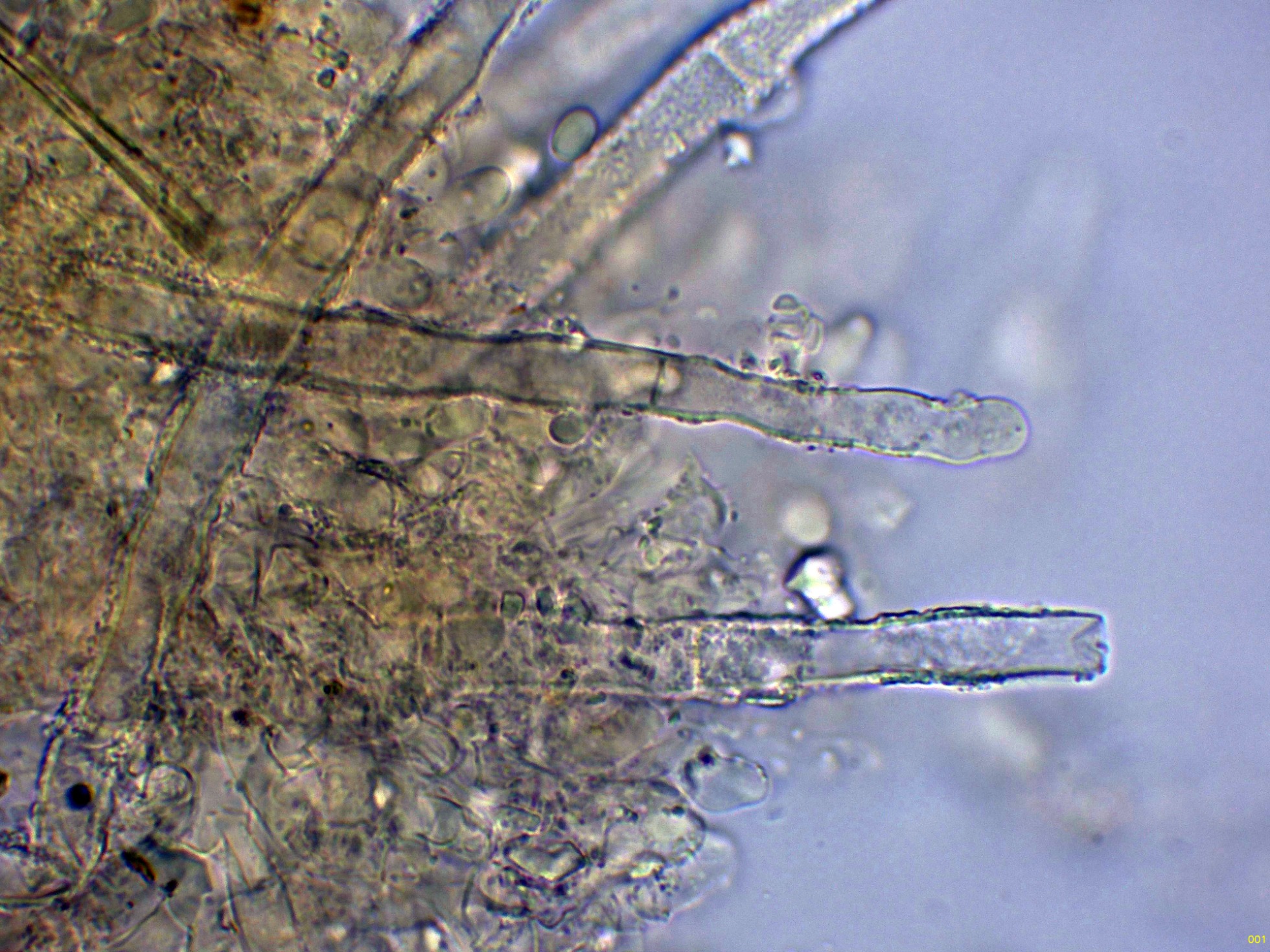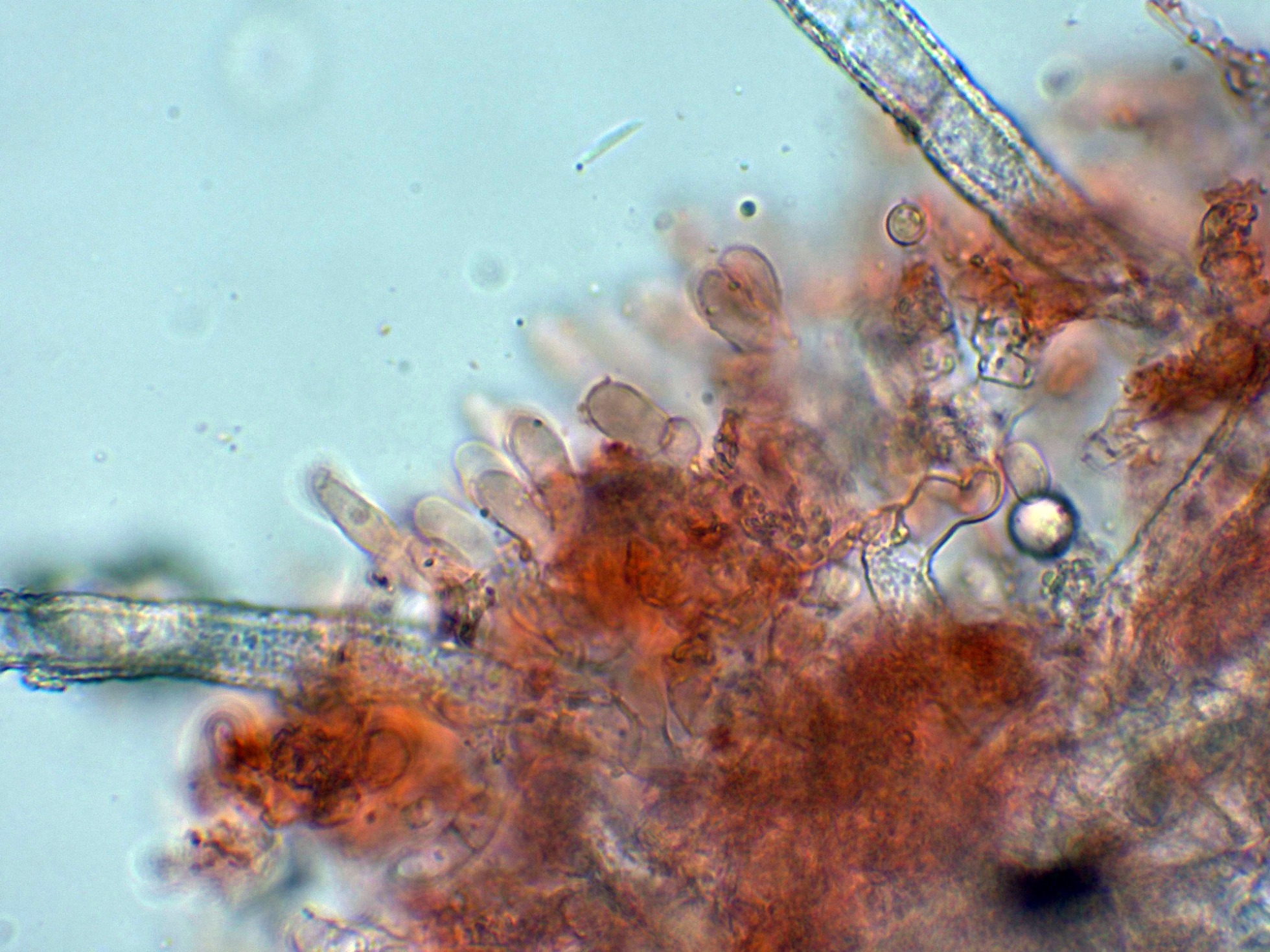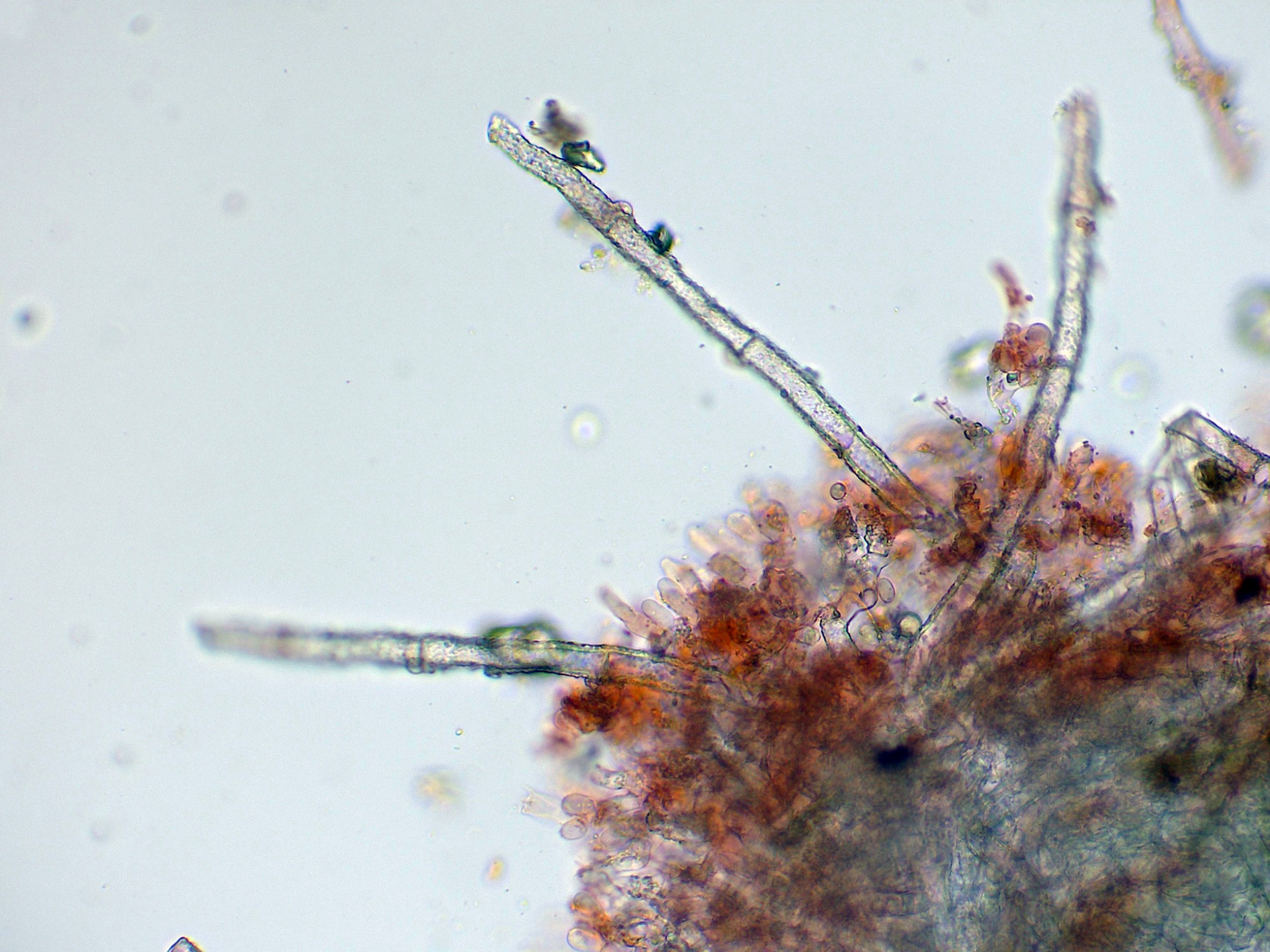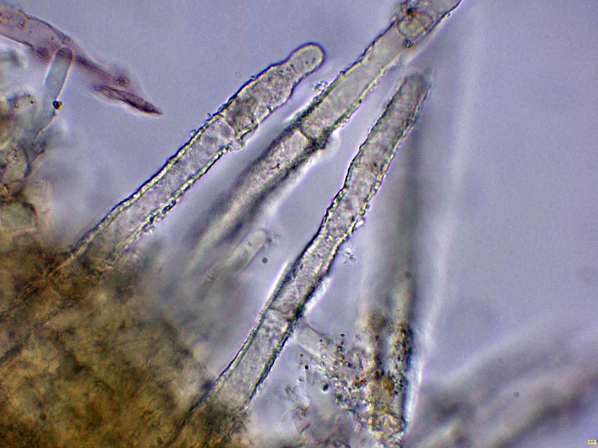 Cistidios septados (septocistidios), con fíbulas y abundantes cristalizaciones por toda su superficie: