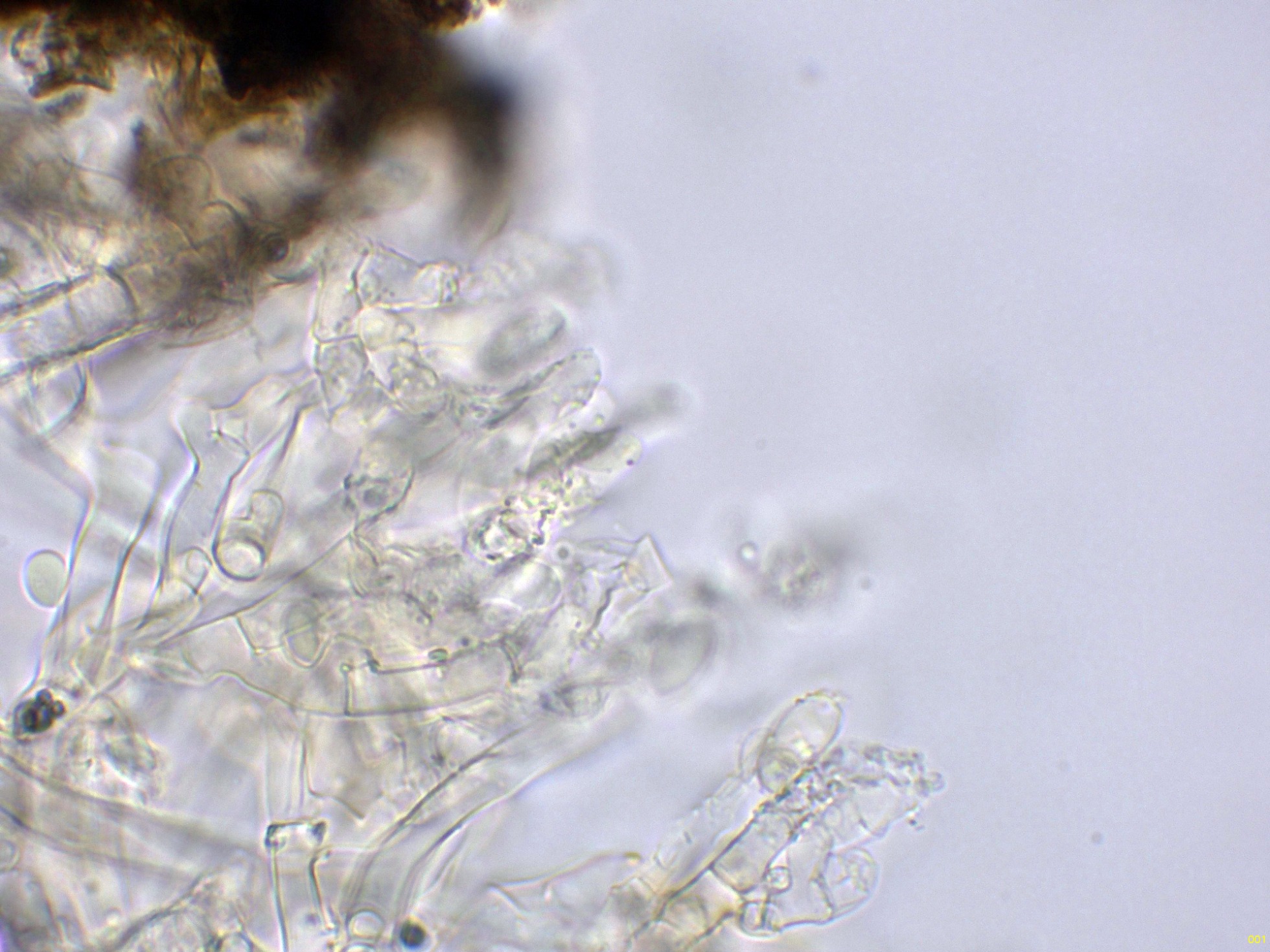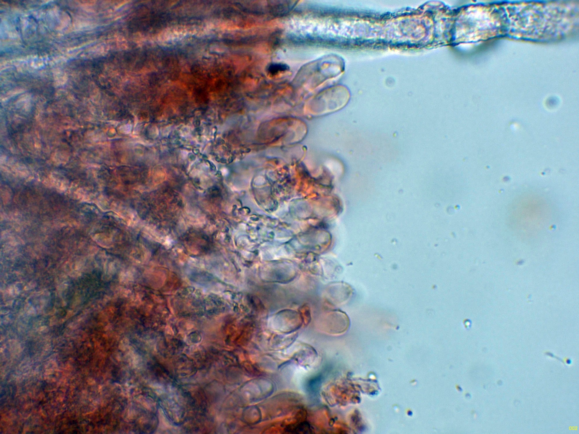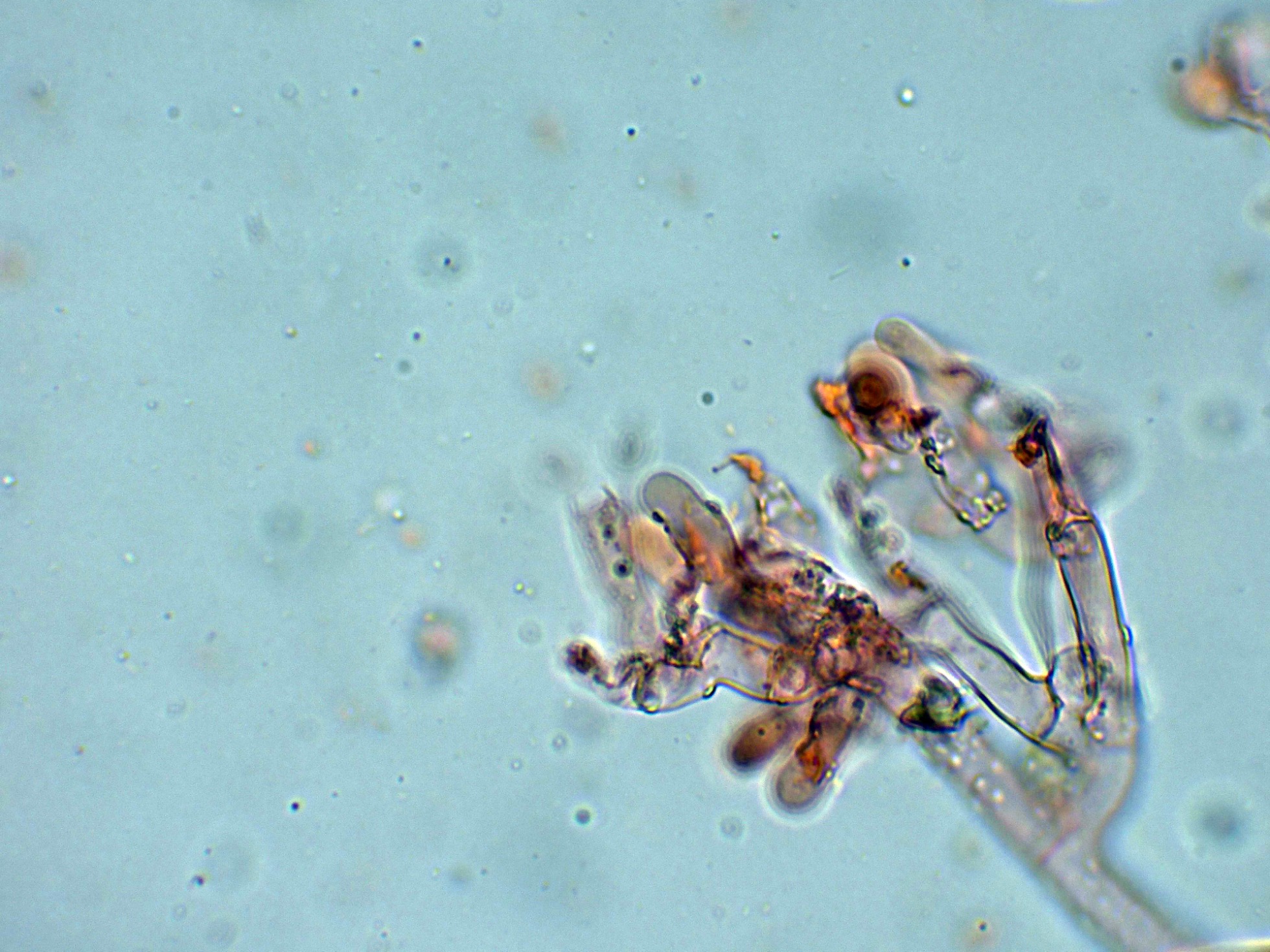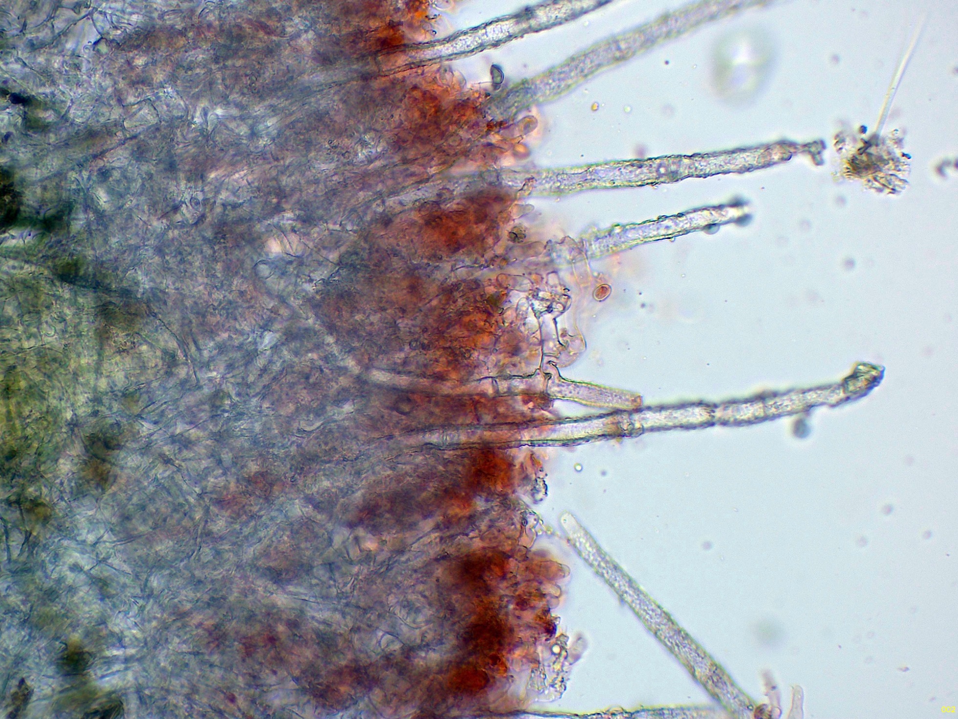 Cistidios septados (septocistidios), con fíbulas y abundantes cristalizaciones por toda su superficie: