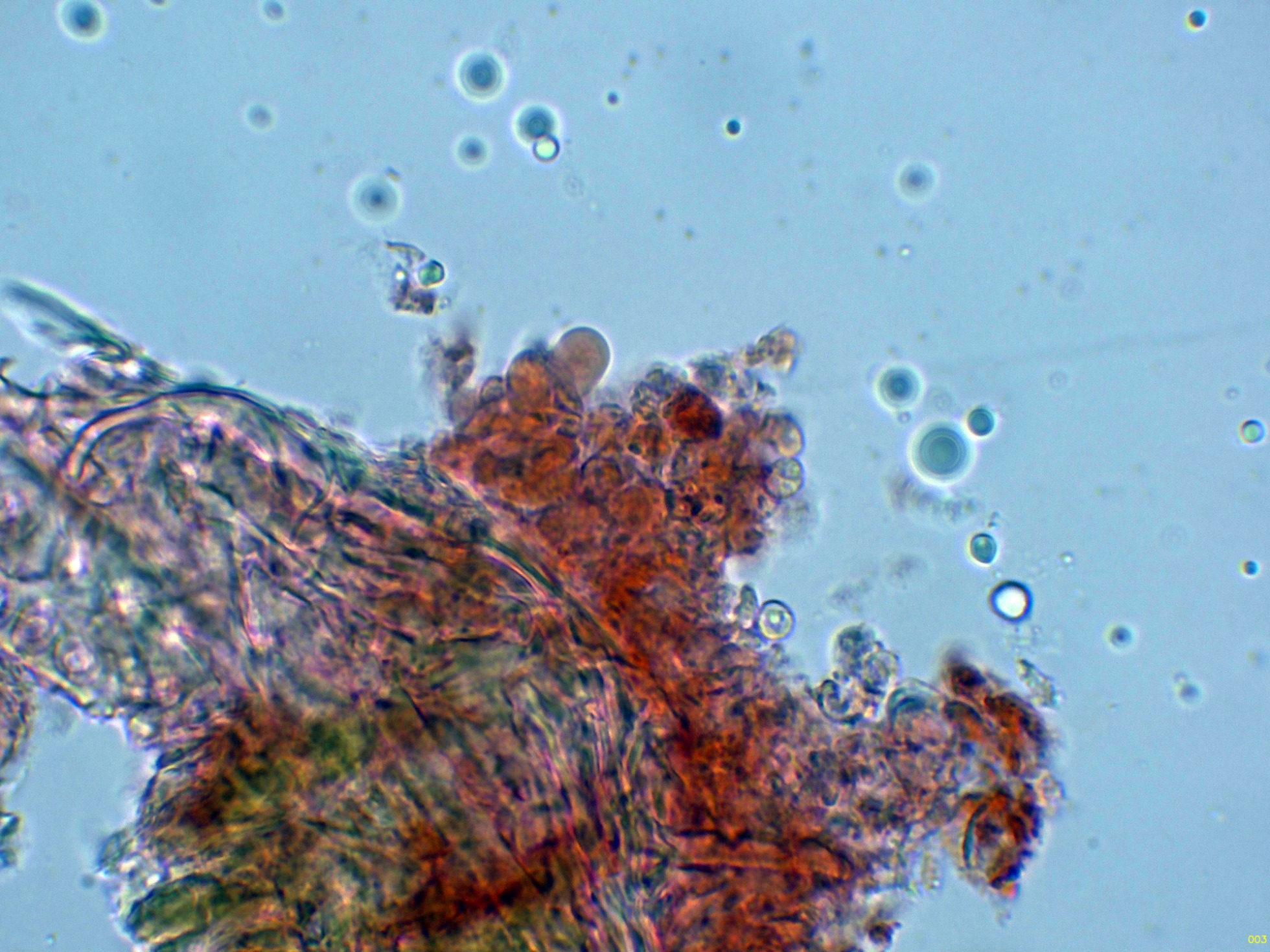 En el himenio observadas unas hifas ramificadas que sobresalen por encima del nivel de los basidios: