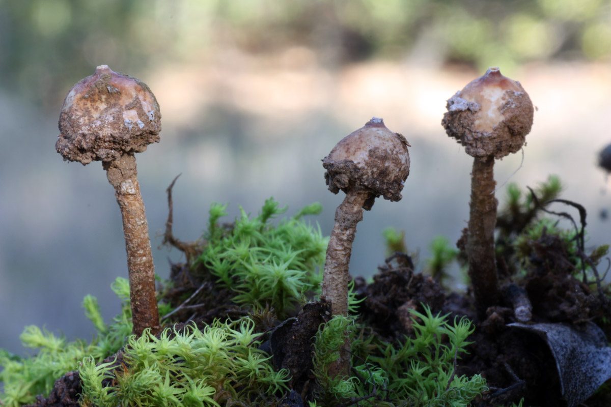 La segunda crecia sobre el musgo, entre matorrales de encinar. En lo alto de la cabeza y la parte baja del pie adquiría un color marrón-rojizo. Tulostoma brumale o fimbriatum?