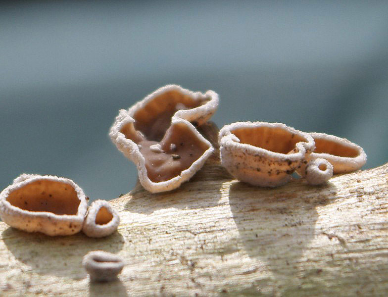 La Schizophyllum-amplum-, tambien sobre madera el carpoforo es Resupinado de ente 0.5y 1 cm. con el interior liso, de color marron claro y el exterior mas claro y piloso
