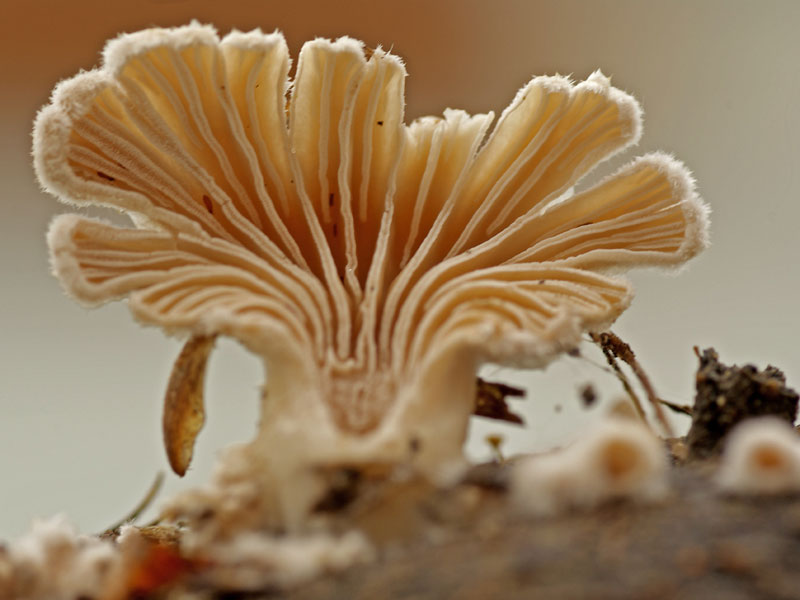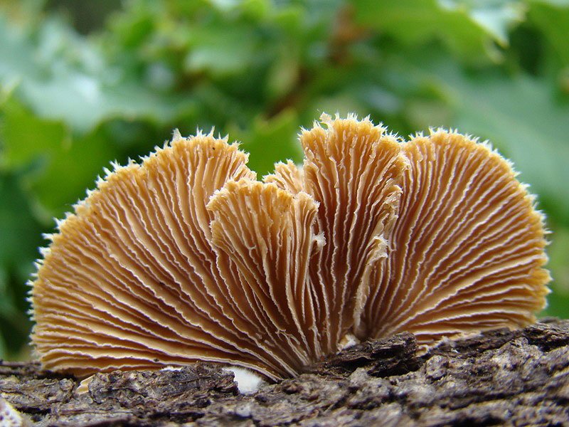 Tambien la Schizophyllum commune es una seta muy conocida y que llama la atención, tanto la parte esterior, bellosa como el himenio con la forma que toma de abanico y sus laminas
