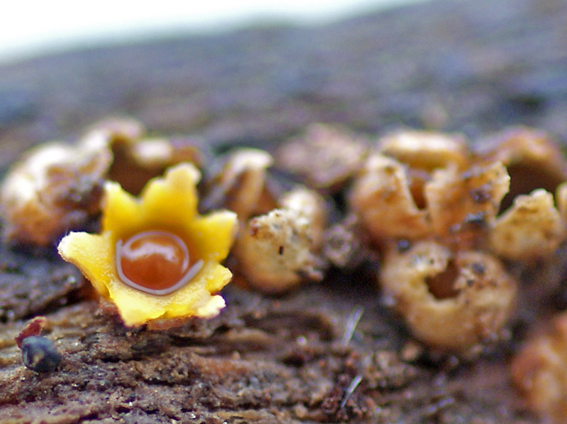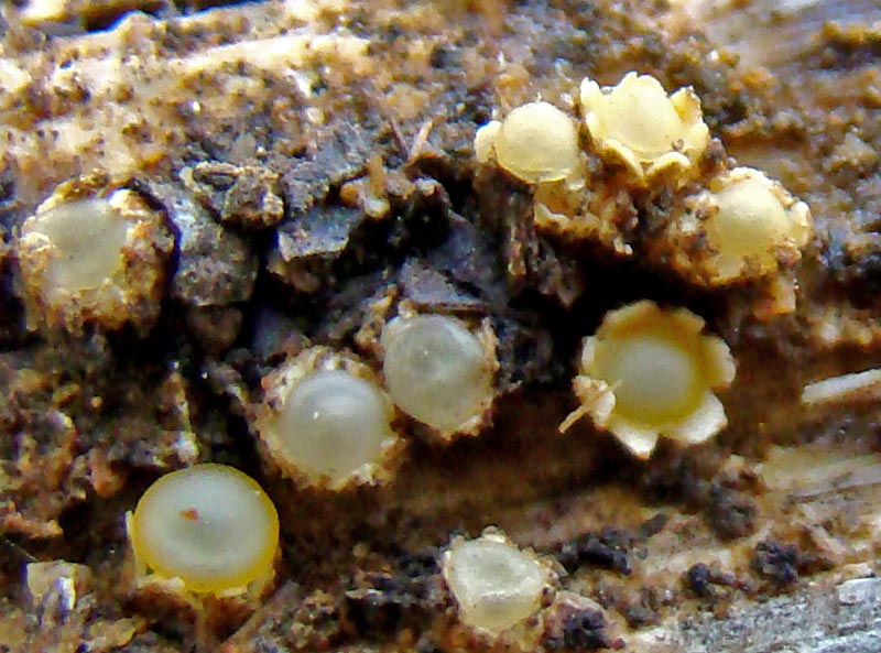 Otra curiosisima seta es la Sphaerobulus stellatus, con ejemplares de poco mas de 1 mm. es compleja para fotografiar....Pequeñisima especie de 1 a 2 mm. de diametro, que al madurar lanza el estremo o peridio, que puede salir a mas de 1 metro de distancia, y queda formado como una estrella