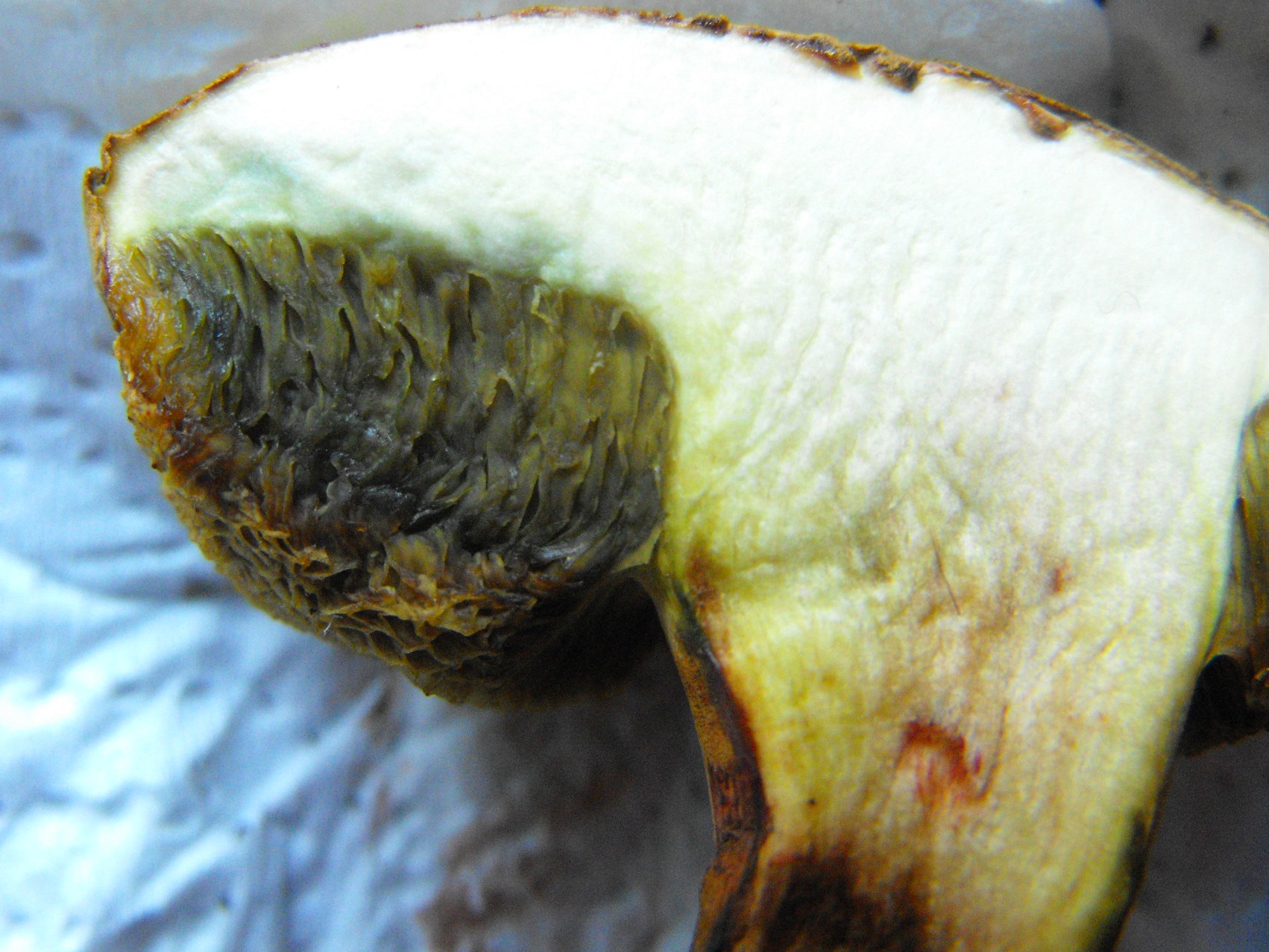 Himenio: Formado por tubos de color amarillo oliváceo. Poros concoloros con los tubos, grandes y de forma poligonal. Sin cambio de color inicialmente, posteriormente de color oliváceo oscuro. Tubos separables del sombrero, no libres. Separados en la unión con el pie, sin que lleguen a tocar a este.