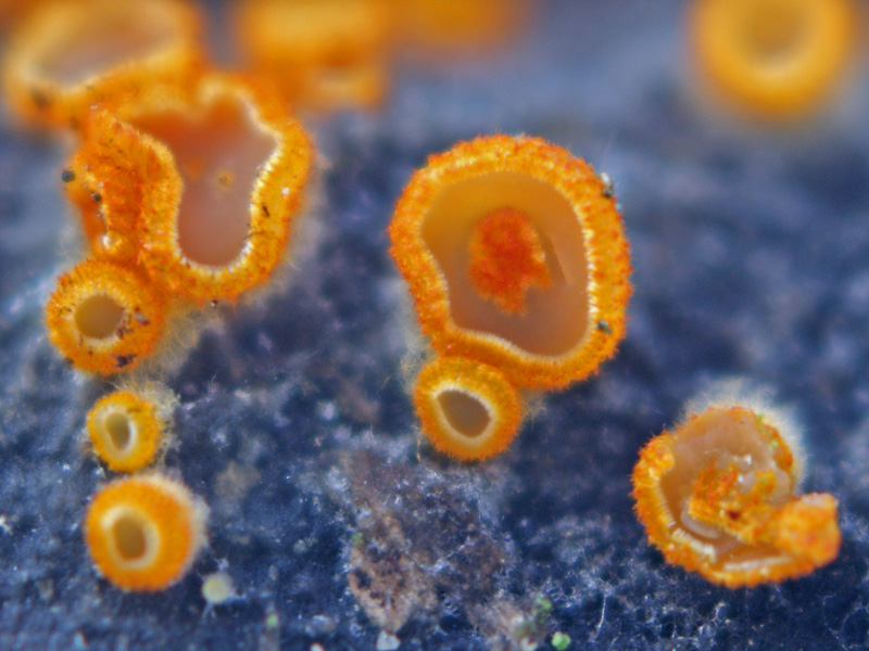 Arachnopeziza aurelia, Una pequeña seta de 0,2 a 0,6 mm. de diametro, de un vistoso color amarillo que crece sobre madera