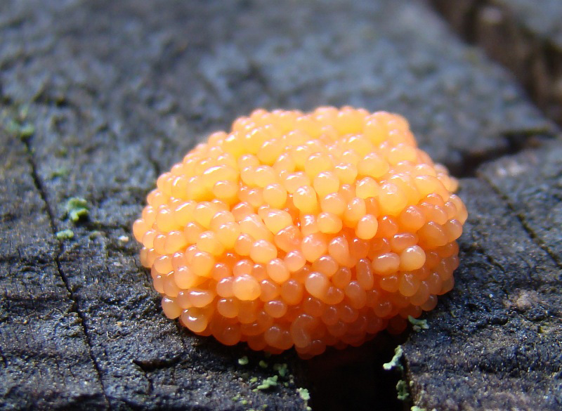Tubifera ferruginosa, una seta que esta formada por un conjunto de bolitas de color rojizo