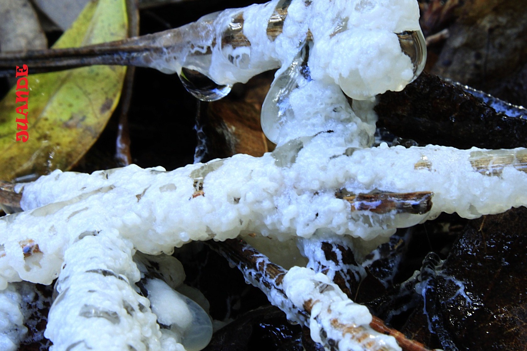 Hoy, dando una vuelta por un pinar, he pillado Niscalos (en esta epoca vaya tela) pero no han sido uno ni dos, he cogido medio canasto, trompetas amarillas hay para quien las quiera hasta vender.El clima esta loco perdido. Bueno la fotografia es de un ser raro por lo menos para mi,blanco con poros grandes dispersos,interior gelatinoso y estaba parasitando ramas y hojas en descomposicion.Al tacto es sumamente fragil.