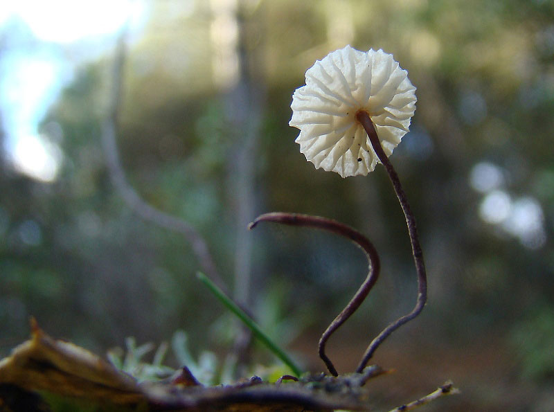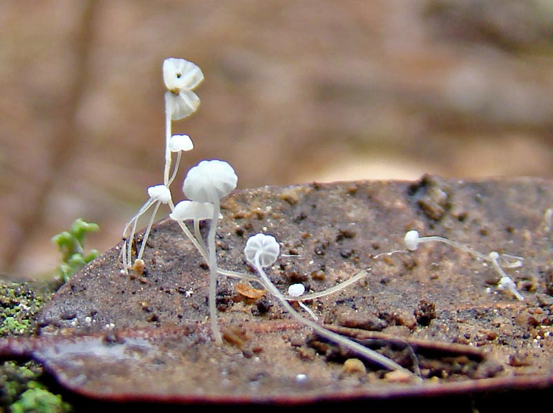 Mycena quercus-ilicis, una pequeñisima seta de 1 mm de color blanco y pie largo, que crece sobre las hojas de la encina,,, de hay su nombre.