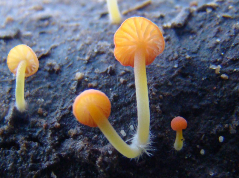 Mycena acicula, fotografiada sobre madera de encina, es una pequeñisima seta de 0.5 mm. el ejemplar grande, y de un precioso color