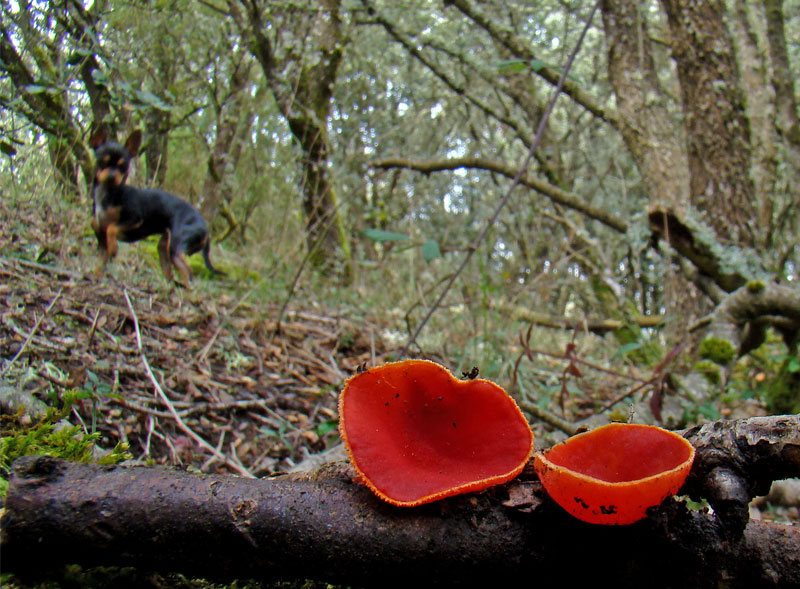Sarcoscypha coccinea... la que esta por encima con cara de susto es mi perrita, una chiguagua que se llama Izar