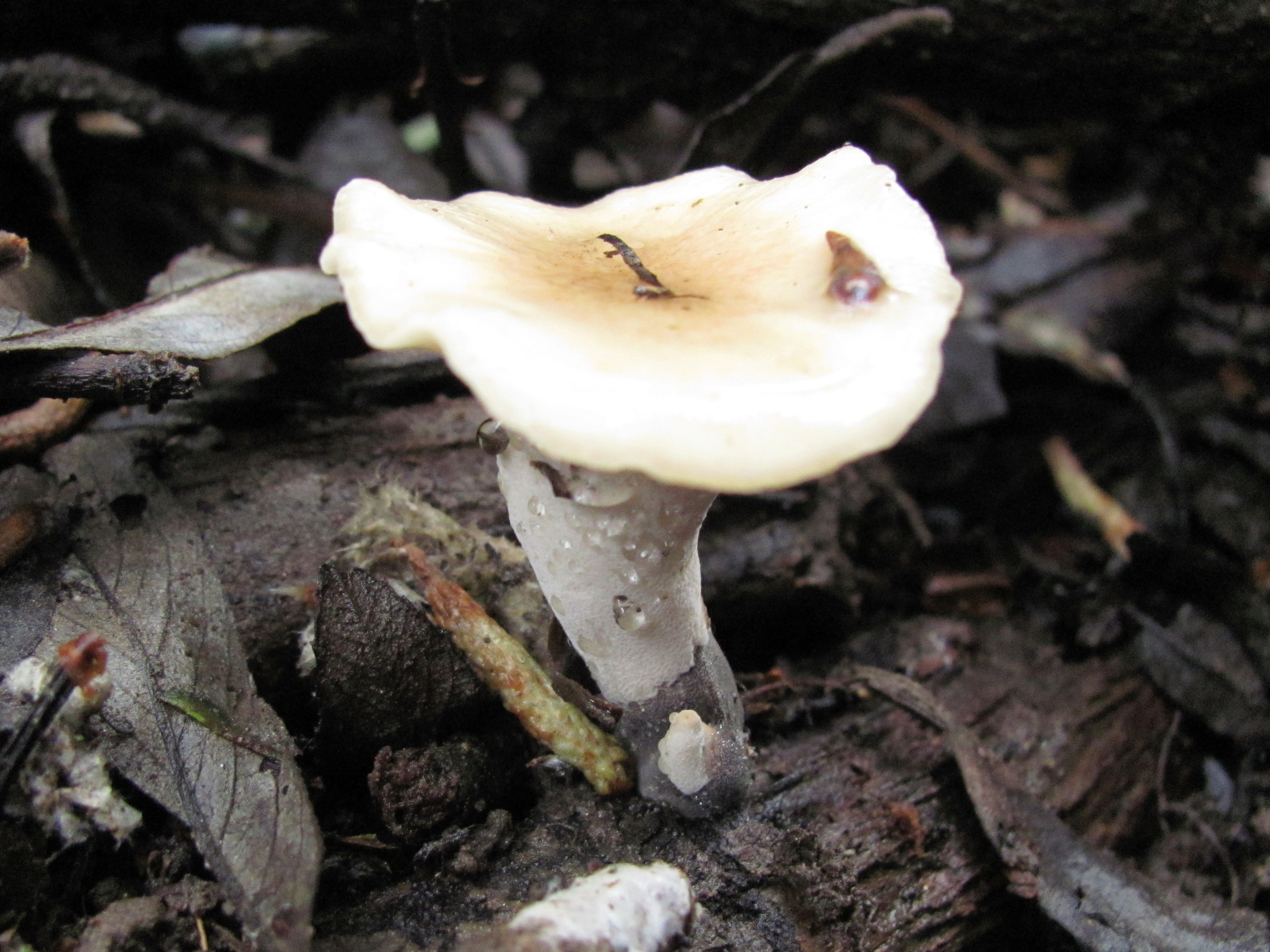 buenas,seta de unos 5a 6cm.sombrero en embudo cutícula color blanco con la humedad en el centro color ocráceo,himenio poroso decurrente asta casi la base del pie ,nace sobre madera muerta sin conocimiento de la misma,bajo fresnos,retama y maoletos. sabor un poco ácido dulzón olor inapreciable ,textura muy dura ,tuve que cortar un pedacito con la navaja ,imposible de masticar,alguna idea?saludos.