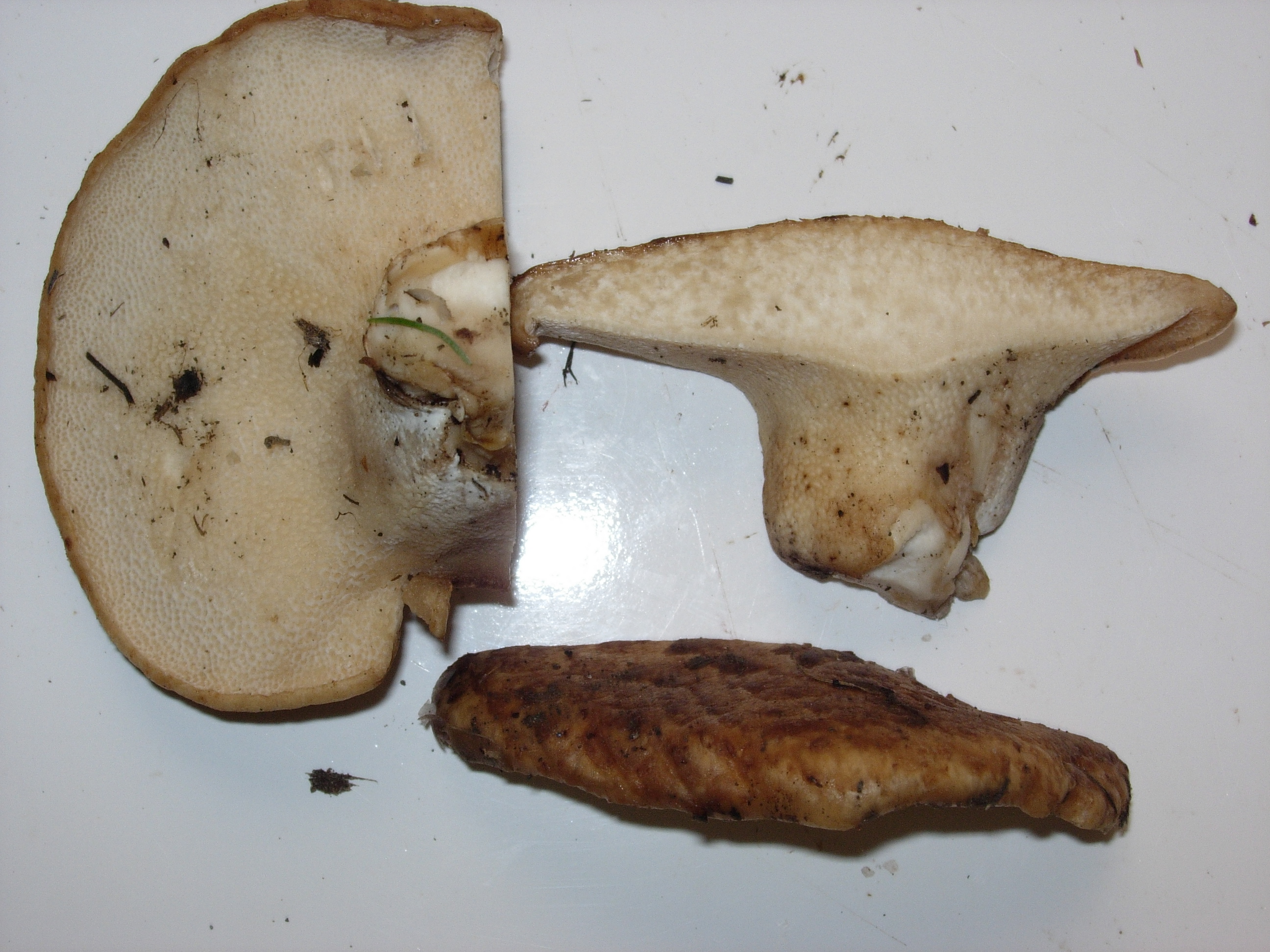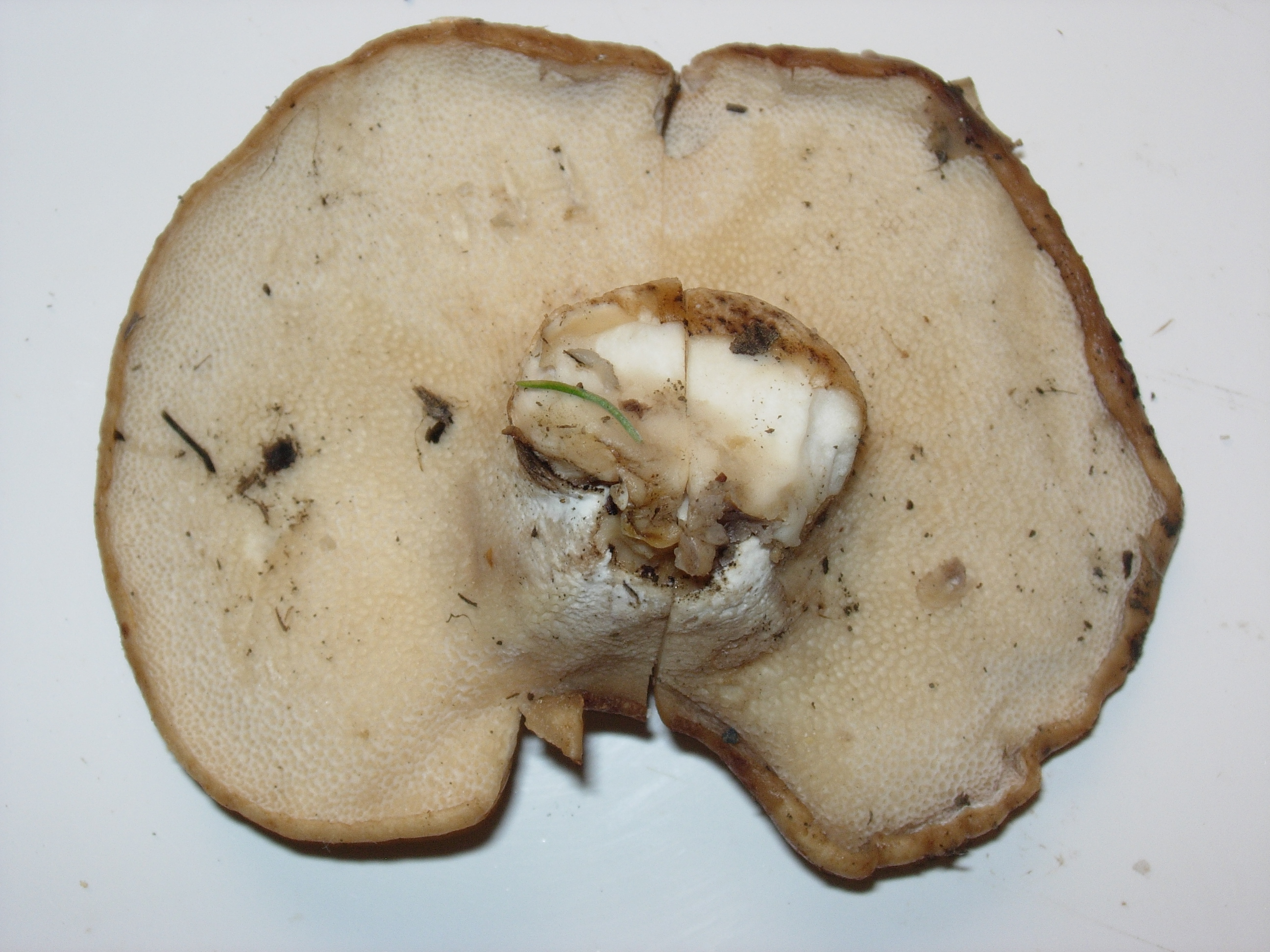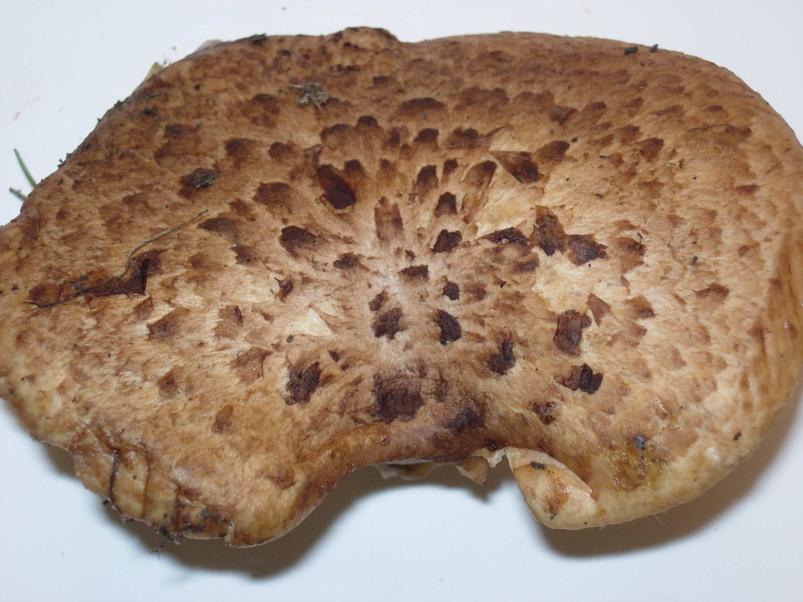 Por los poros yo diria que es un ejemplar de la familia de los boleetales, pero no se cual puede ser. Sombrero con escamas facielmente desprendibles, de 8 cm de diametro maximo, pie corto y grueso, decreciente de arriba abajo, tiene poros, pero no se obsevan tubulos.