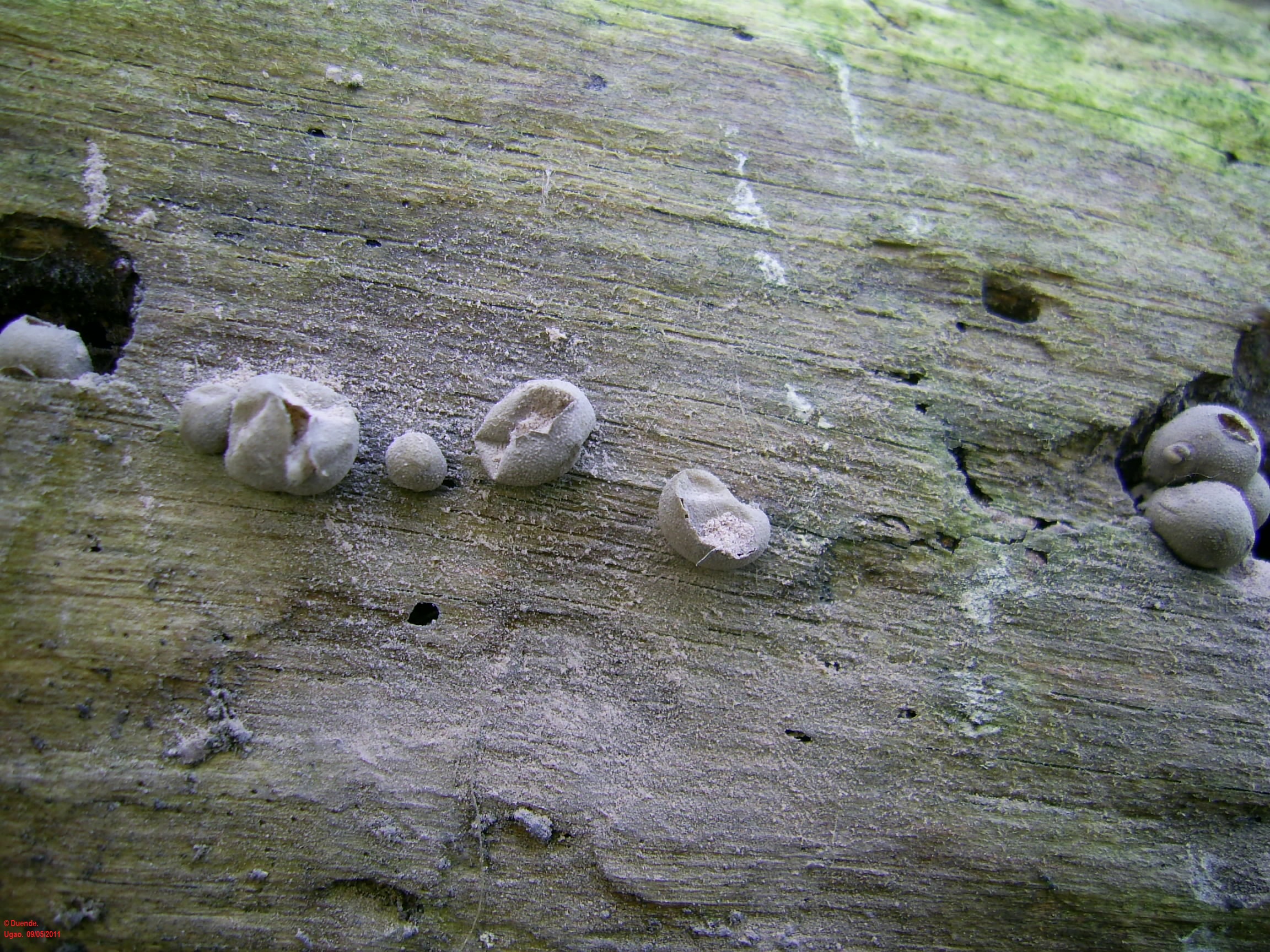 La primera es pequeña, de 1 cm. máximo. Al ser rozada desprendía la esporada de color lilácea tal y como se vé en la foto. Estaban en el tronco de un pino caido y en descomposición. Es un gasteromiceto???.