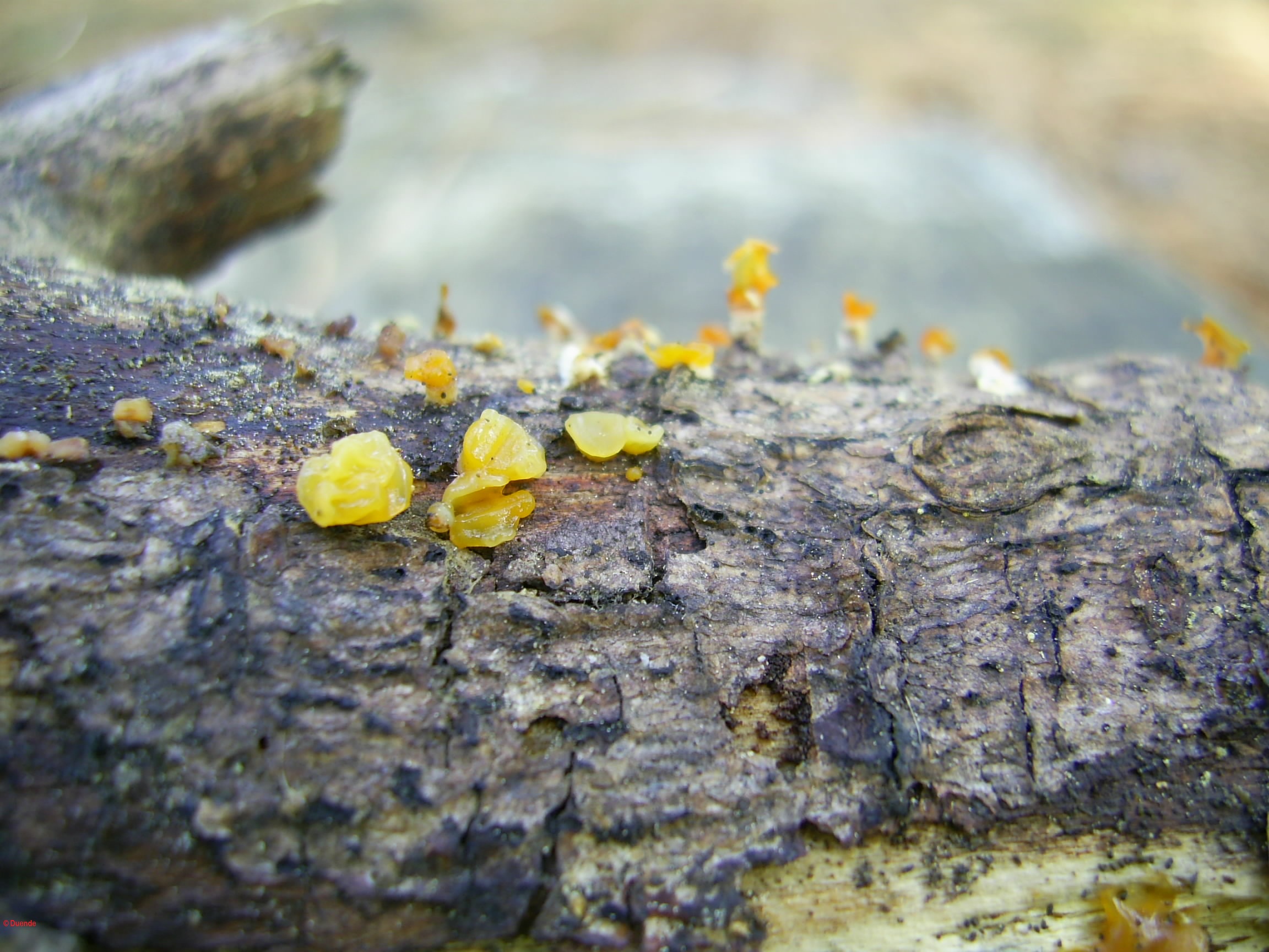 En cuanto a la Tremella mesenterica, las he visto pequeñas, grandes y muy grandes. Nunca tan pequeñas y saliendo en la parte inferior de la rama, la que está en contacto con el suelo.