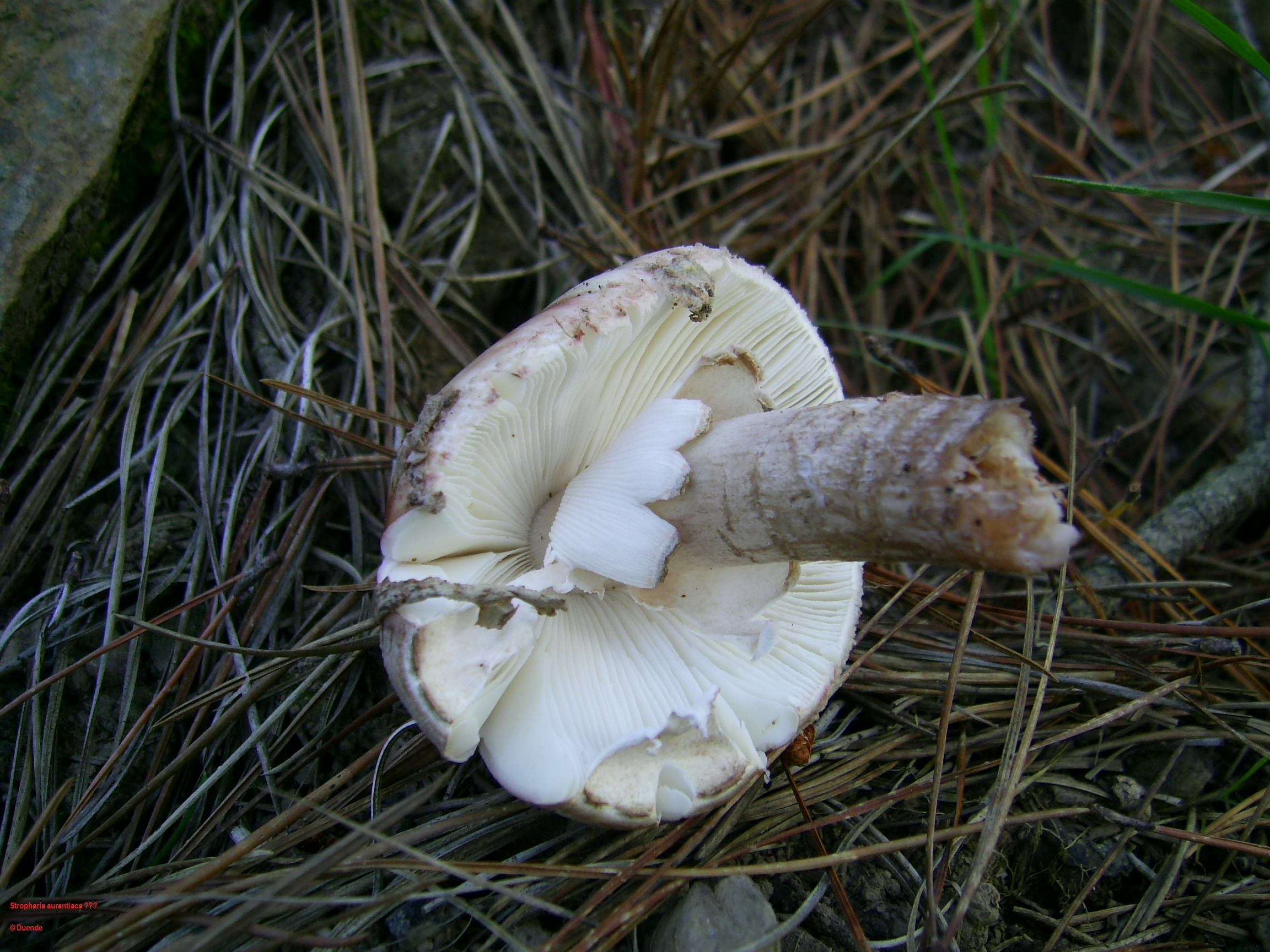 La segunda y tercera foto pertece a una seta con un sombrero de 9 cm. de diámetro aproximadamente. Se encontraba entre pinos en zona herbosa y no había ninguna más alrededor. Su olor era nulo y el sabor no lo probé. Pensé en Stropharia aurantiaca, ¿que opinais?