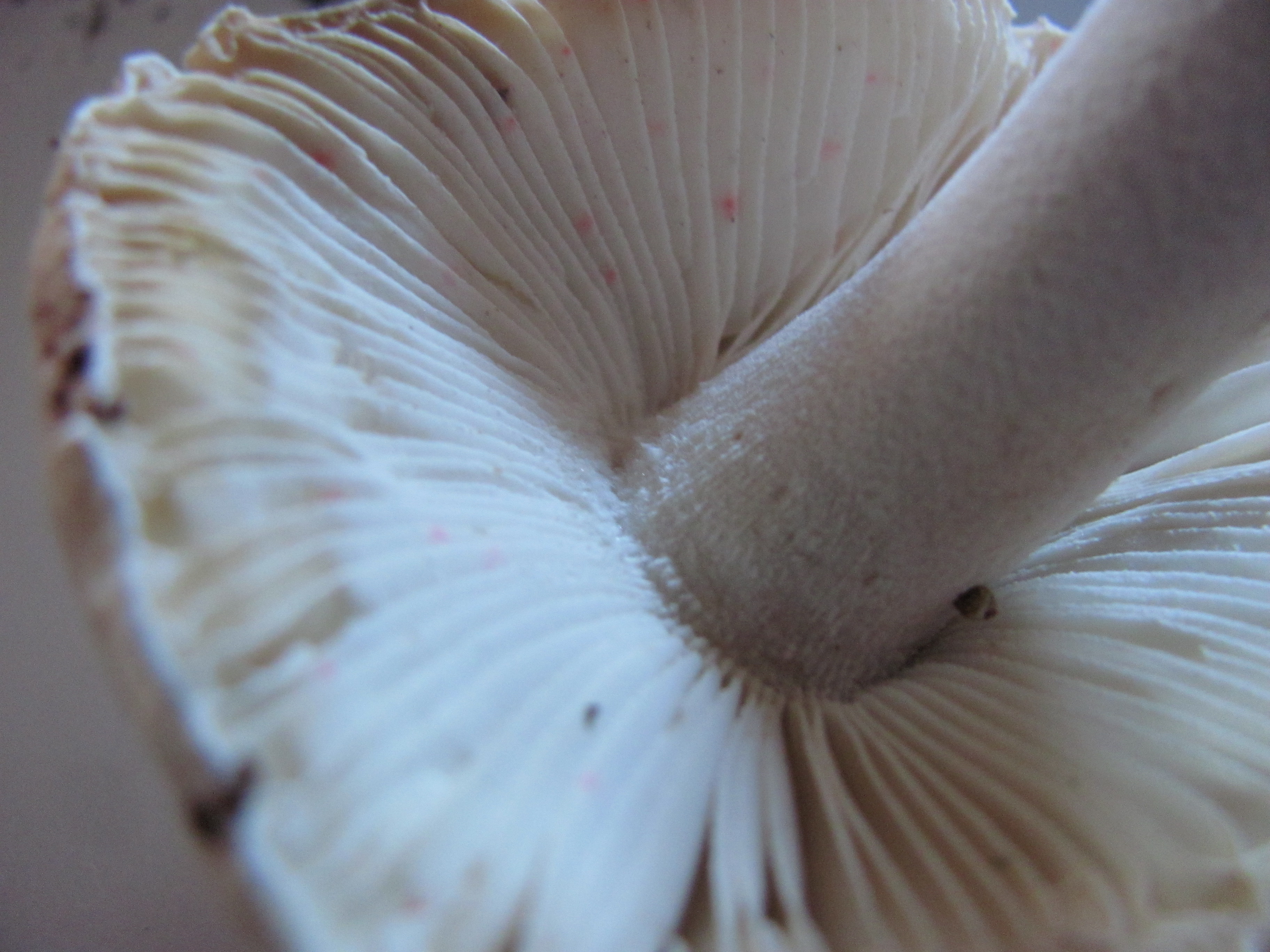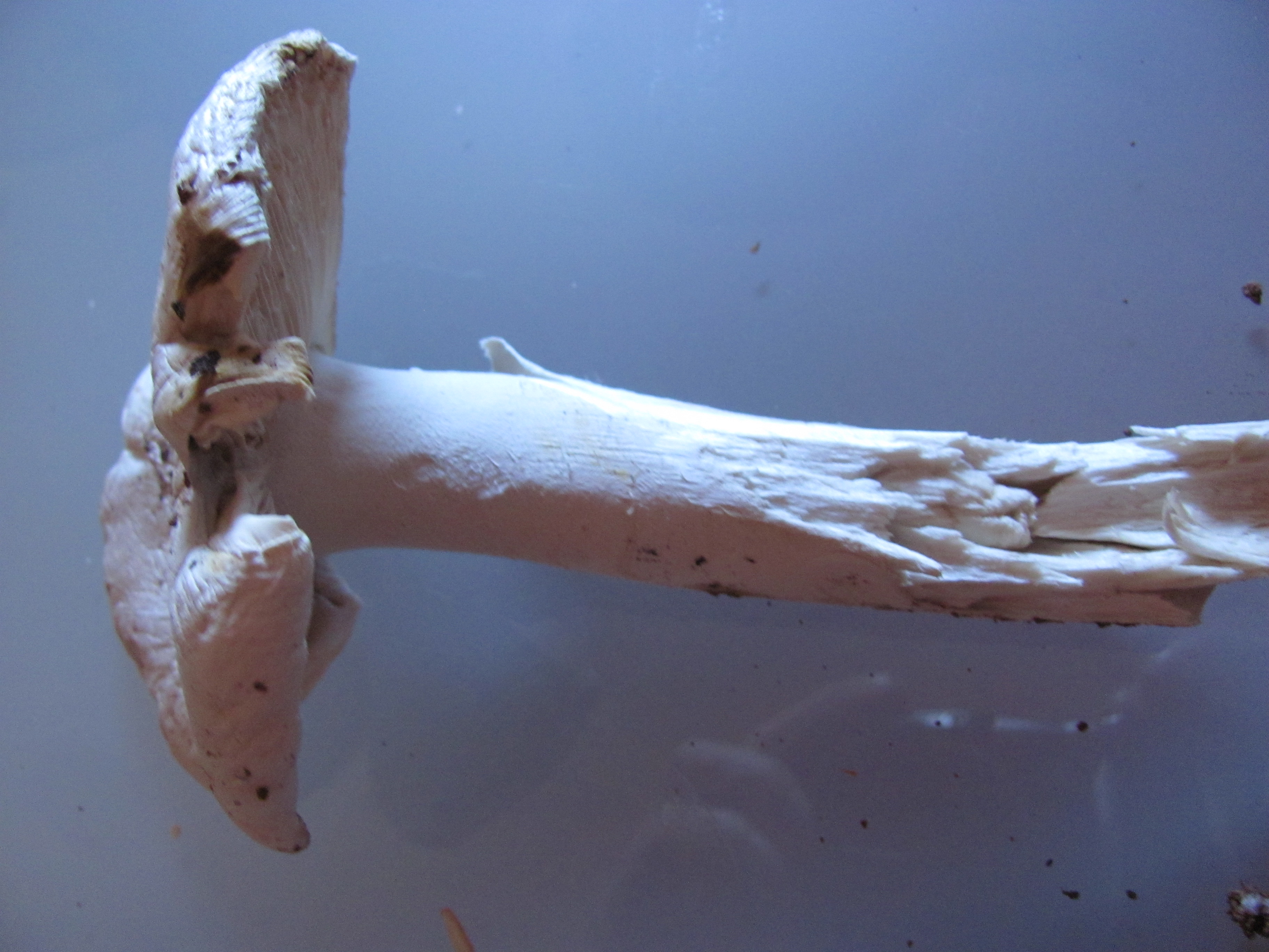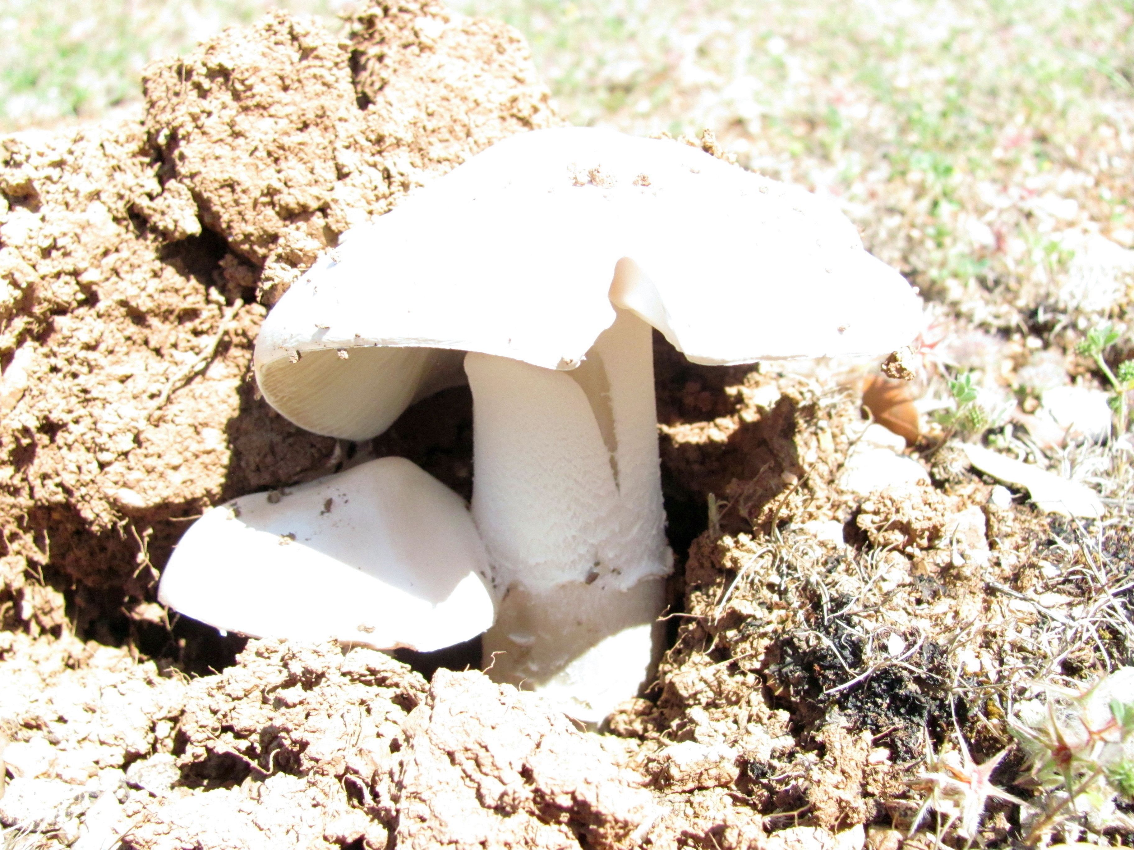 buenas,de color blanco en su totalidad,lastima que le pegaba el sol de lleno y no salio muy bien ,el pie tiene mas presencia que el sombrero ,de casi unos 20 cm. de largo por 5 de grosor con pelusilla,fibroso pero se rompe con facilidad ,nacía de forma cespitosa y muy profundos en claro de bosque de encinas ,olor fungico ,no la probé pues parecían amanitas alguna idea??saludos
