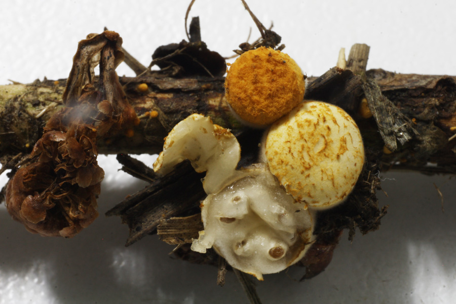 Observo que los peridíolos son blancos. Igual es que no están maduros pero yo me inclino por Crucibulum laeve.