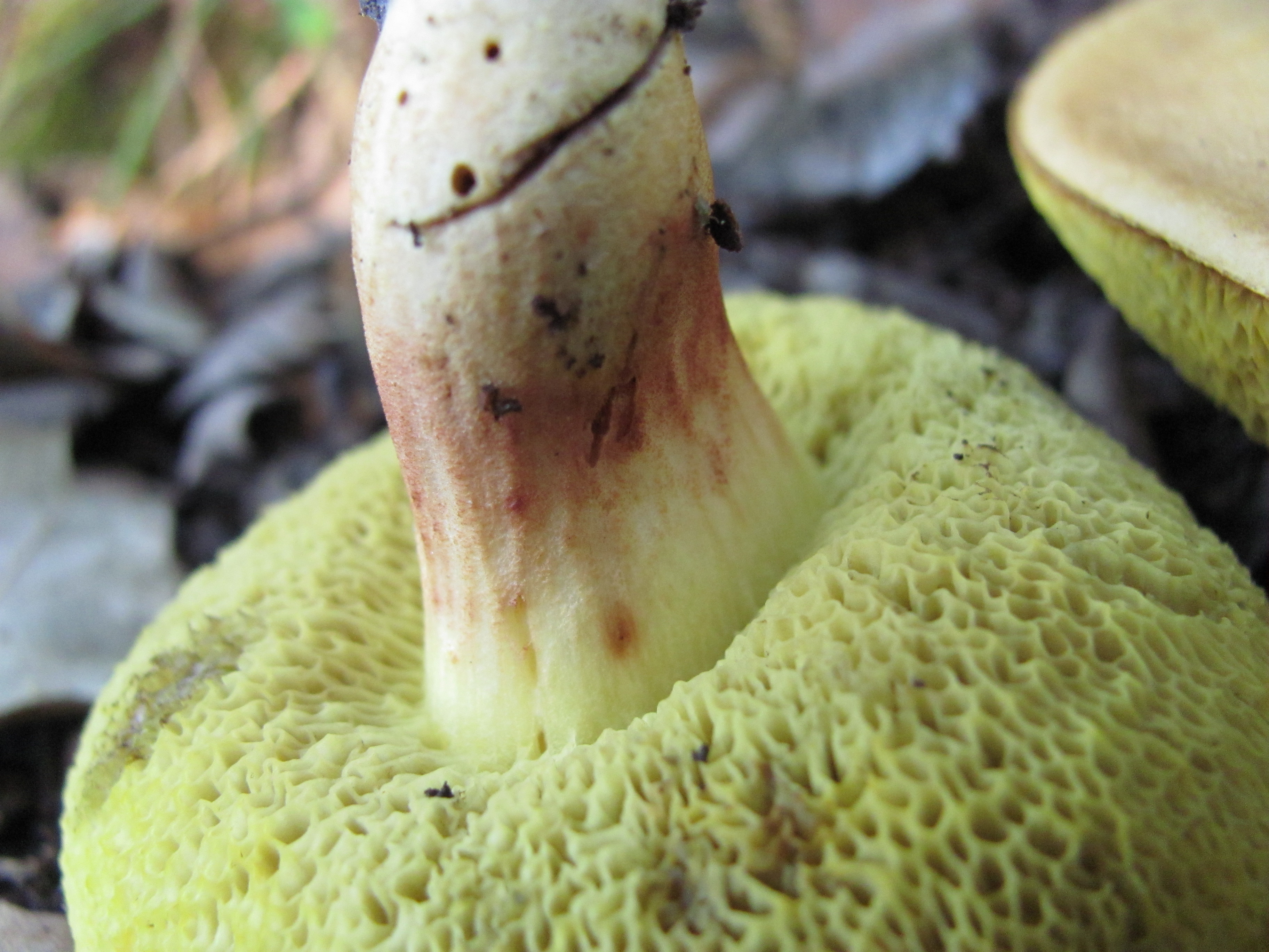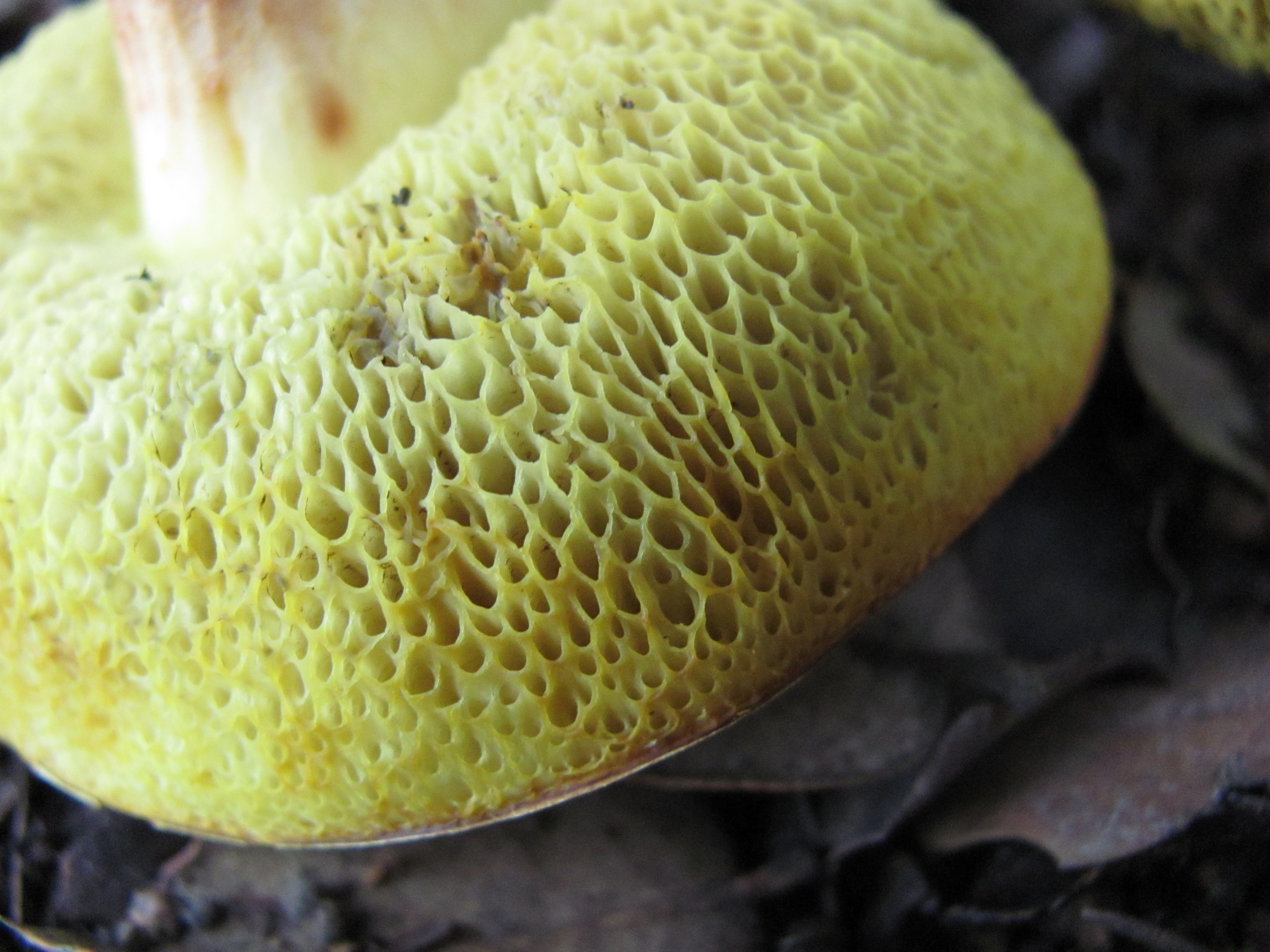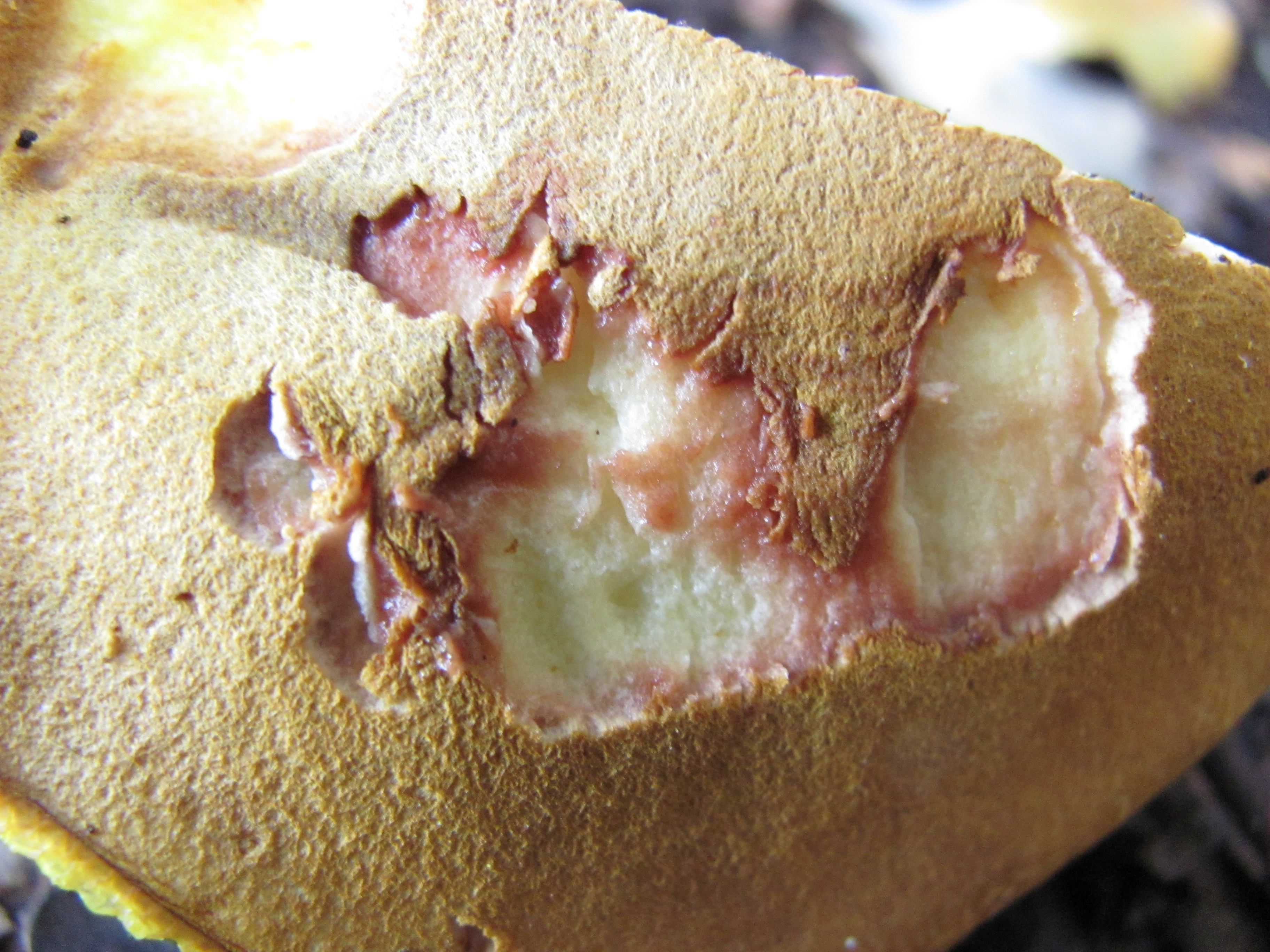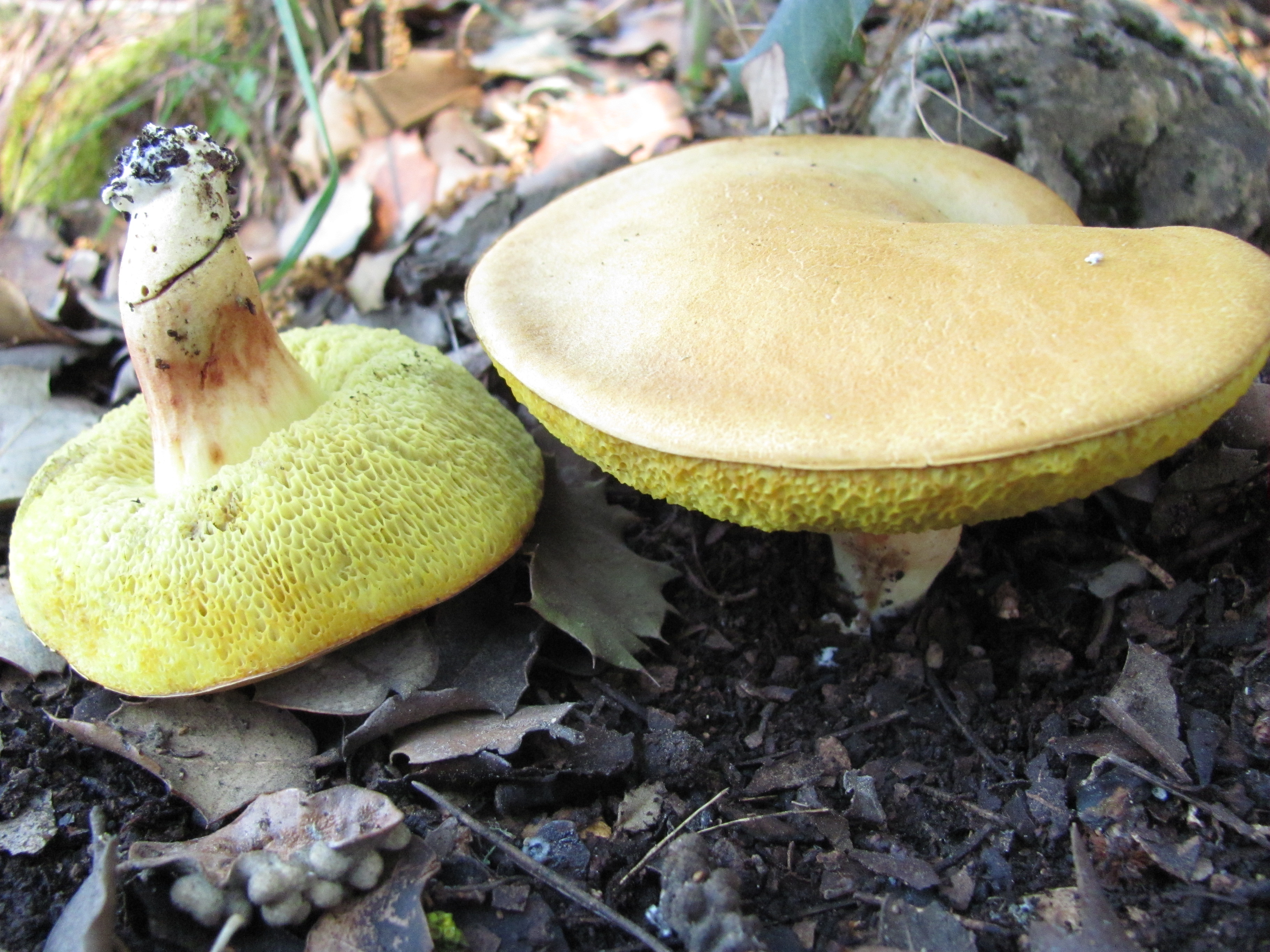 buenas,algunos ejemplares podrían tener asta 10 cm.de diámetro ,color amarillo ,al quitar cutícula presentaban un color colorado ,tubos de color amarillo verdoso que cambian de color al tacto ,pie casi desenterrado ,con retículo no muy visible manchado de castaño rojizo en la zona central ,olor no apreciable ,sabor amargo no muy intenso ,abitad bajo encinas ,saludos.
