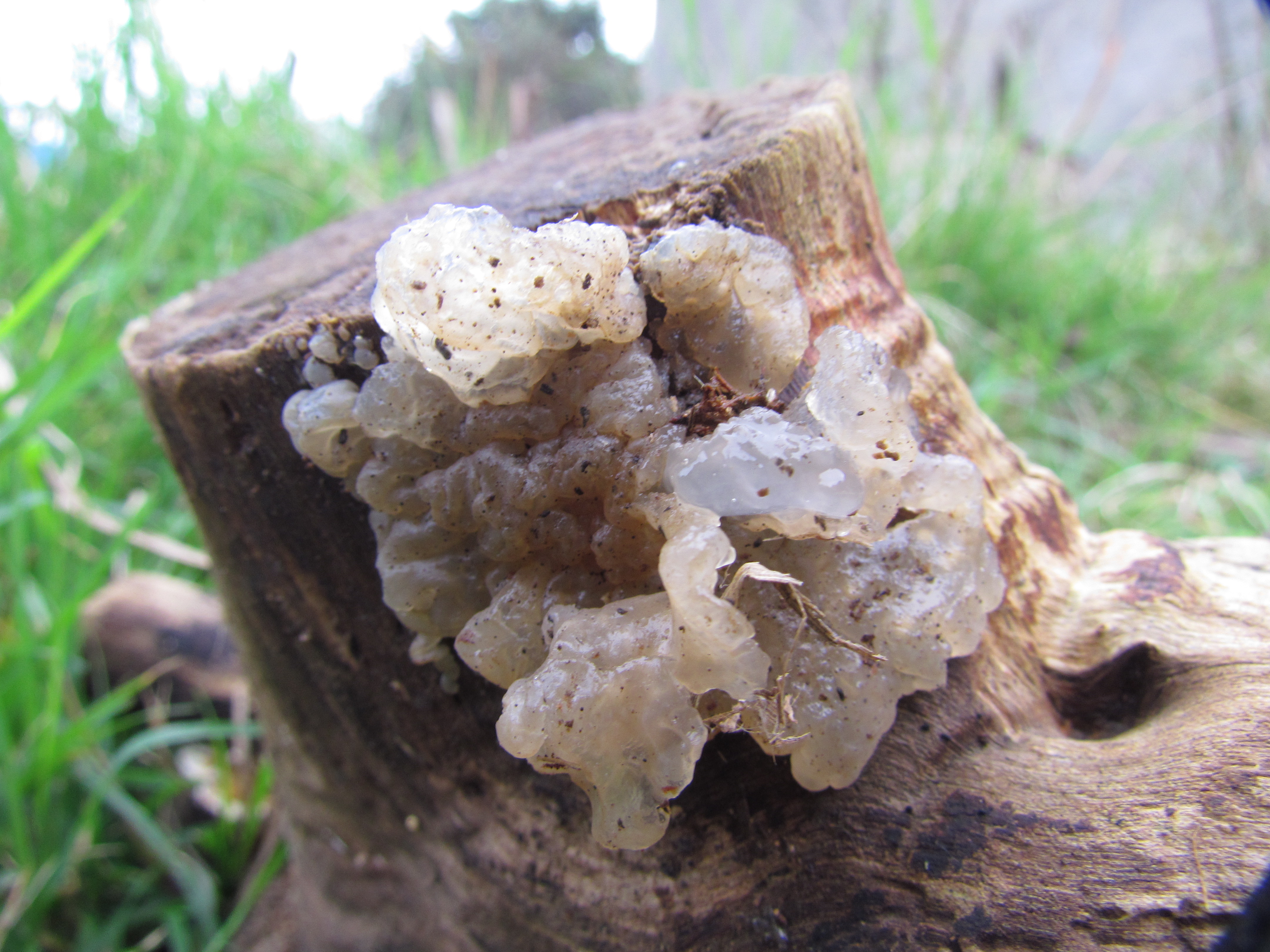 buenas,no cabe duda que se trata de una Exidia,la segunda foto ,parece nacer en madera de pino corrígeme si me equivoco ,puede tratarse de E.saccharina en estado joven propia de piceas aunque puede darse en otras especies de arboles,también puede ser las que dicen mis compañeros aunque esas son de un color blanco mas intenso ,seria interesante que le hicieras seguimiento y mostraras alguna foto en un estado mas maduro ,saludos.