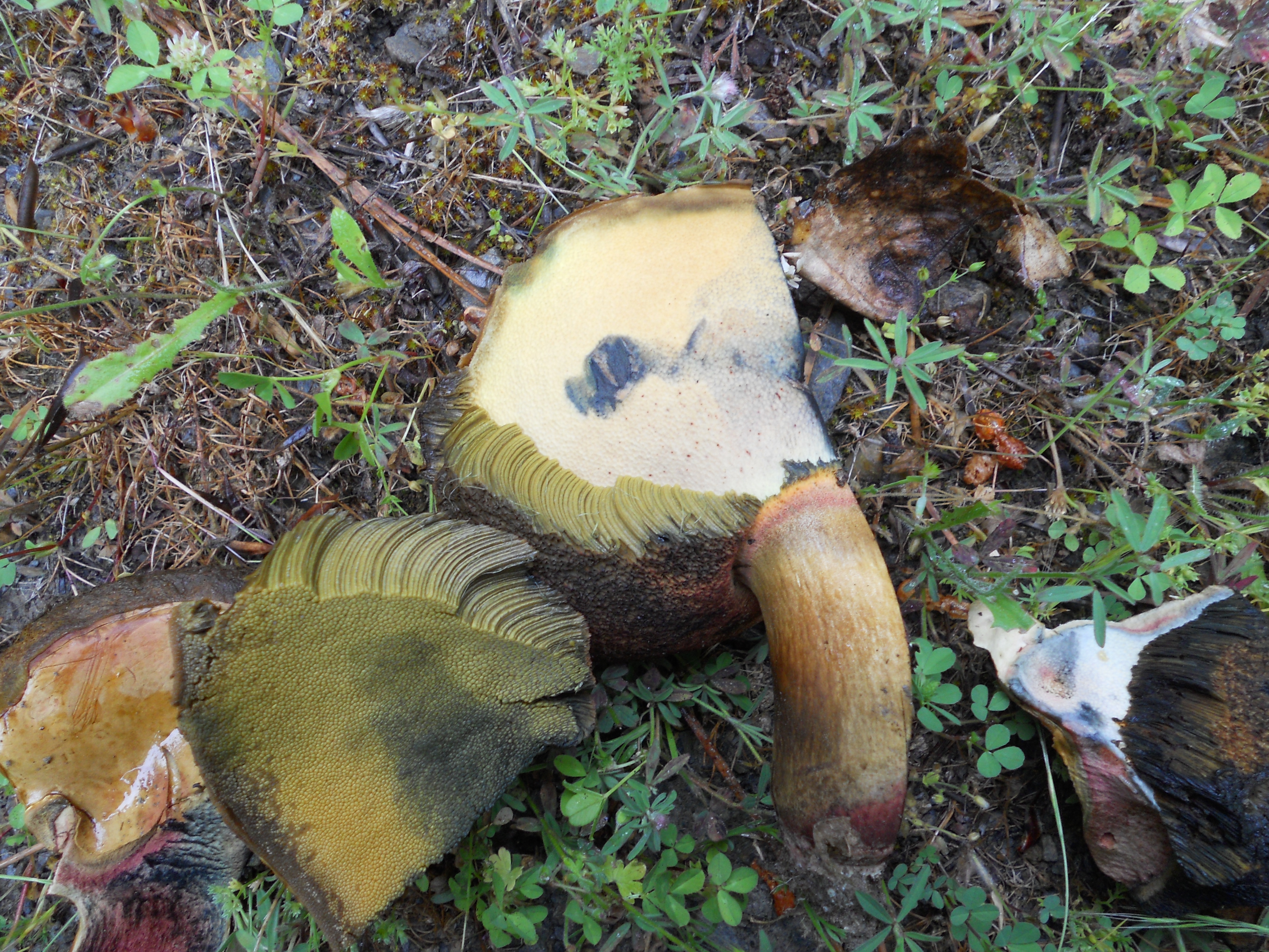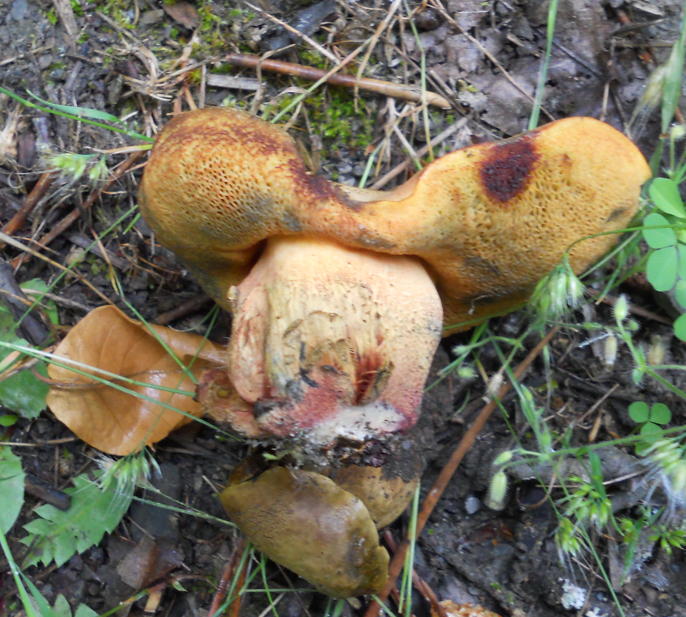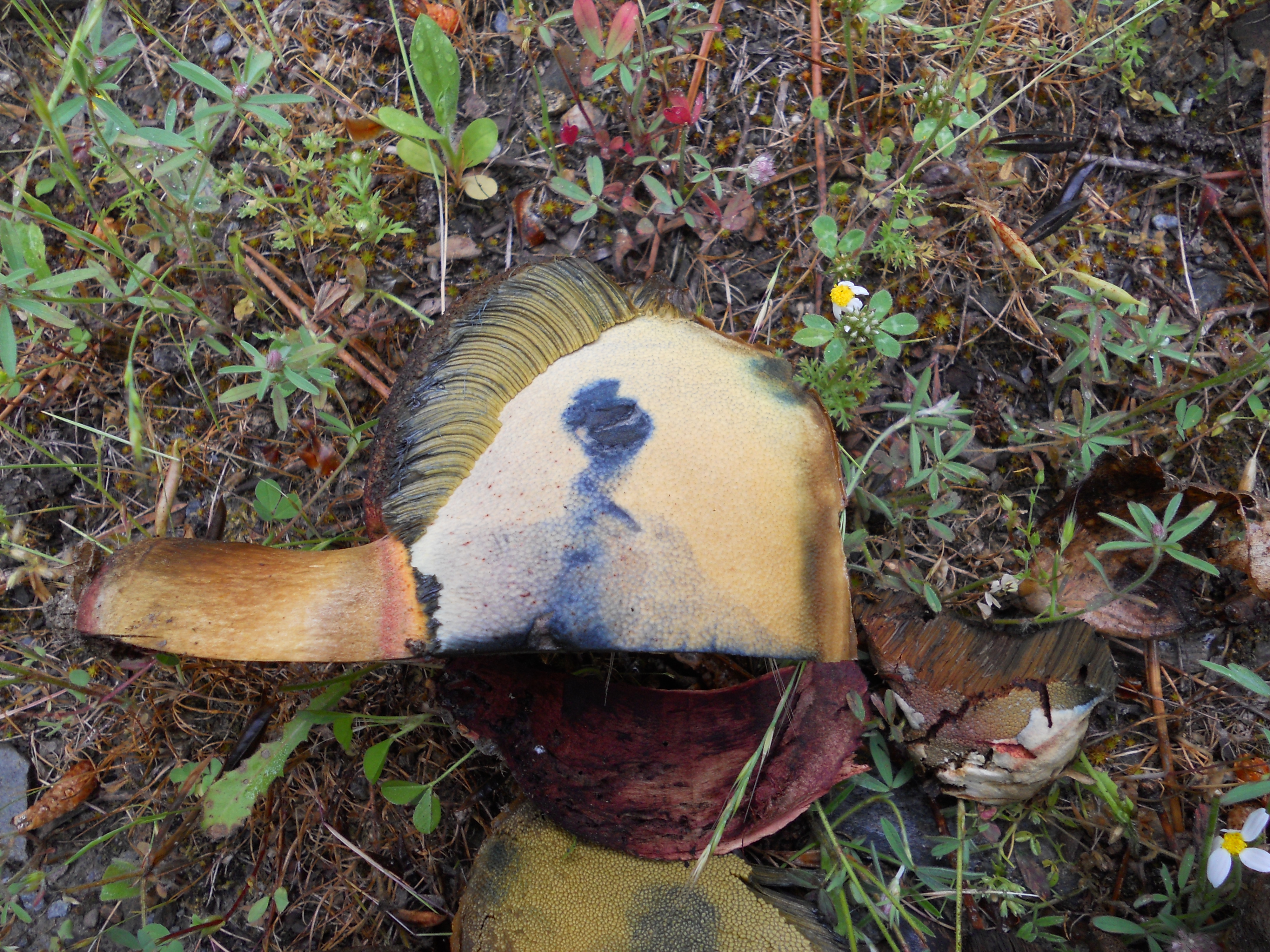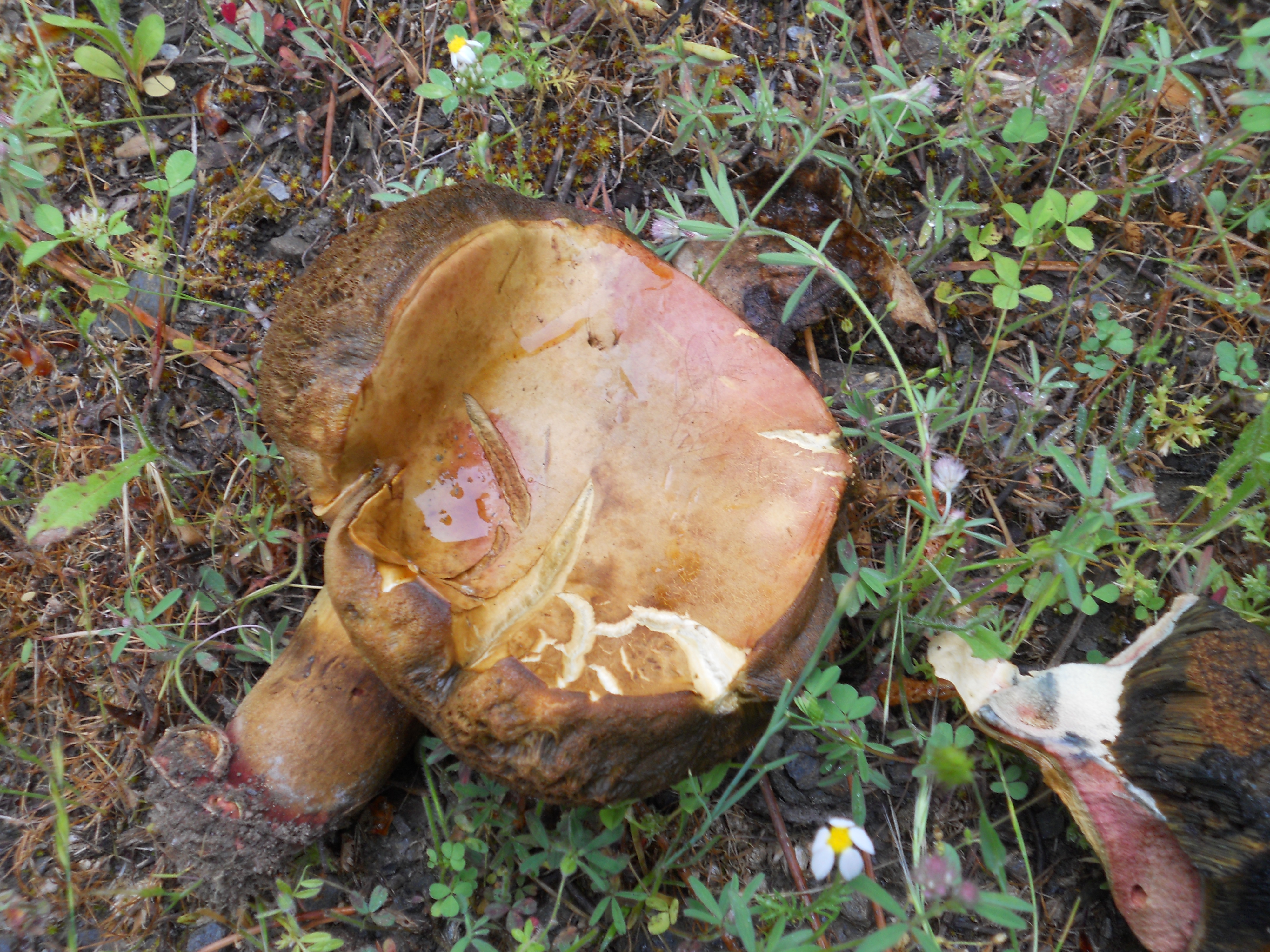 Sea lo que sea es seguro que es un ejemplar atípico, mira a ver que te parece Boletus pulchrotinctus