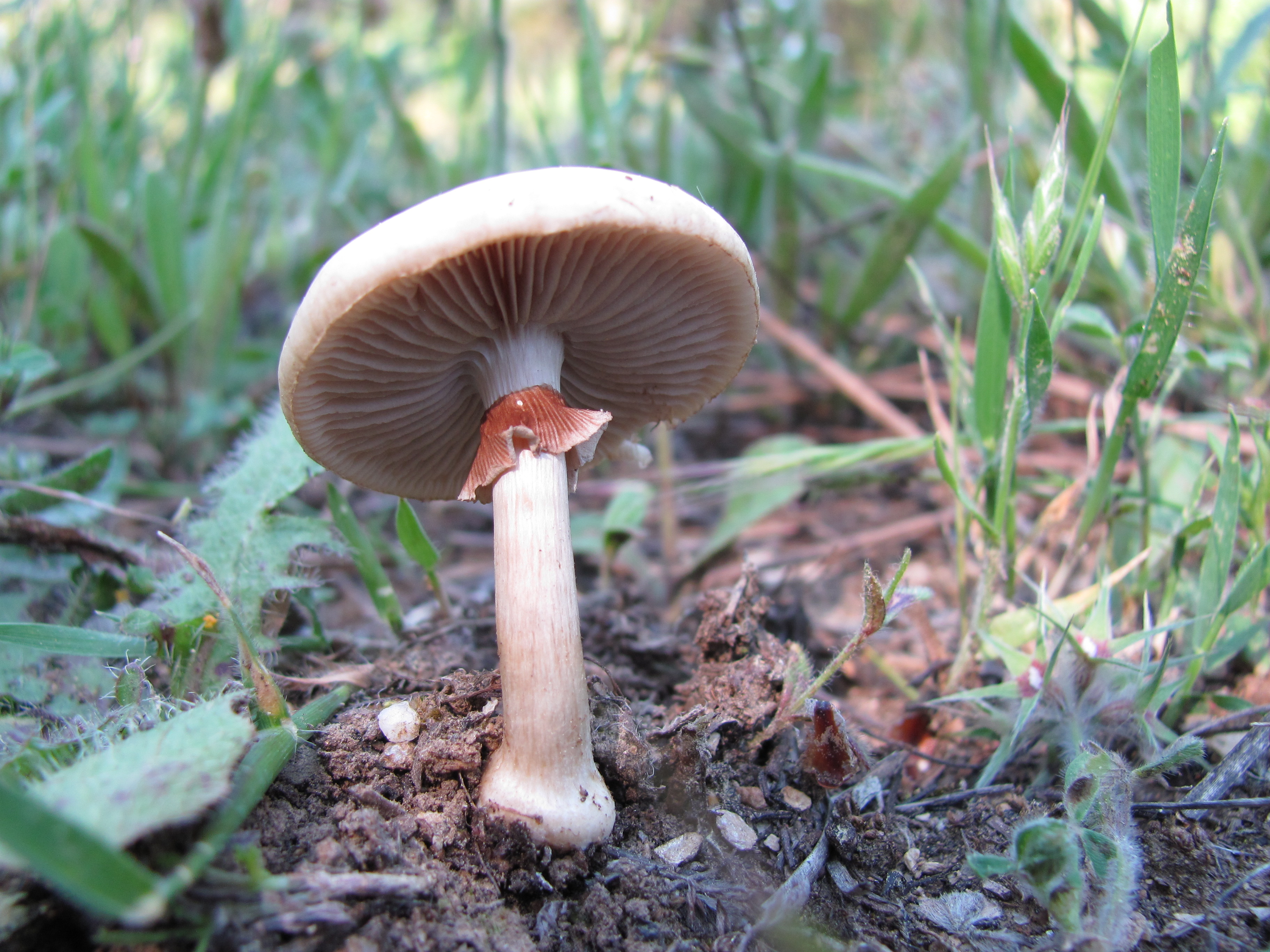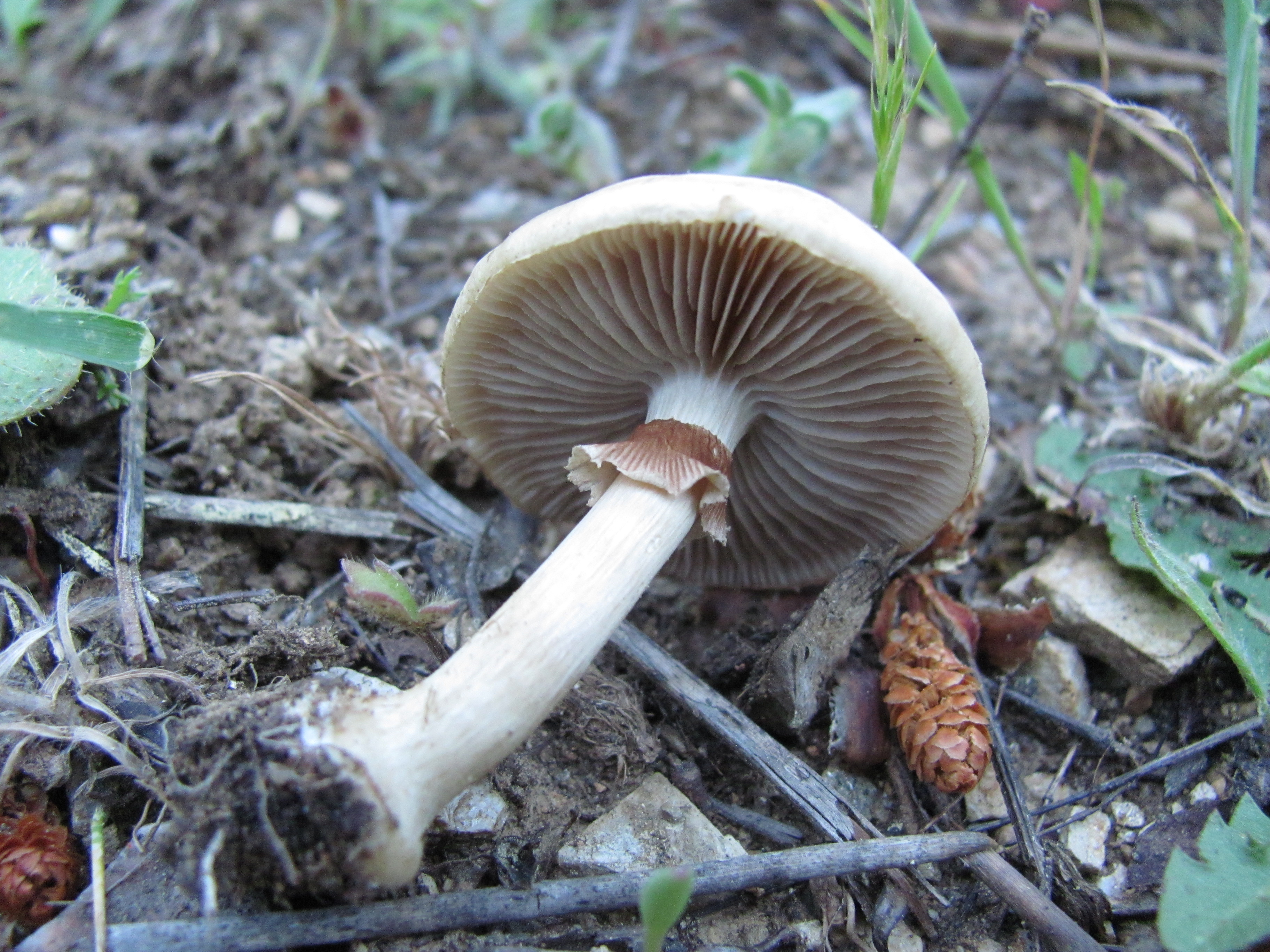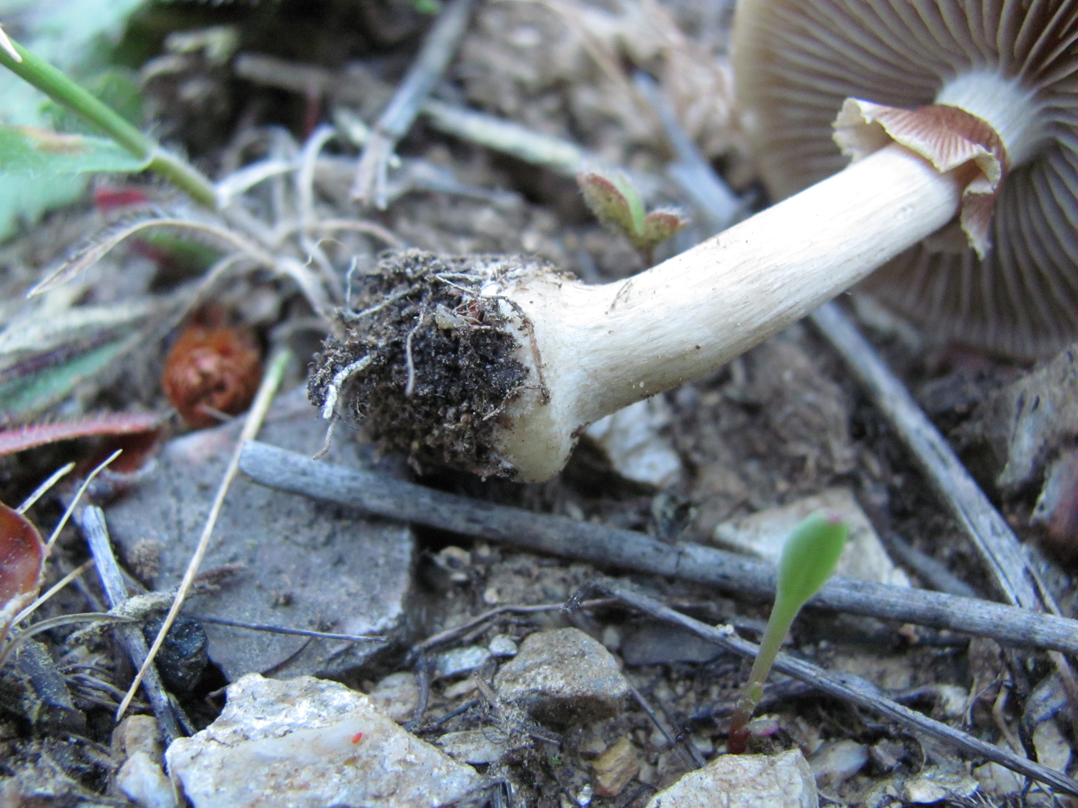 buenas, creo que podría tratarse de Stropharia aunque no estoy muy seguro ,pues me hace dudar el pie y ese pequeño bulbo,sombrero de unos 6 cm. de diámetro, hemisférico de un color blanco a pálido ,laminas adnatas ,de color del sombrero ,un poco rosado en el interior de las mismas,pie cilíndrico ,bulboso y fibroso,con un anillo bien representado, de un color pardo rojizo en las linias que forman el anillo