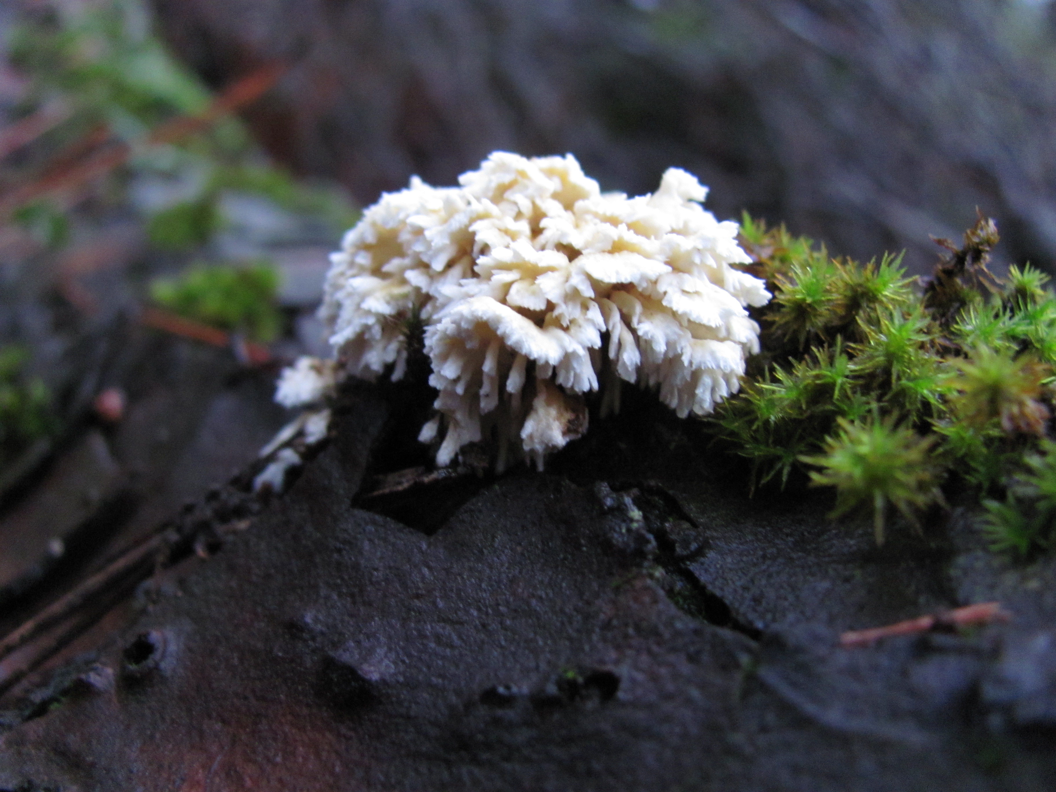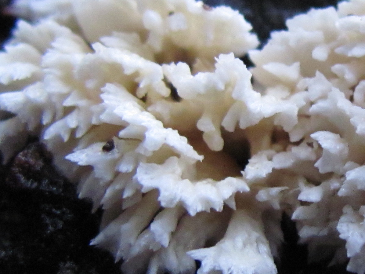 buenas,esta seta de invierno,aun me trae de cabeza ,con tres localizaciones diferentes pero el habitad es parecida y sobre los 1300 a 1400 m.de altitud ,siempre la encontré sobre madera de pino en buen estado como en tocones secos,se parece en la textura a Schizophillum ,pero su crecimiento tipo cespitoso o mejor dicho tipo liquenes ,en la zona inmenial no posee laminas sino que le cuelgan de tres a cuatro bellos de 1 a 2 mm.de grosor a medio cm de longitud en cada tramete ,es de un color blanco y maduro toma color pálido llegando a tomar cerca del pie unos colores del ocre al marrón,es una seta la cual necesita bastante humedad para desarrollarse aunque no lo aparente ,por eso su crecimiento en esta estación ,los pinos donde los encontré todos ellos en tierra ácida,todo el mundo o casi todos la relacionan con el genero de barbas de león vulgarmente dicho aunque yo la relaciono mas con el genero Cotylidia,intentare subir alguna foto ampliada aunque ninguna toma de las que hice salieron bien,solo en una se aprecian los vellos y en otra los trametes ,espero con la ayuda de todos a encontrar al genero que pertenece ,mis mas cordiales saludos y pedirme los datos que veáis en necesidad ,un abrazo compañeros
