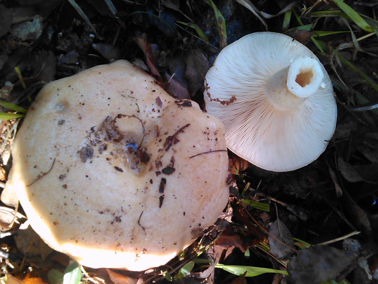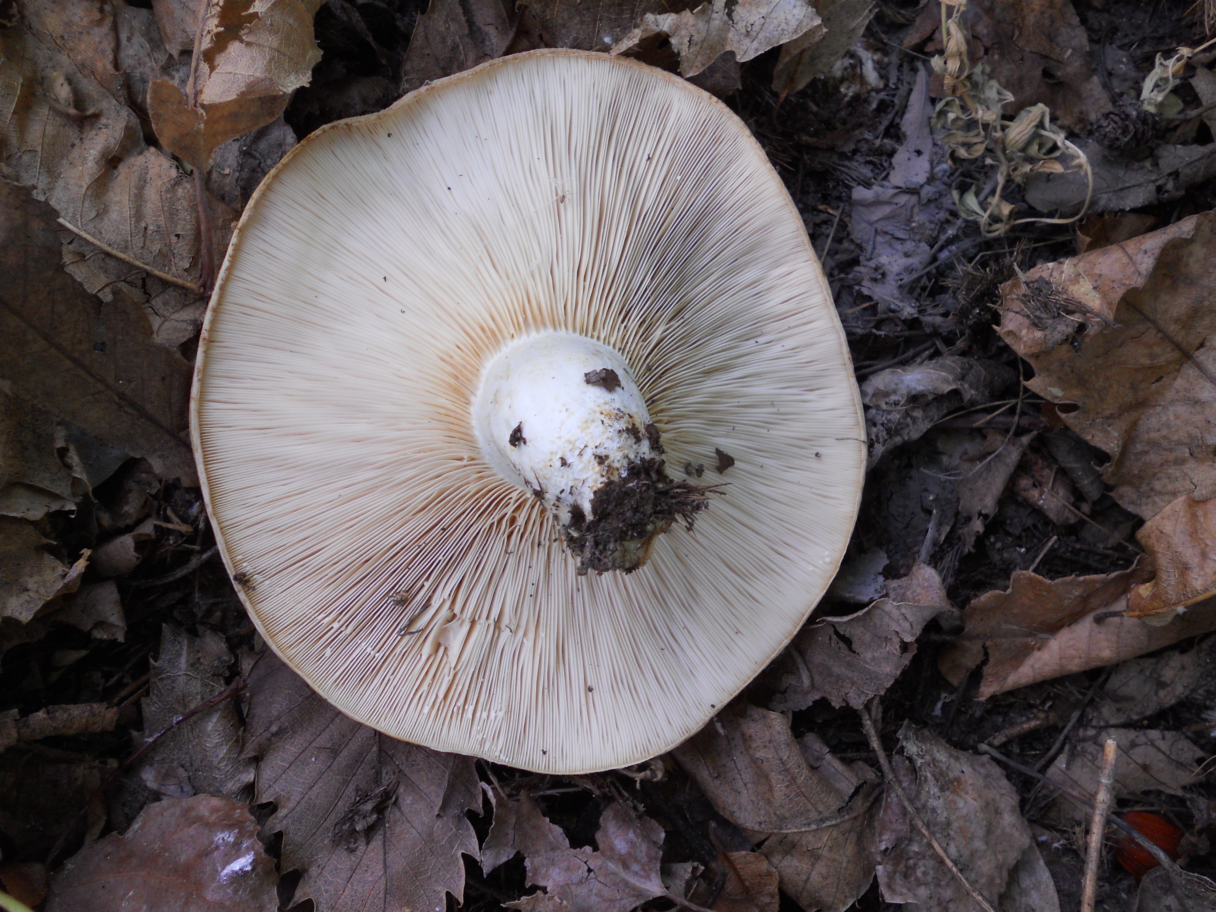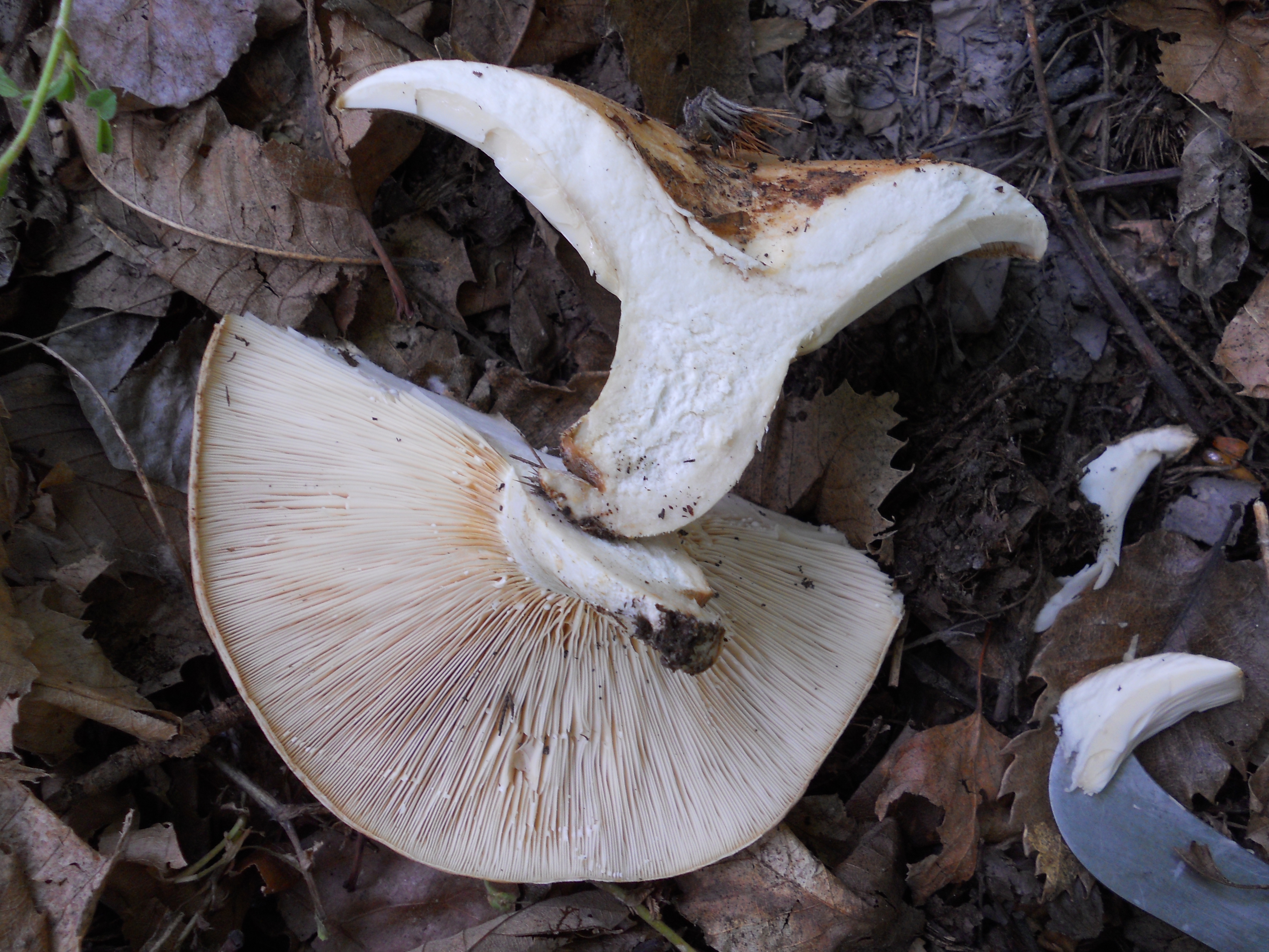 Lo he encontrado hoy en un bosque de rivera, entre alamos, castaños y alisos. Semienterrado entre la hojarasca, el ejemplar estaba en muy buenas condiciones. De un sombrero con 13 cm de diametro, de color blanco, manchadas de color ocre rojizo, con el pie corto de 7 cm X 3 cm. las laminas blancas tirando a crema, muy apretadas, el latex blanco y escaso, olor indeterminado, carne quebradiza.