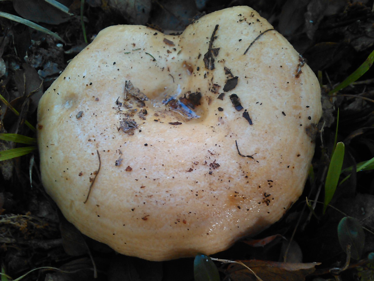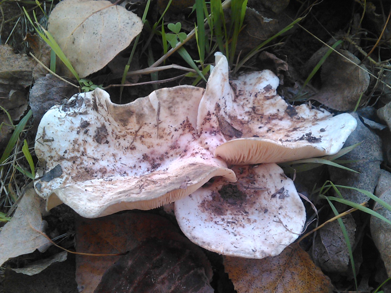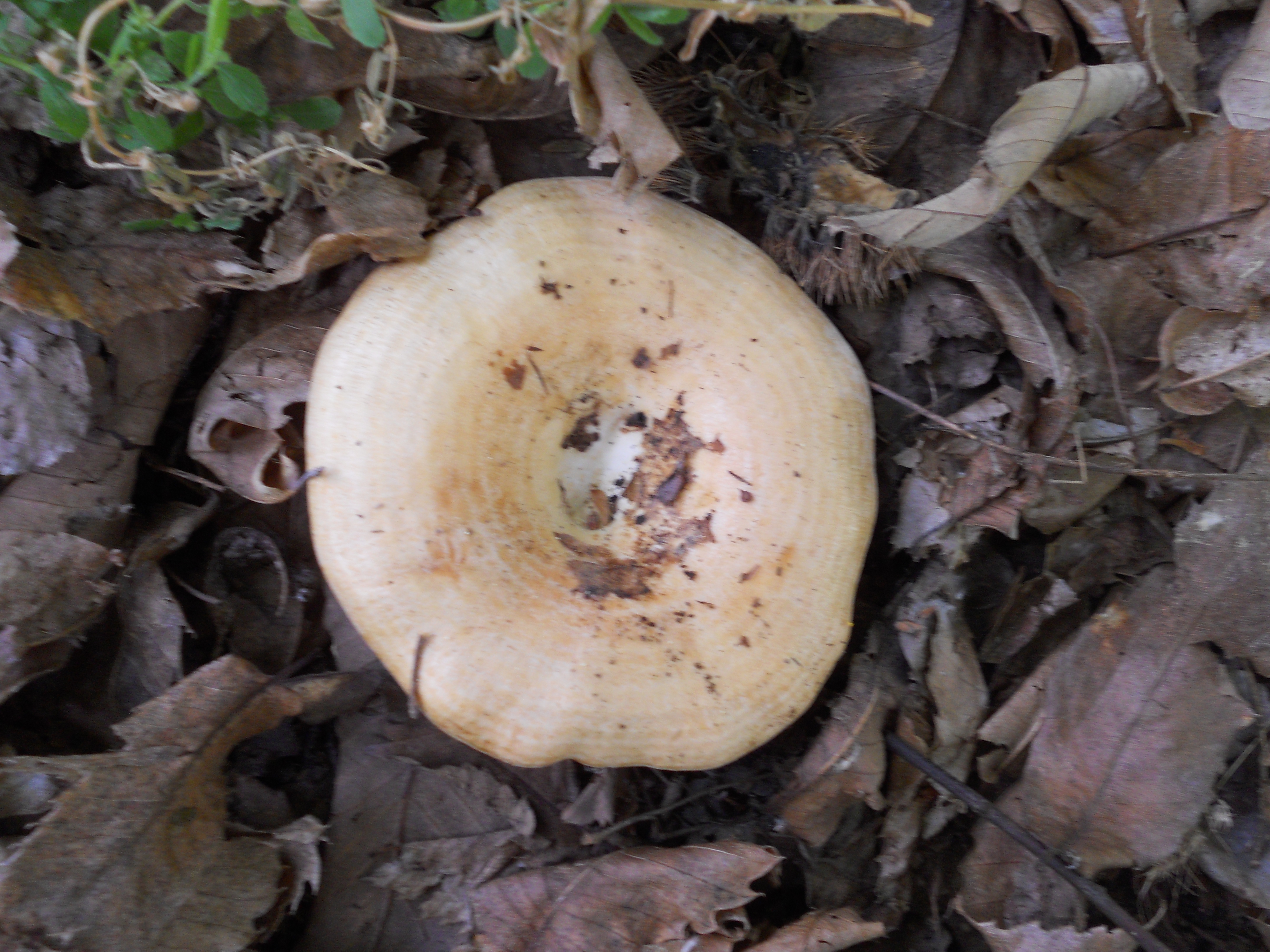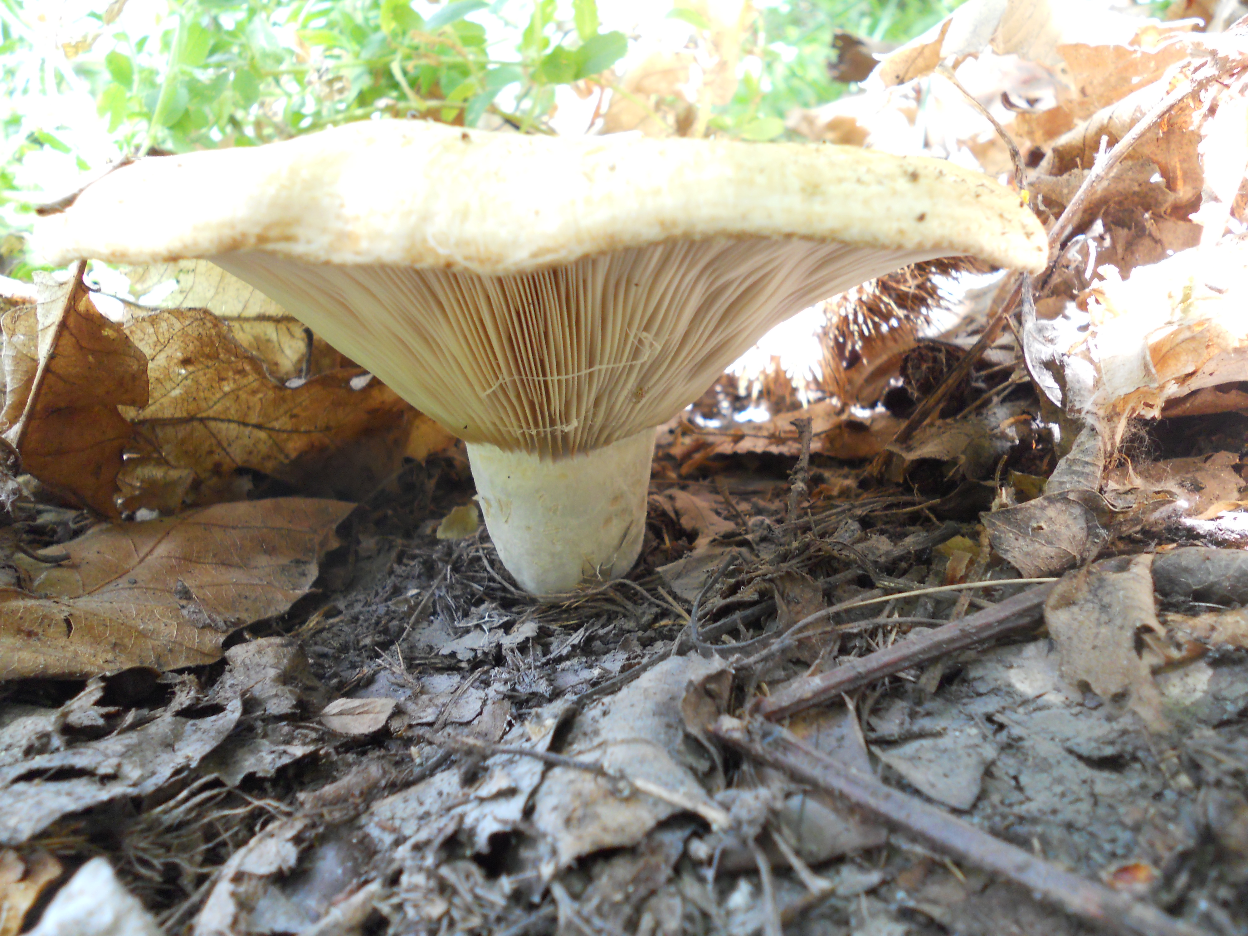 Lo he encontrado hoy en un bosque de rivera, entre alamos, castaños y alisos. Semienterrado entre la hojarasca, el ejemplar estaba en muy buenas condiciones. De un sombrero con 13 cm de diametro, de color blanco, manchadas de color ocre rojizo, con el pie corto de 7 cm X 3 cm. las laminas blancas tirando a crema, muy apretadas, el latex blanco y escaso, olor indeterminado, carne quebradiza.