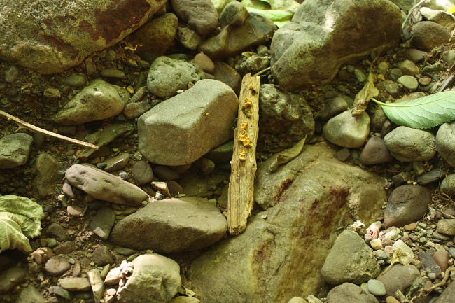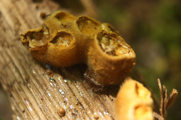 Pienso que se puede tratar de un Crucibulum laeve resecado,ya que su forma es alargada y solo se abre por su parte superior,sí bien la Nidularia deformis cuando la he visto es más redondeada y tiende a abrirse no solo por arriba sino también por los costados.La clave ideal hubiese sido que uno de los ejemplares estuviese sin abrir,entonces a simple vista veríamos que su parte superior es plana, determinado de este modo que en efecto se trata del Crucibulum laeve.