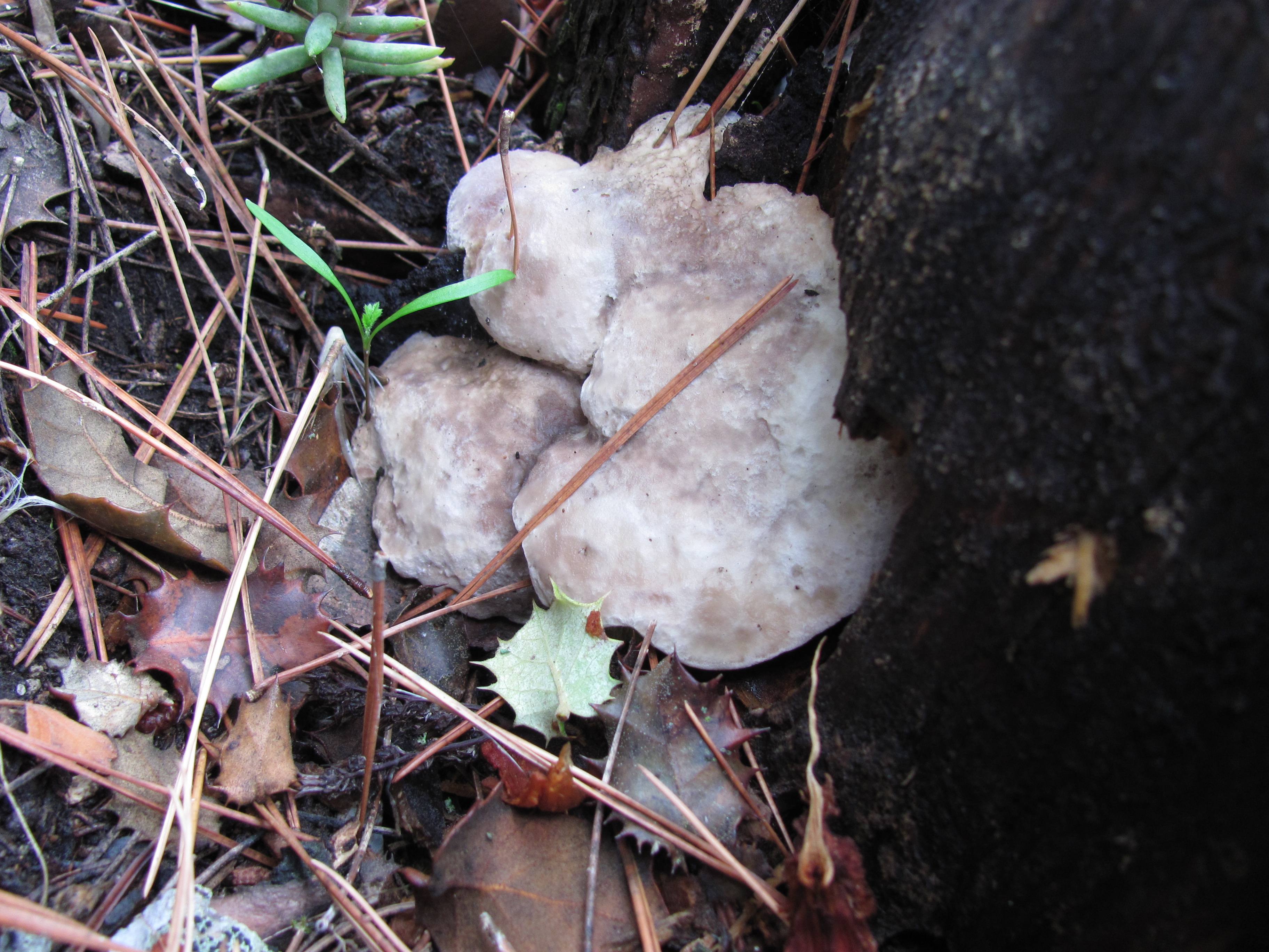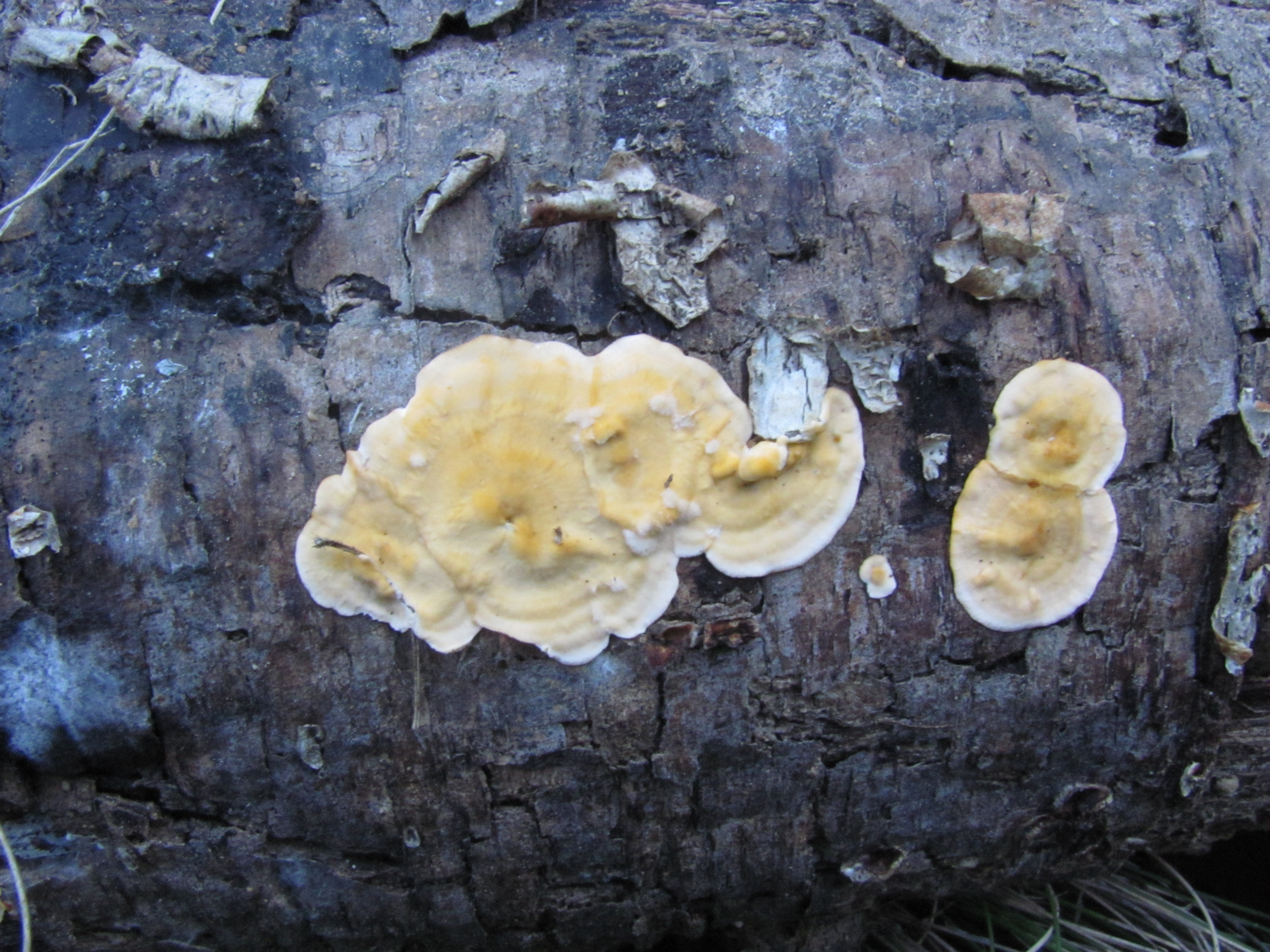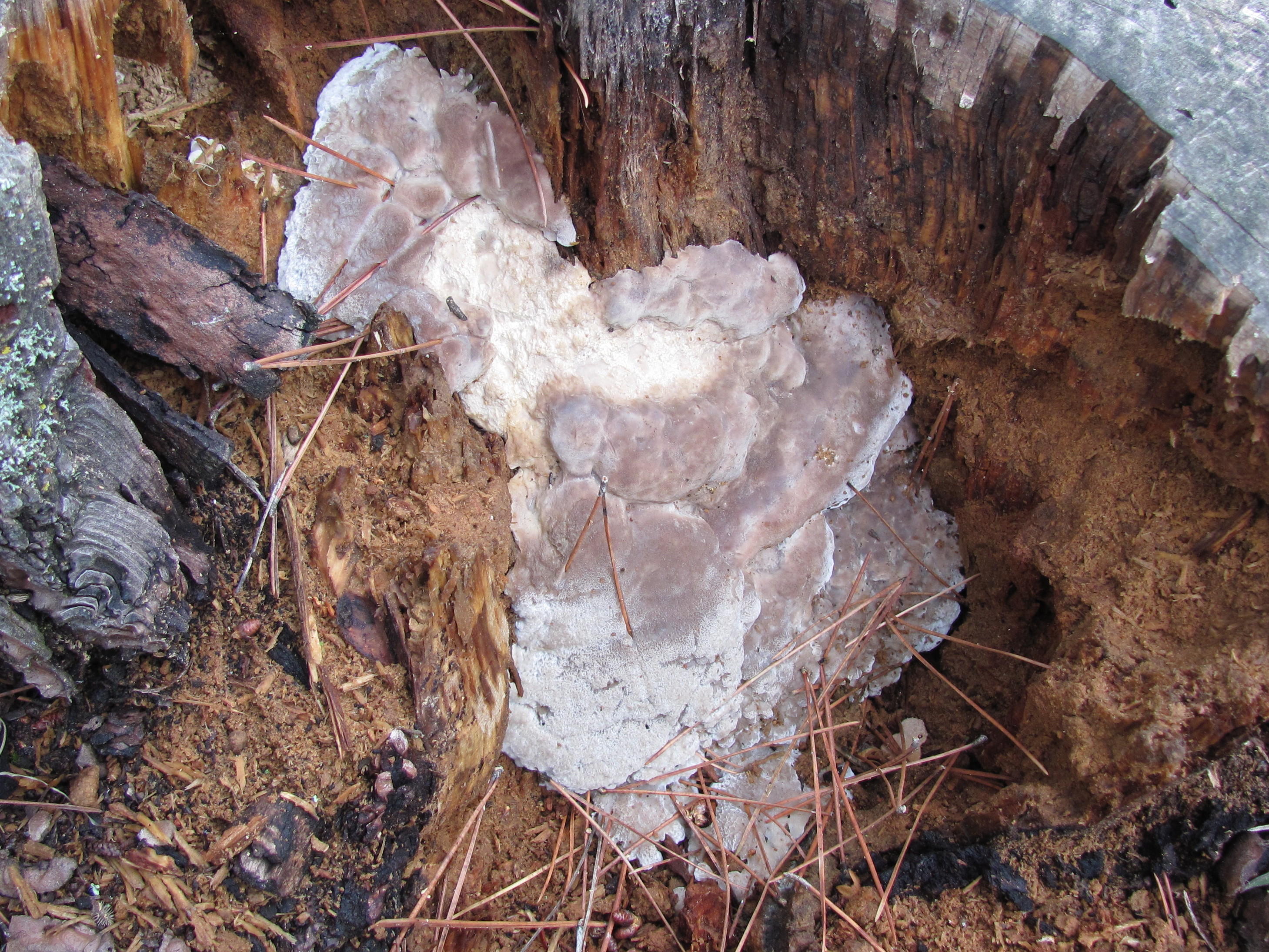 esta otra en tronco de pino en descomposición de color blanco a gris le encuentro un parecido al genero Hydnellum ,al estar lloviendo esa misma tarde no se si exudaba algunas jotas ,alguna idea?