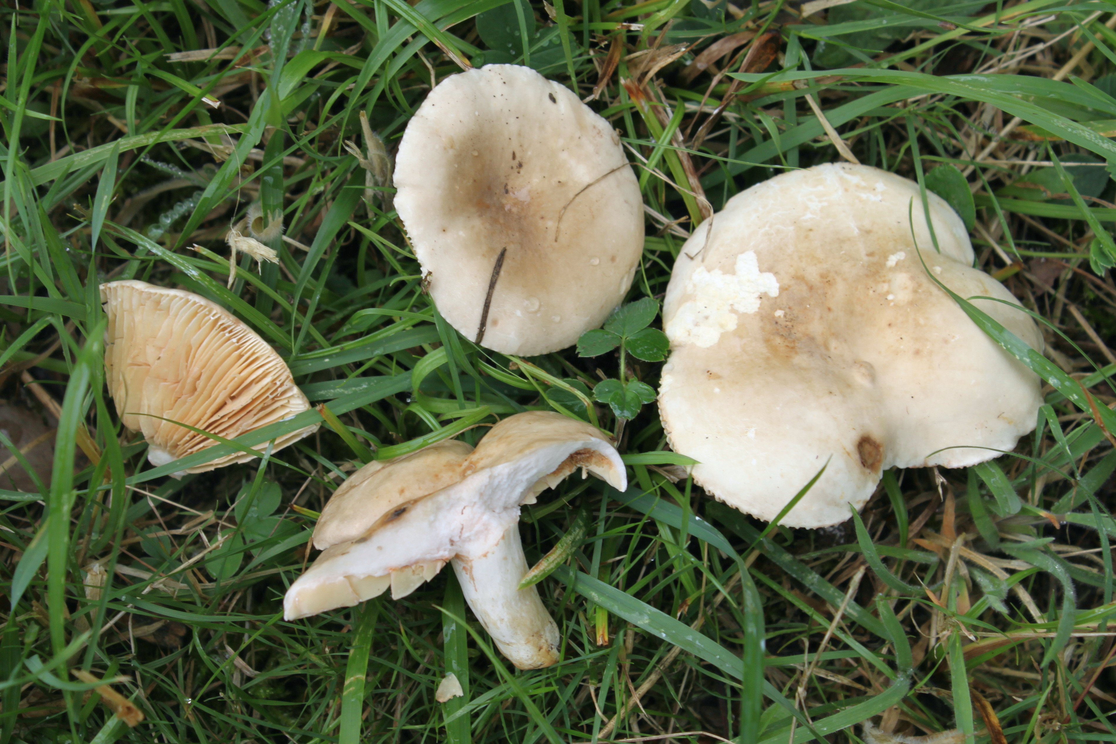 En claro herboso, junto a robles. Sombreros entre 5 y 8 cm, no zonados, de color crema rosado claro y beige blancuzco. Pie corto, cilíndrico, blanco. Láminas de color beige rosáceo. Látex blanco. Sabor acre o picante.