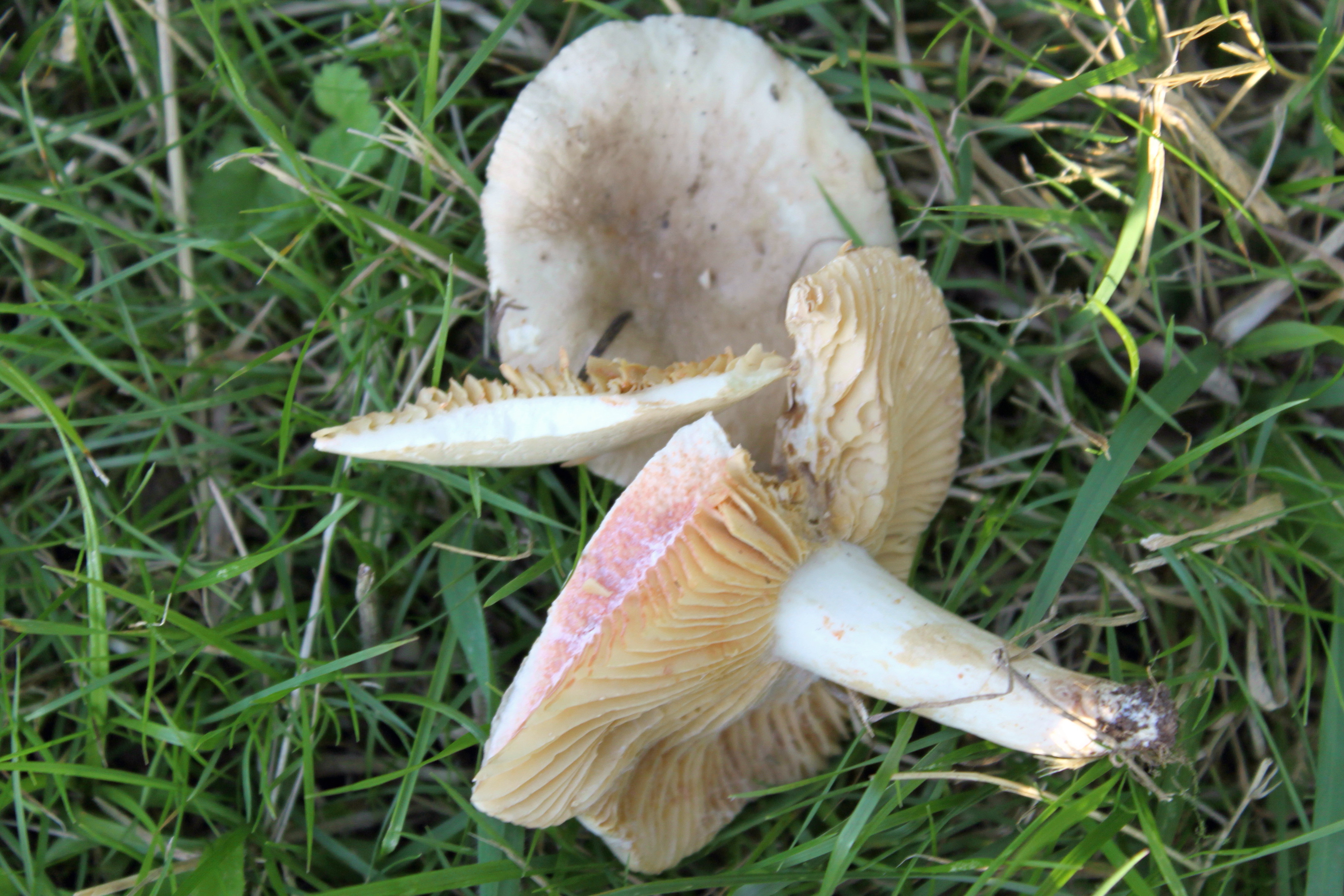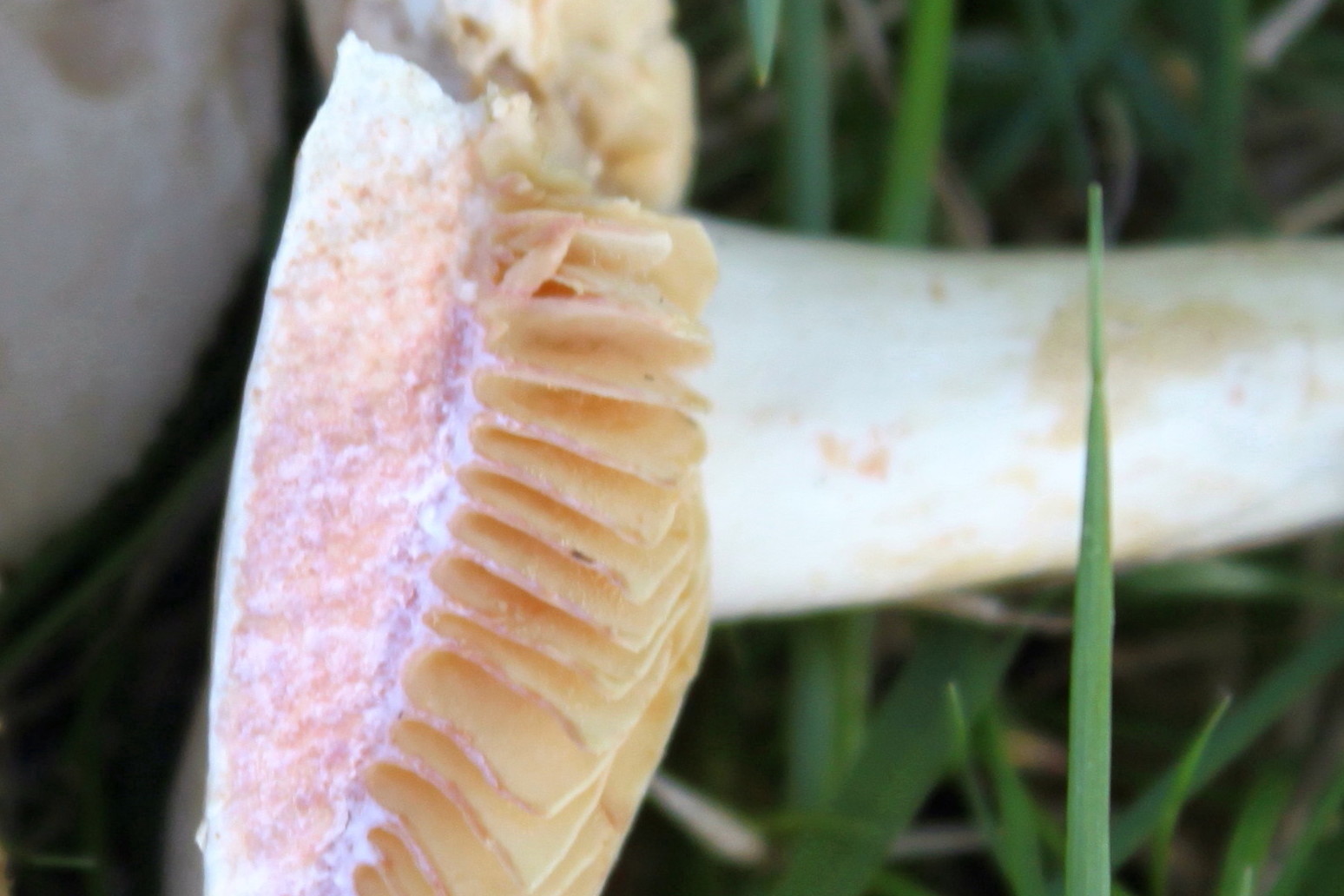 Pasados unos minutos, el color del látex sobre el pañuelo seguía sin alterarse. Sin embargo, la carne de la seta cortada había tomado tonos rosados, que se hacían cada vez más fuertes según pasaba el tiempo. Véase la diferencia de color entre un trozo recién cortado y otro que llevaría ya unos 5 minutos.