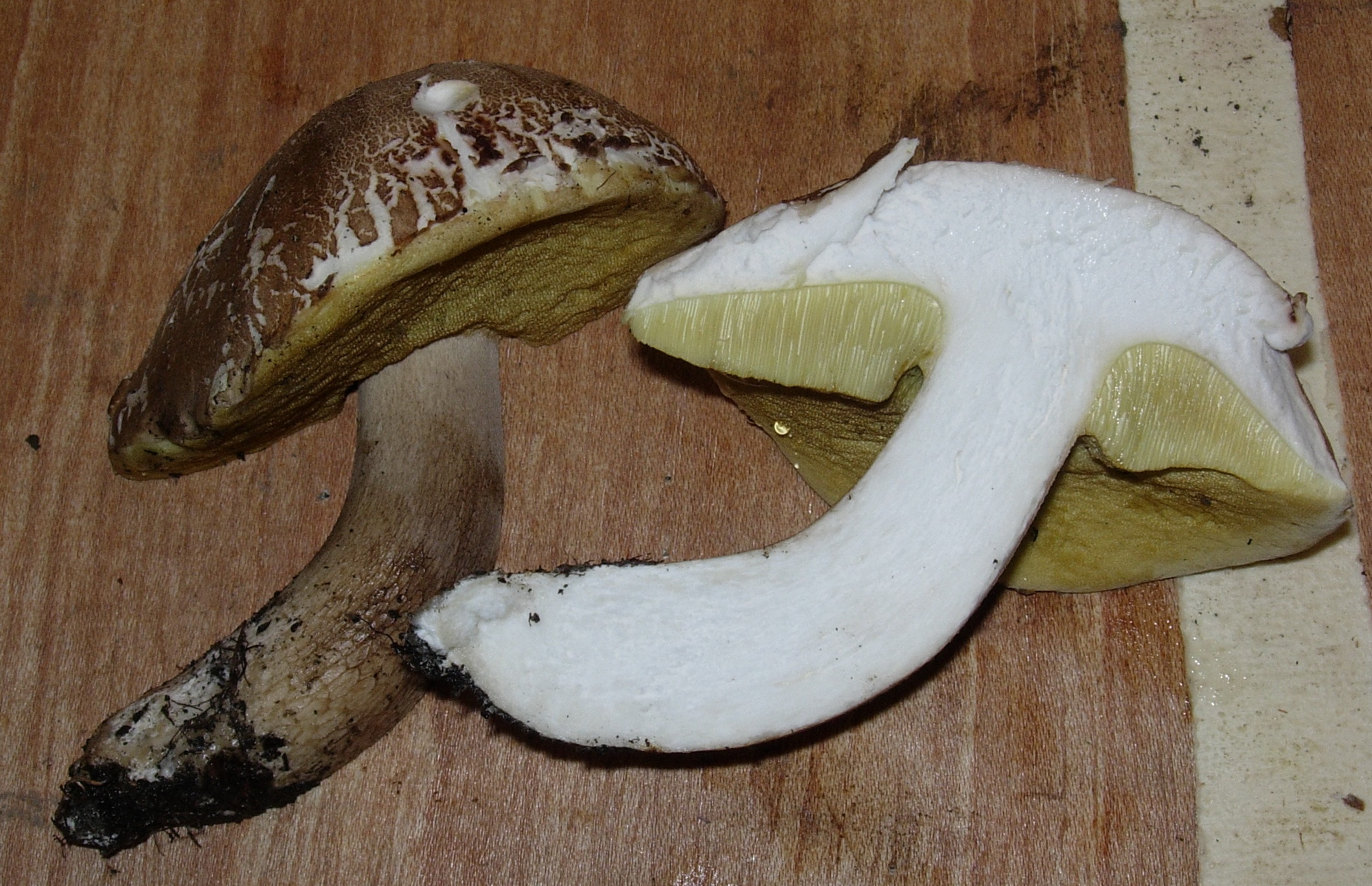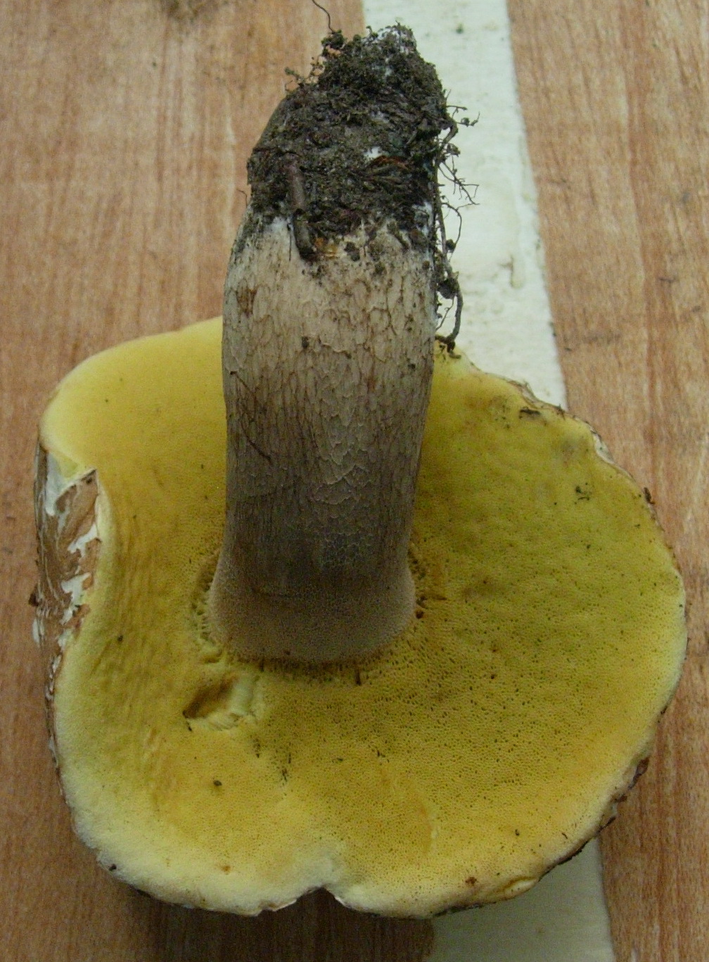De 10 cm de sombrero, algo cuarteado pero integro, pie de 12 cm con un reticulado claro. Los tubulos amarillos, el olor suave fungico, la carne blanca que no cambia al corte, de sabor suave y agradable, compacta.