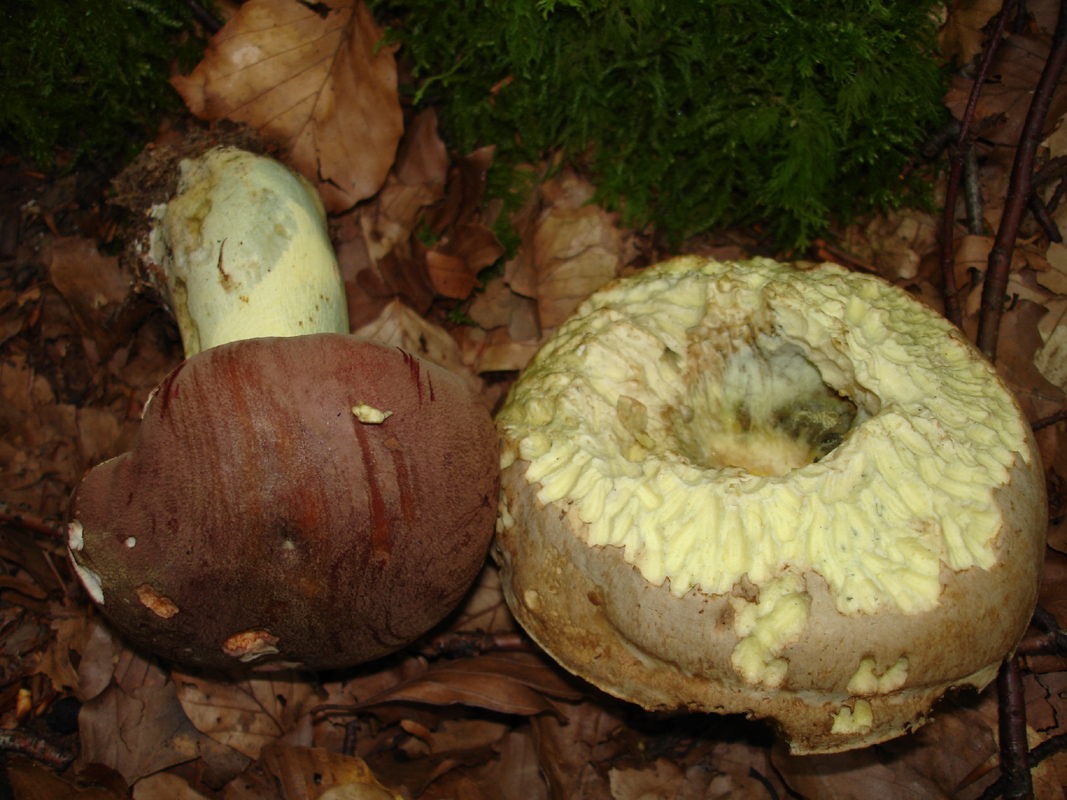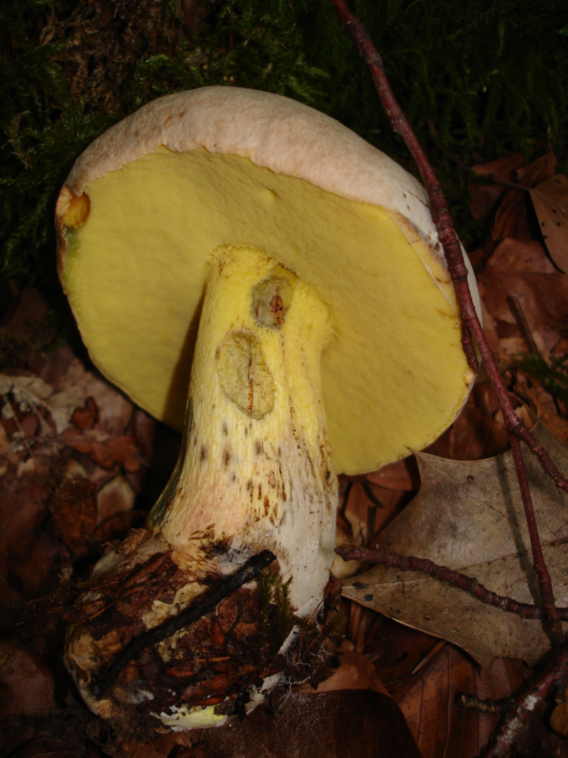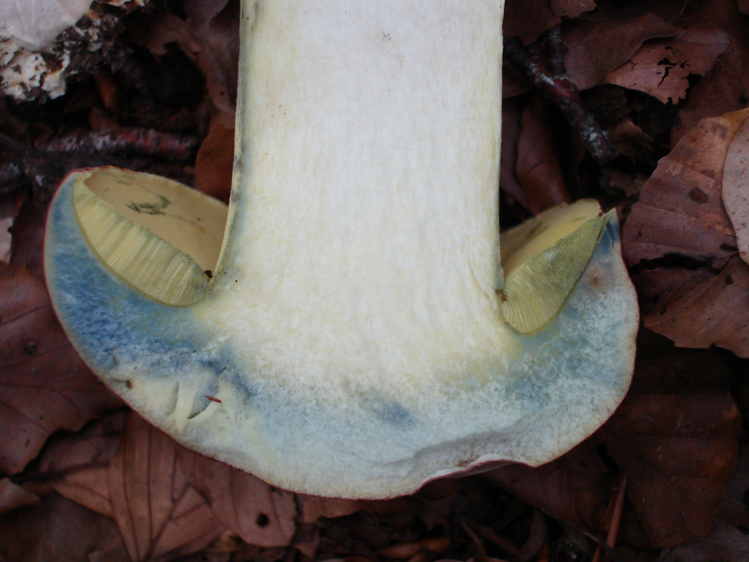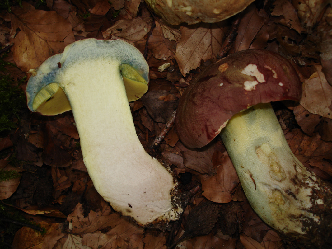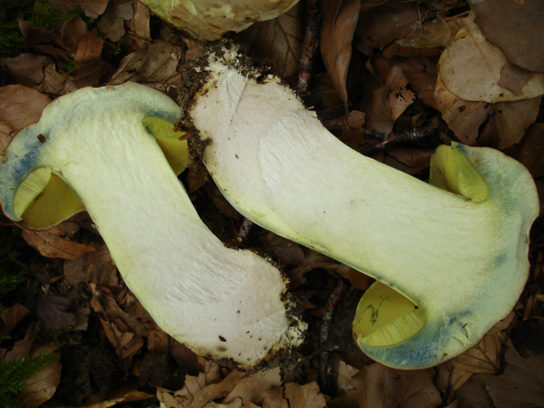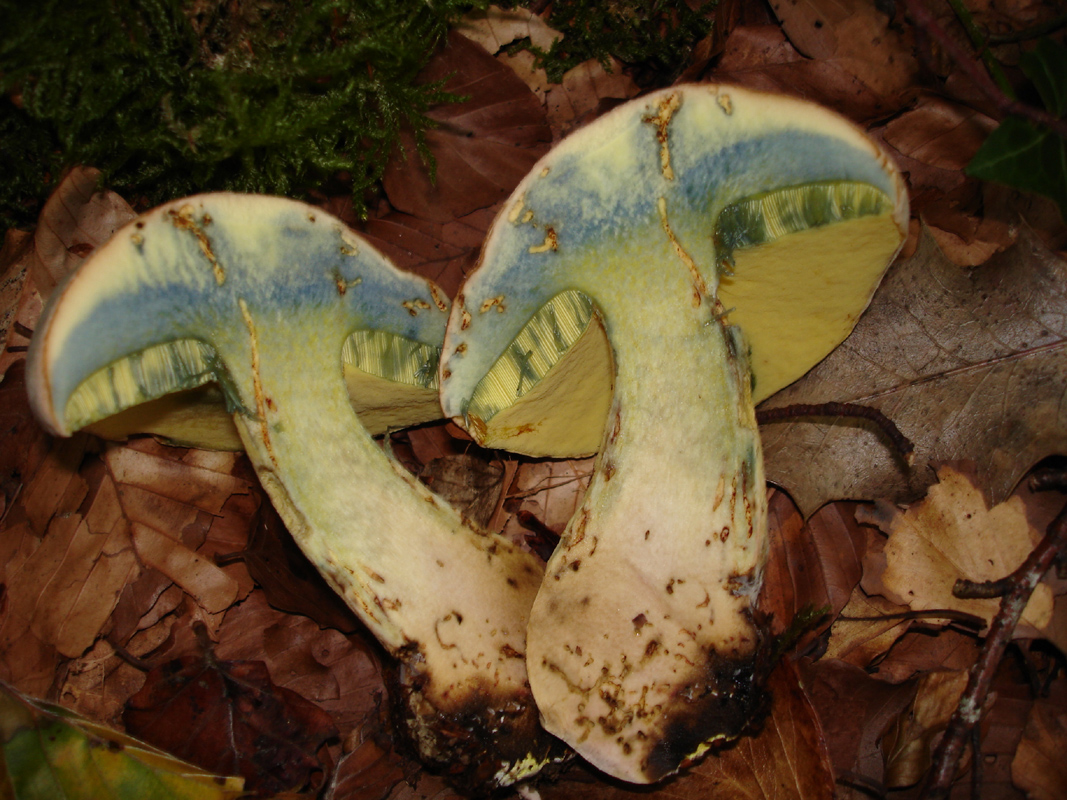 Este fin de semana he estado paseando por un hayedo y aunque está todavía muy seco si han empezado a aparecer algunos boletos. Como siempre que encuentro boletos de poros, tubos y pié amarillos, con carne virante al azul-verdoso tengo dudas y más en este caso que aparecían juntos dos con características similares pero con cutículas diferentes, marrón oscura y crema claro -ambas con tonos rojizos-. El olor en ambos casos era agradable.