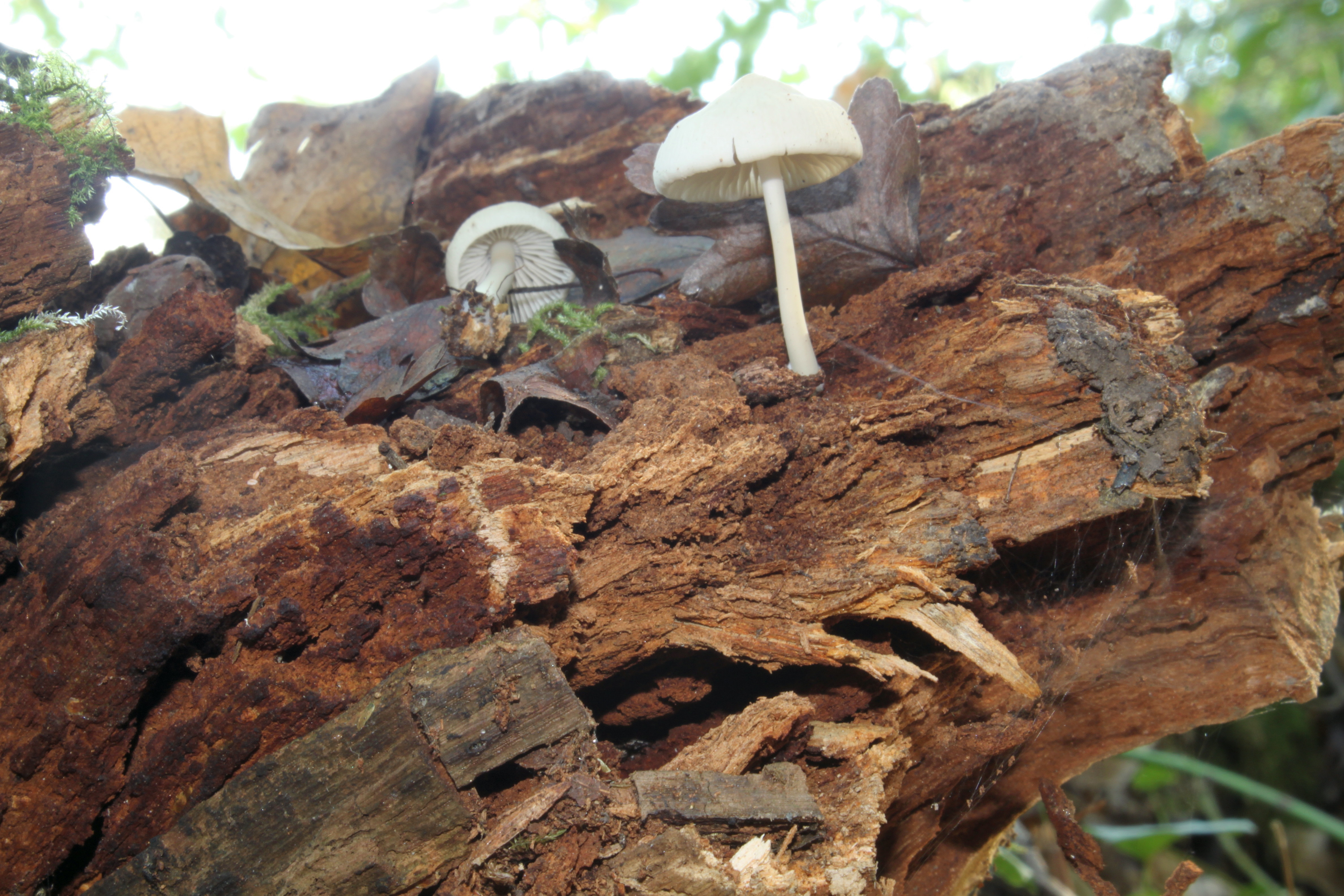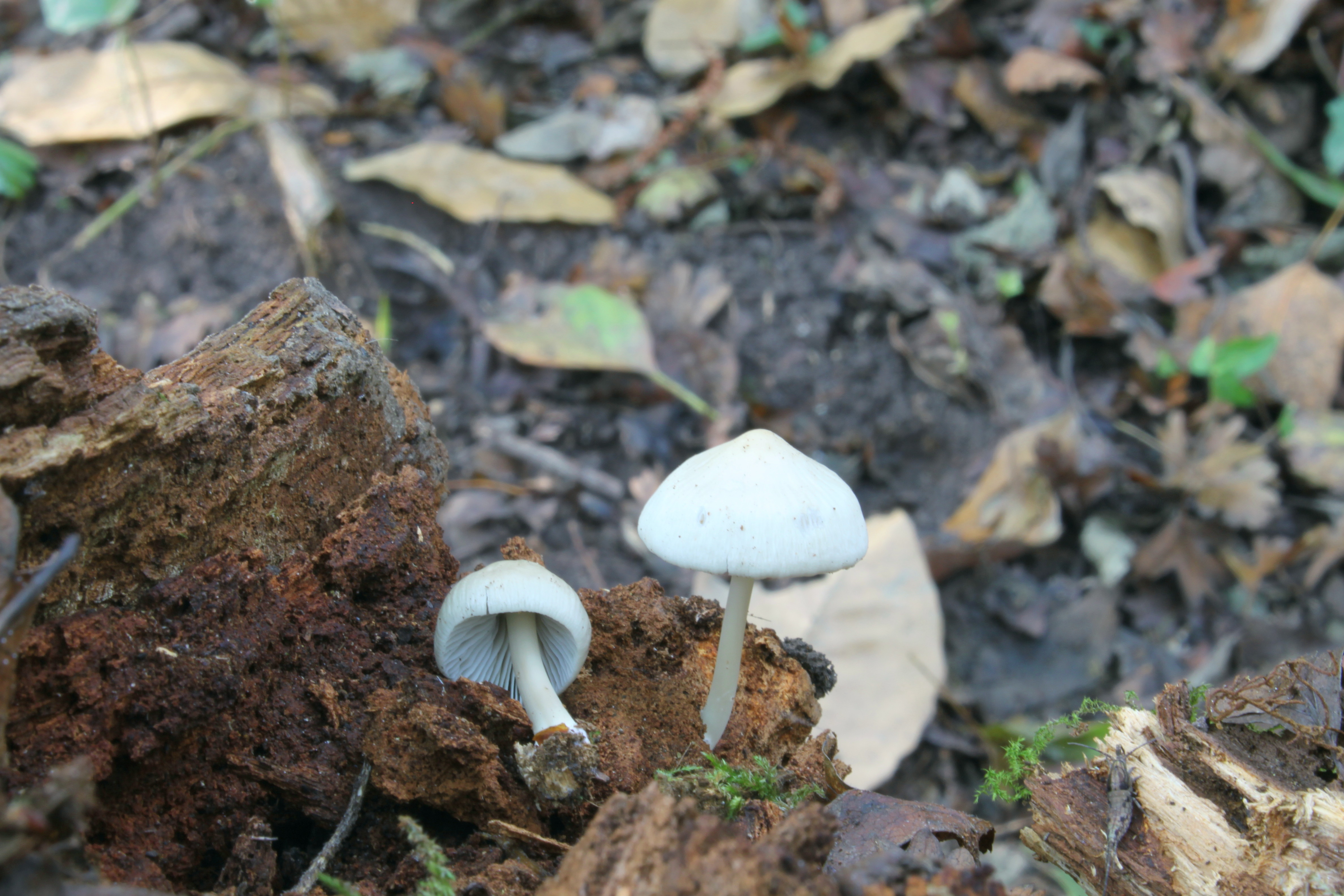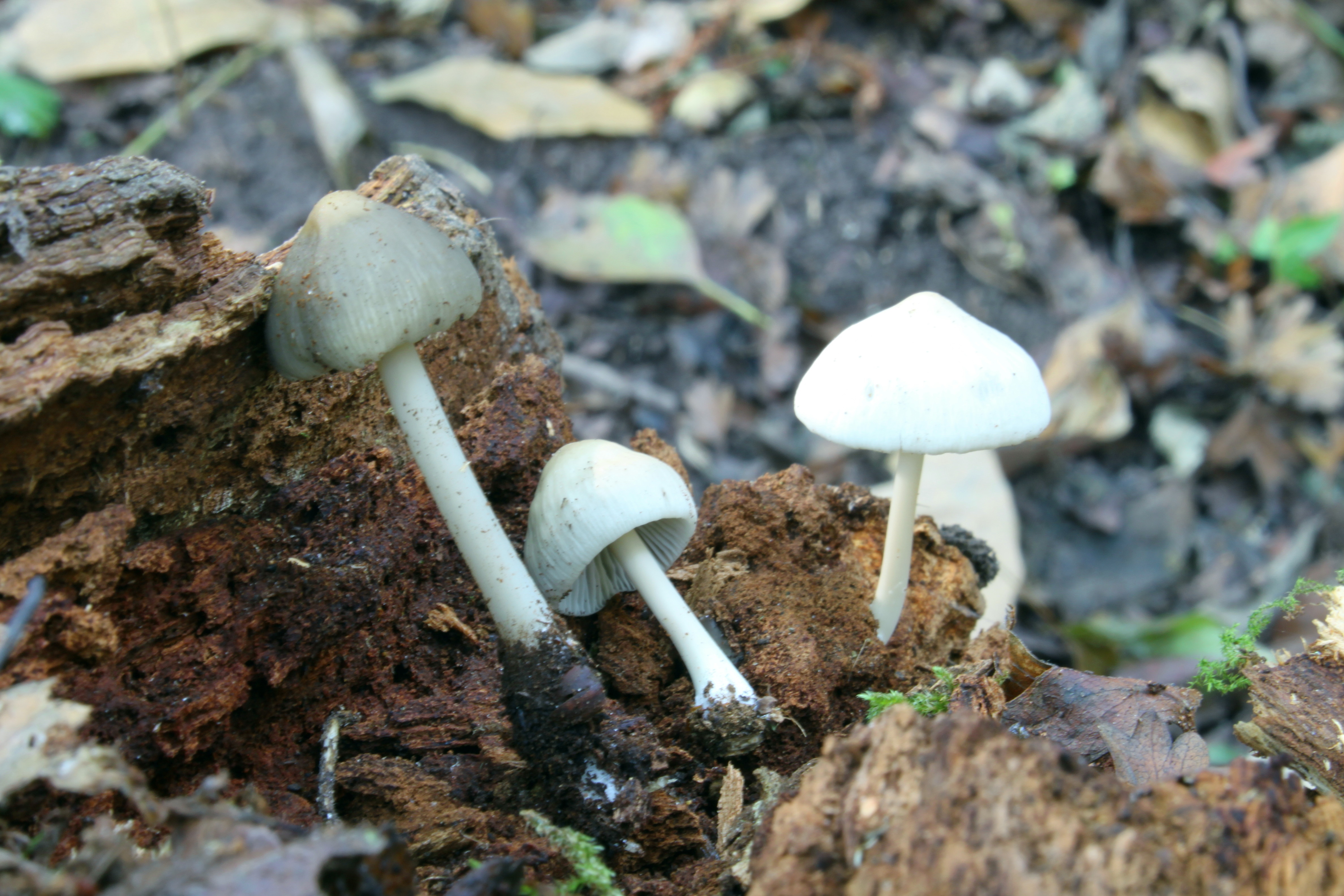 Encontré, estos tres ejemplares que presento, sobre una rama en descomposición. Sombrero de unos 3 cm de diámetro, acampanulado y umbonado, oscilando su color del blanco impoluto al gris pardusco, según su grado de maduración. Margen estriado, característica que era más visible en el ejemplar más maduro. Láminas blancas, oscureciéndose. Pie esbelto, blanco, engrosado en la base. Sin olor u olor débil.