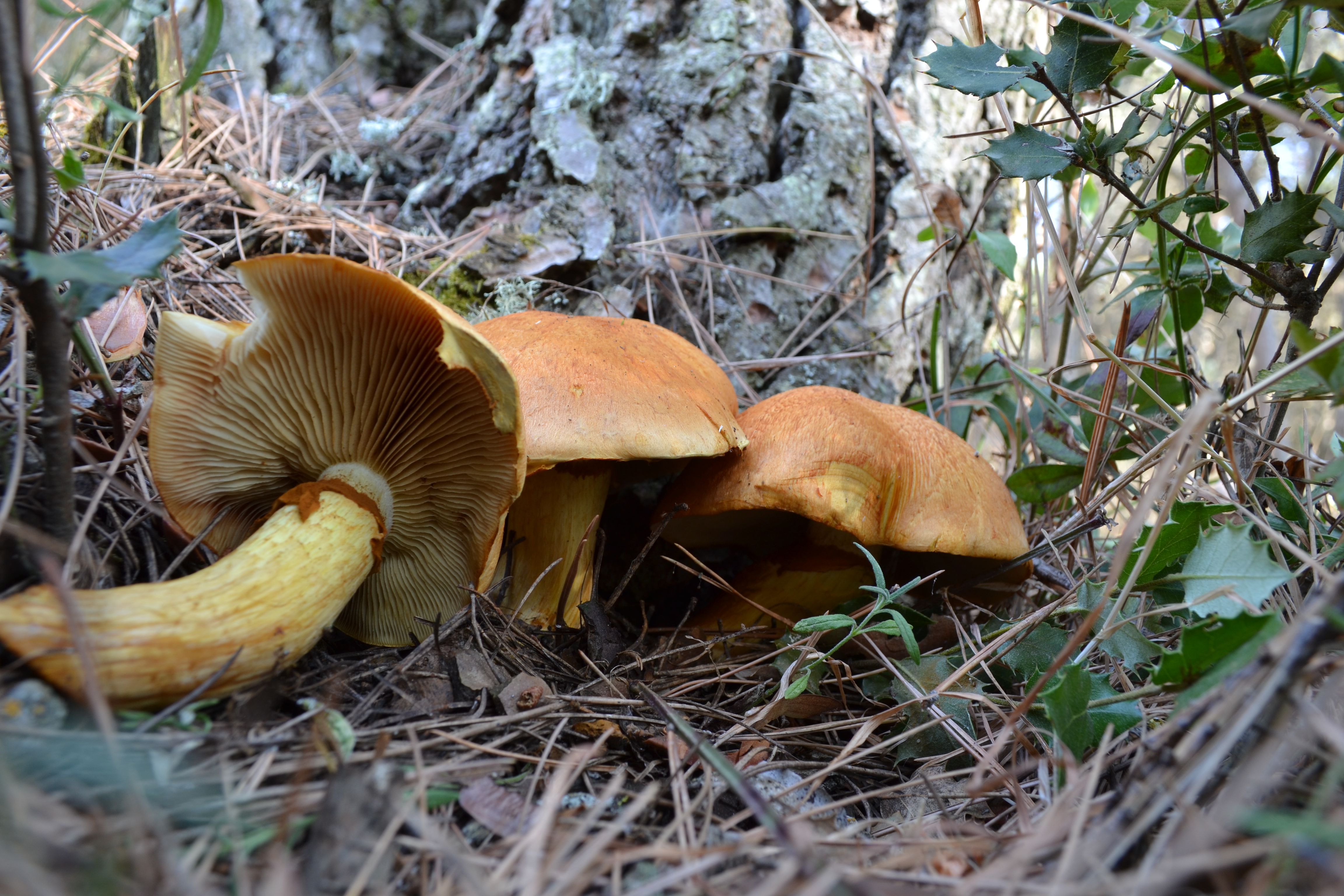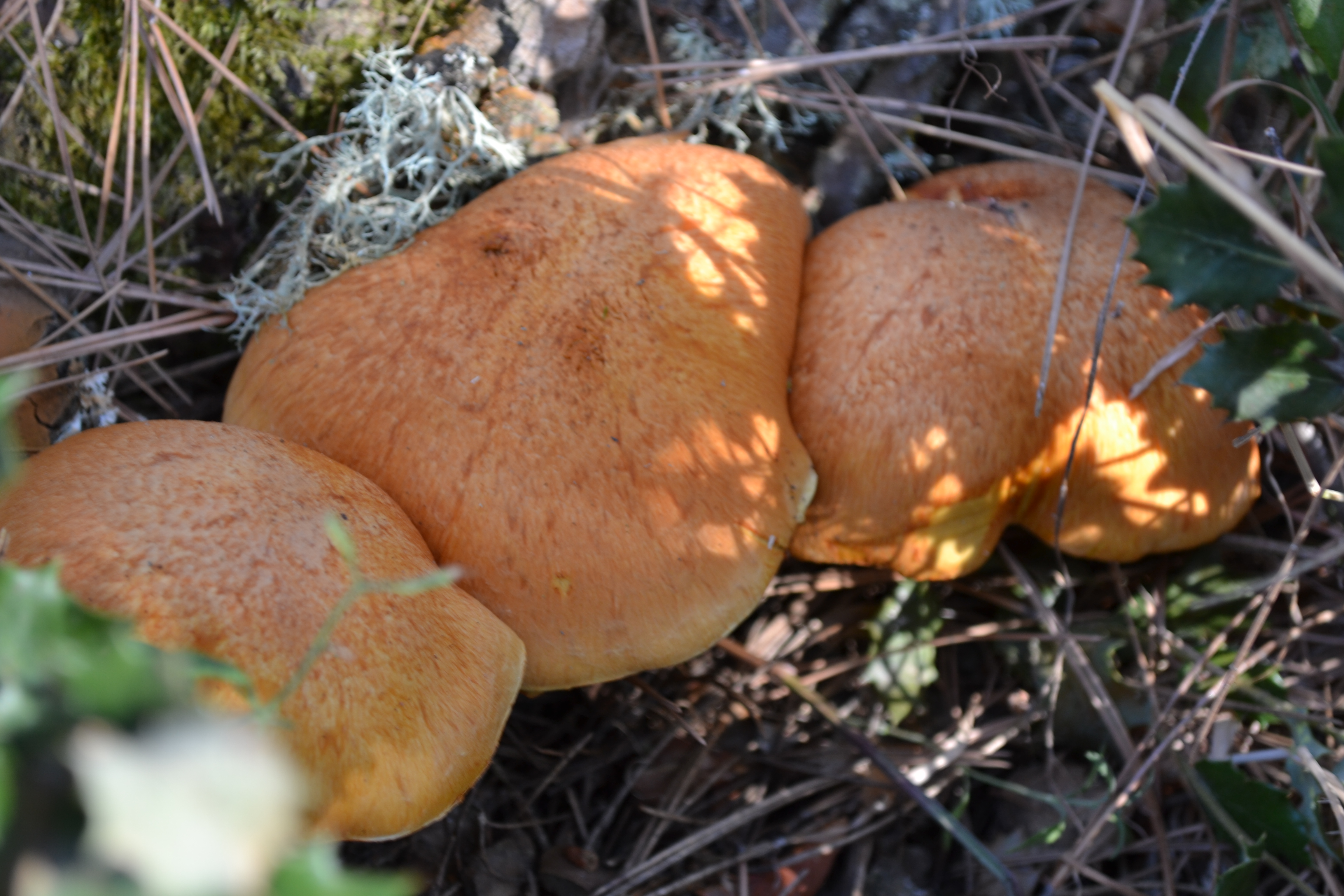 buenas ,sobre tronco de pino seco ,sombrero de color naranja un poco aterciopelado ,