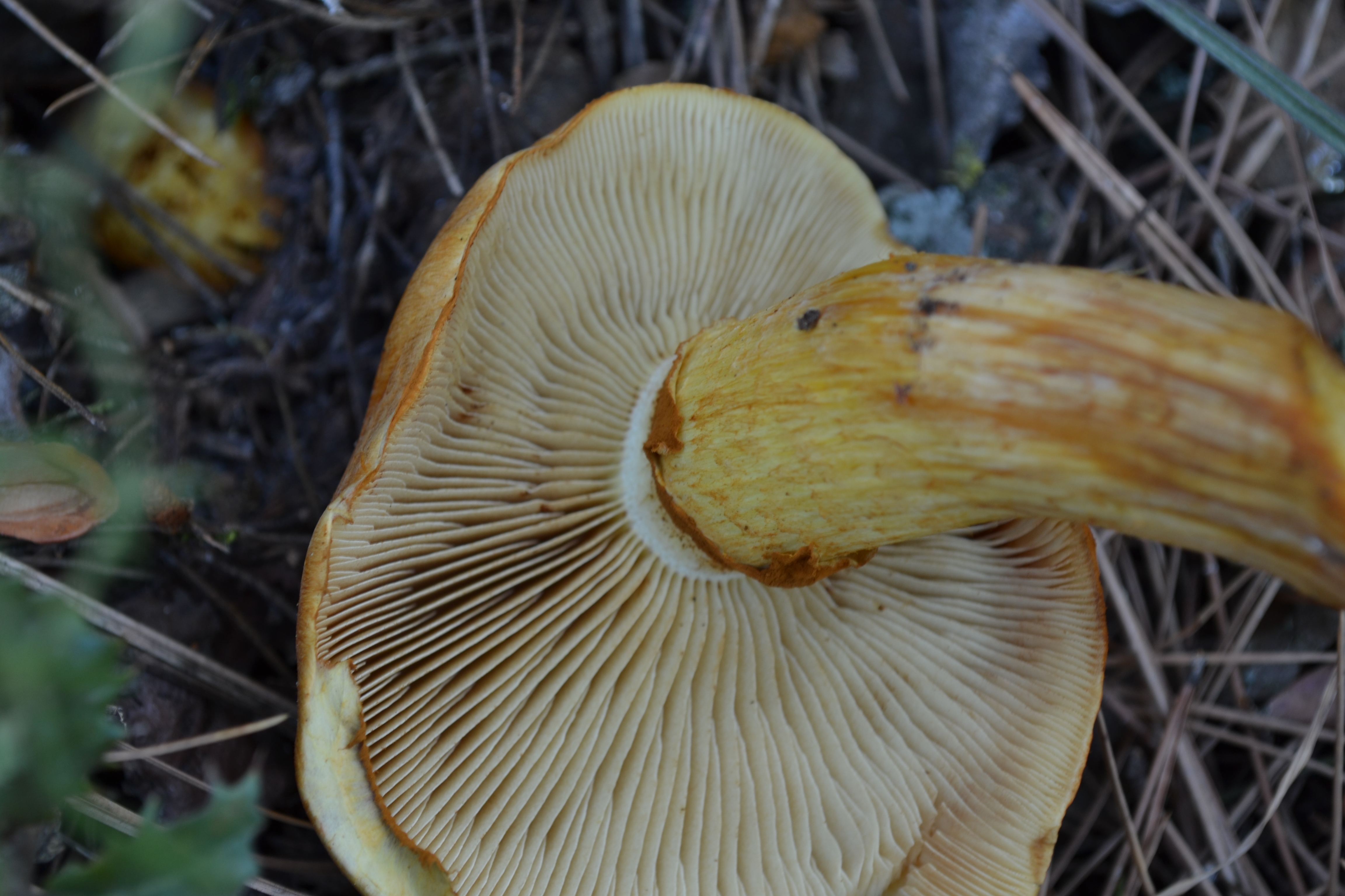 laminas de amarillo en ejemplares desarrollados al blanco pálido en ejemplares jóvenes,pie fibroso ,con anillo color amarillo como el pie,la zona que da al hinmenio herrumbroso,